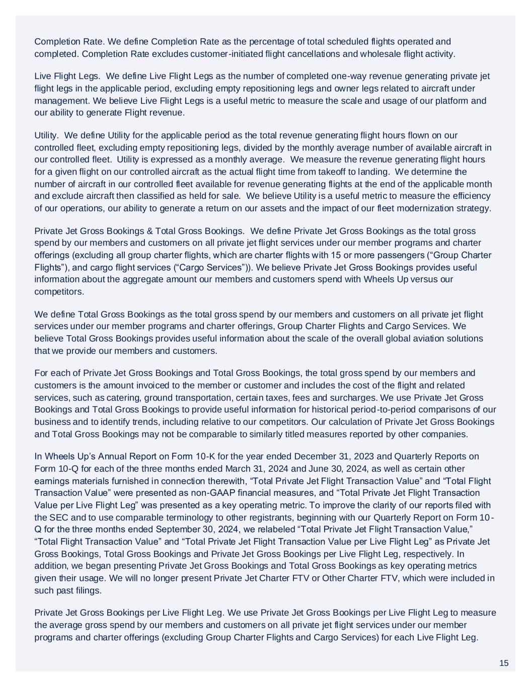15 Completion Rate. We define Completion Rate as the percentage of total scheduled flights operated and completed. Completion Rate excludes customer-initiated flight cancellations and wholesale flight activity. Live Flight Legs. We define Live Flight Legs as the number of completed one-way revenue generating private jet flight legs in the applicable period, excluding empty repositioning legs and owner legs related to aircraft under management. We believe Live Flight Legs is a useful metric to measure the scale and usage of our platform and our ability to generate Flight revenue. Utility. We define Utility for the applicable period as the total revenue generating flight hours flown on our controlled fleet, excluding empty repositioning legs, divided by the monthly average number of available aircraft in our controlled fleet. Utility is expressed as a monthly average. We measure the revenue generating flight hours for a given flight on our controlled aircraft as the actual flight time from takeoff to landing. We determine the number of aircraft in our controlled fleet available for revenue generating flights at the end of the applicable month and exclude aircraft then classified as held for sale. We believe Utility is a useful metric to measure the efficiency of our operations, our ability to generate a return on our assets and the impact of our fleet modernization strategy. Private Jet Gross Bookings & Total Gross Bookings. We define Private Jet Gross Bookings as the total gross spend by our members and customers on all private jet flight services under our member programs and charter offerings (excluding all group charter flights, which are charter flights with 15 or more passengers (“Group Charter Flights”), and cargo flight services (“Cargo Services”)). We believe Private Jet Gross Bookings provides useful information about the aggregate amount our members and customers spend with Wheels Up versus our competitors. We define Total Gross Bookings as the total gross spend by our members and customers on all private jet flight services under our member programs and charter offerings, Group Charter Flights and Cargo Services. We believe Total Gross Bookings provides useful information about the scale of the overall global aviation solutions that we provide our members and customers. For each of Private Jet Gross Bookings and Total Gross Bookings, the total gross spend by our members and customers is the amount invoiced to the member or customer and includes the cost of the flight and related services, such as catering, ground transportation, certain taxes, fees and surcharges. We use Private Jet Gross Bookings and Total Gross Bookings to provide useful information for historical period-to-period comparisons of our business and to identify trends, including relative to our competitors. Our calculation of Private Jet Gross Bookings and Total Gross Bookings may not be comparable to similarly titled measures reported by other companies. In Wheels Up’s Annual Report on Form 10-K for the year ended December 31, 2023 and Quarterly Reports on Form 10-Q for each of the three months ended March 31, 2024 and June 30, 2024, as well as certain other earnings materials furnished in connection therewith, “Total Private Jet Flight Transaction Value” and “Total Flight Transaction Value” were presented as non-GAAP financial measures, and “Total Private Jet Flight Transaction Value per Live Flight Leg” was presented as a key operating metric. To improve the clarity of our reports filed with the SEC and to use comparable terminology to other registrants, beginning with our Quarterly Report on Form 10 - Q for the three months ended September 30, 2024, we relabeled “Total Private Jet Flight Transaction Value,” “Total Flight Transaction Value” and “Total Private Jet Flight Transaction Value per Live Flight Leg” as Private Jet Gross Bookings, Total Gross Bookings and Private Jet Gross Bookings per Live Flight Leg, respectively. In addition, we began presenting Private Jet Gross Bookings and Total Gross Bookings as key operating metrics given their usage. We will no longer present Private Jet Charter FTV or Other Charter FTV, which were included in such past filings. Private Jet Gross Bookings per Live Flight Leg. We use Private Jet Gross Bookings per Live Flight Leg to measure the average gross spend by our members and customers on all private jet flight services under our member programs and charter offerings (excluding Group Charter Flights and Cargo Services) for each Live Flight Leg. 15