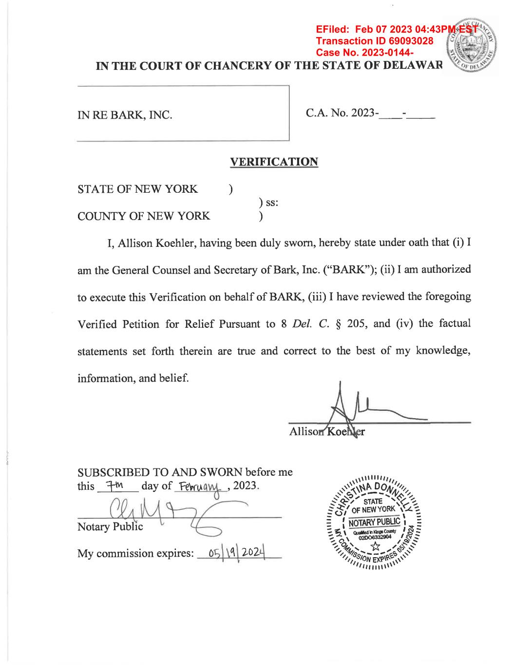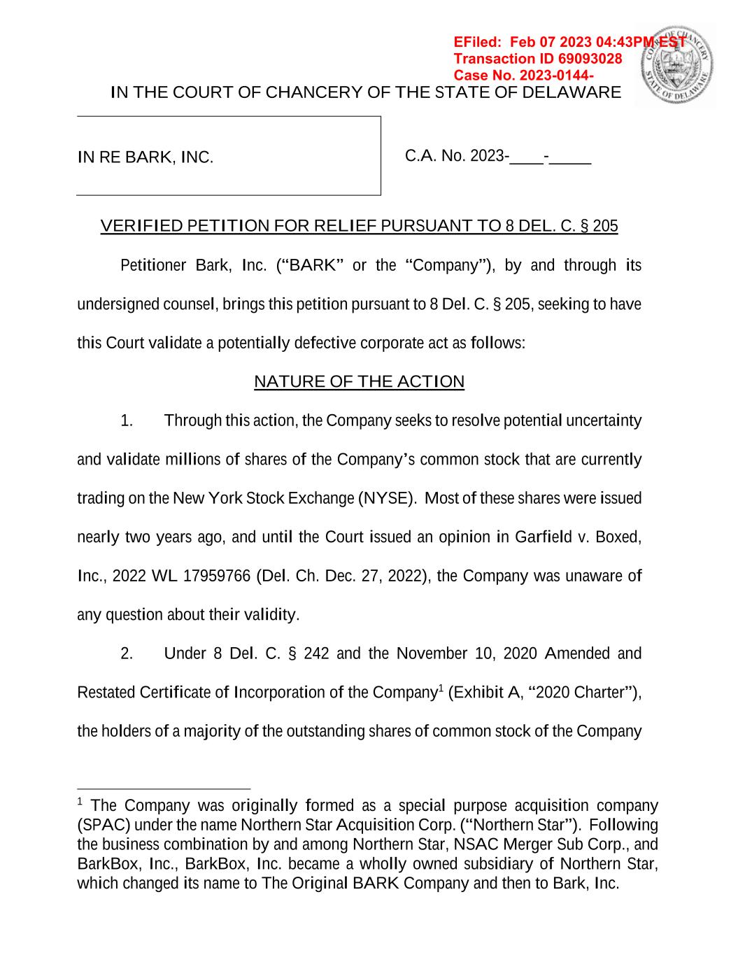 IN THE COURT OF CHANCERY OF THE STATE OF DELAWARE IN RE BARK, INC. C.A. No. 2023-____-_____ VERIFIED PETITION FOR RELIEF PURSUANT TO 8 DEL. C. § 205 Petitioner Bark, Inc. (“BARK” or the “Company”), by and through its undersigned counsel, brings this petition pursuant to 8 Del. C. § 205, seeking to have this Court validate a potentially defective corporate act as follows: NATURE OF THE ACTION 1. Through this action, the Company seeks to resolve potential uncertainty and validate millions of shares of the Company’s common stock that are currently trading on the New York Stock Exchange (NYSE). Most of these shares were issued nearly two years ago, and until the Court issued an opinion in Garfield v. Boxed, Inc., 2022 WL 17959766 (Del. Ch. Dec. 27, 2022), the Company was unaware of any question about their validity. 2. Under 8 Del. C. § 242 and the November 10, 2020 Amended and Restated Certificate of Incorporation of the Company1 (Exhibit A, “2020 Charter”), the holders of a majority of the outstanding shares of common stock of the Company 1 The Company was originally formed as a special purpose acquisition company (SPAC) under the name Northern Star Acquisition Corp. (“Northern Star”). Following the business combination by and among Northern Star, NSAC Merger Sub Corp., and BarkBox, Inc., BarkBox, Inc. became a wholly owned subsidiary of Northern Star, which changed its name to The Original BARK Company and then to Bark, Inc. EFiled: Feb 07 2023 04:43PM EST Transaction ID 69093028 Case No. 2023-0144-