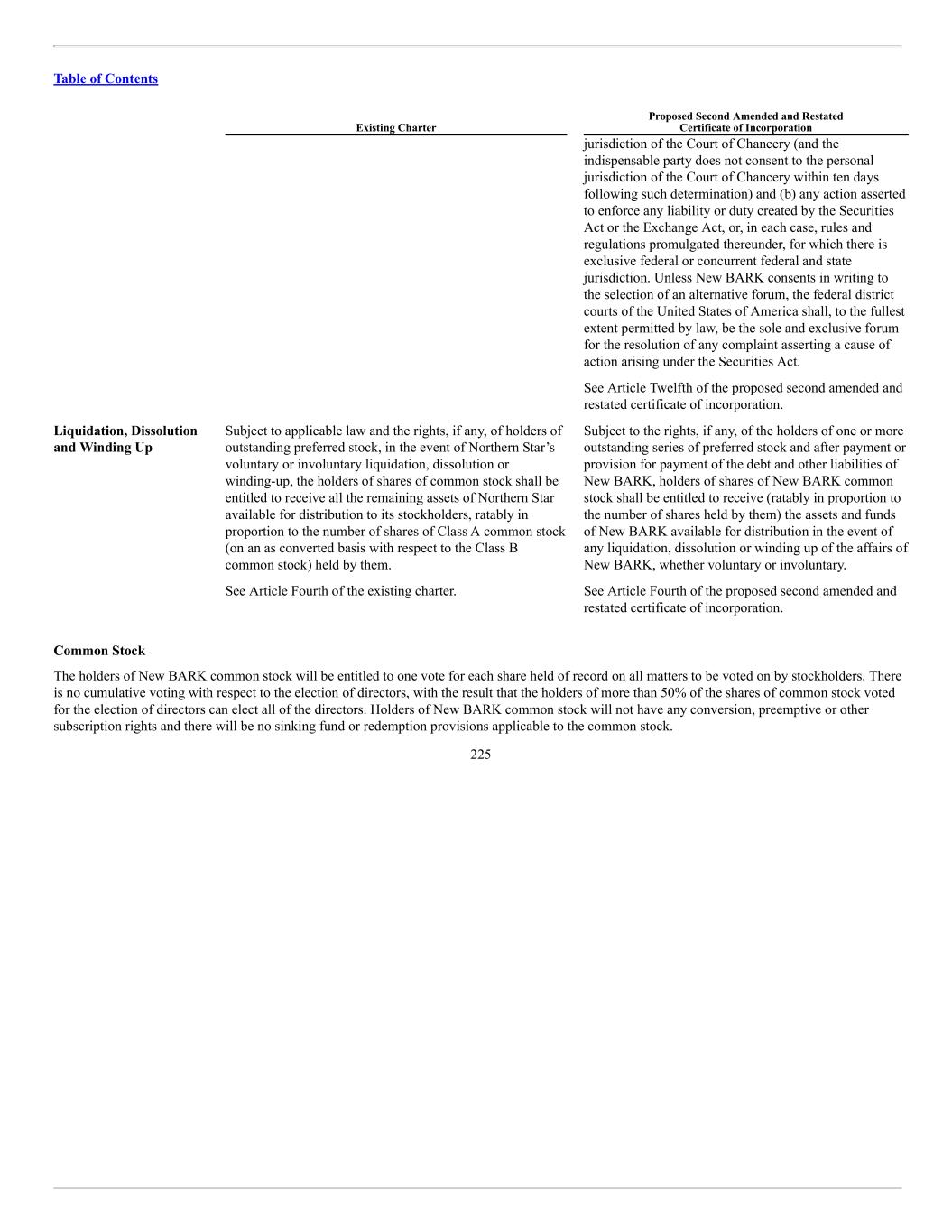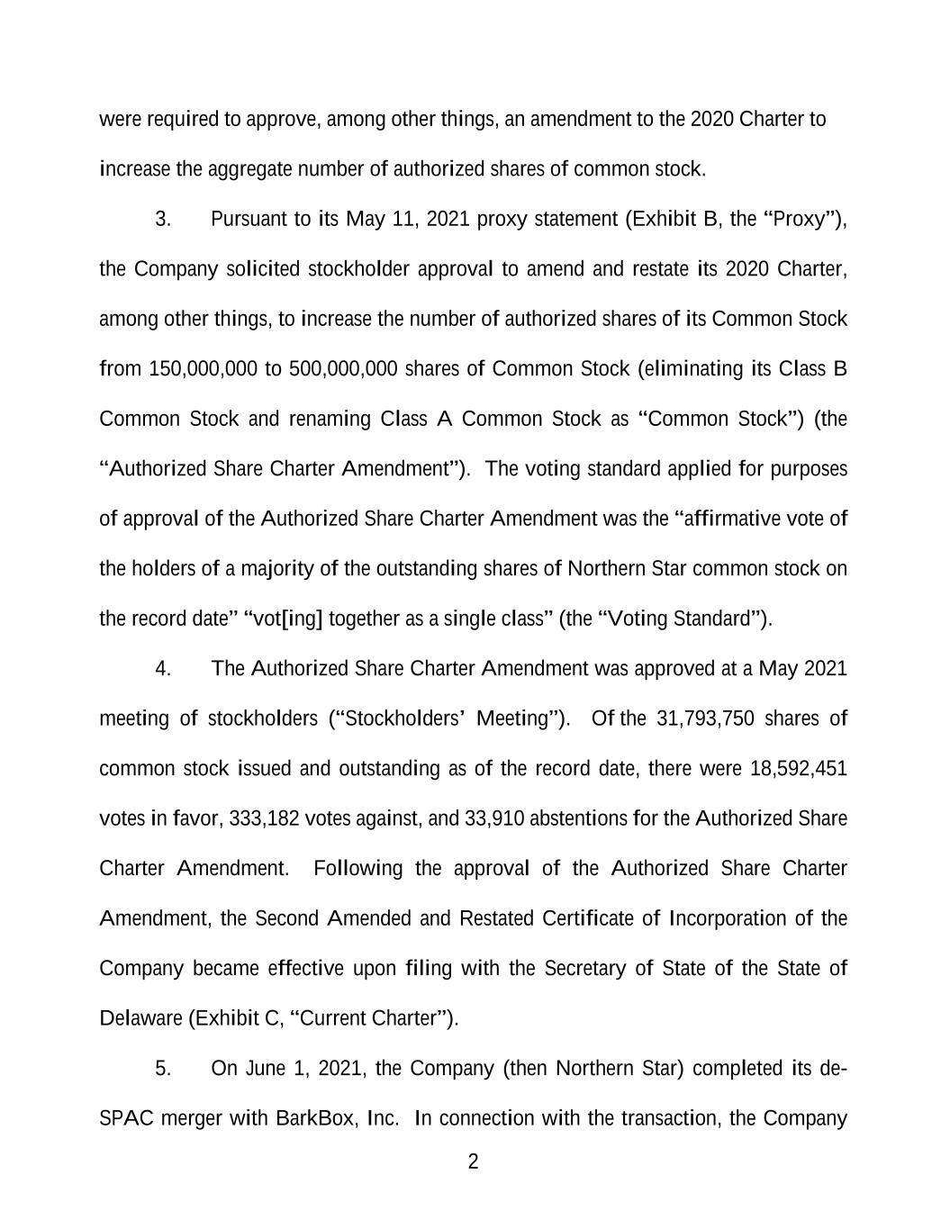 2 were required to approve, among other things, an amendment to the 2020 Charter to increase the aggregate number of authorized shares of common stock. 3. Pursuant to its May 11, 2021 proxy statement (Exhibit B, the “Proxy”), the Company solicited stockholder approval to amend and restate its 2020 Charter, among other things, to increase the number of authorized shares of its Common Stock from 150,000,000 to 500,000,000 shares of Common Stock (eliminating its Class B Common Stock and renaming Class A Common Stock as “Common Stock”) (the “Authorized Share Charter Amendment”). The voting standard applied for purposes of approval of the Authorized Share Charter Amendment was the “affirmative vote of the holders of a majority of the outstanding shares of Northern Star common stock on the record date” “vot[ing] together as a single class” (the “Voting Standard”). 4. The Authorized Share Charter Amendment was approved at a May 2021 meeting of stockholders (“Stockholders’ Meeting”). Of the 31,793,750 shares of common stock issued and outstanding as of the record date, there were 18,592,451 votes in favor, 333,182 votes against, and 33,910 abstentions for the Authorized Share Charter Amendment. Following the approval of the Authorized Share Charter Amendment, the Second Amended and Restated Certificate of Incorporation of the Company became effective upon filing with the Secretary of State of the State of Delaware (Exhibit C, “Current Charter”). 5. On June 1, 2021, the Company (then Northern Star) completed its de- SPAC merger with BarkBox, Inc. In connection with the transaction, the Company