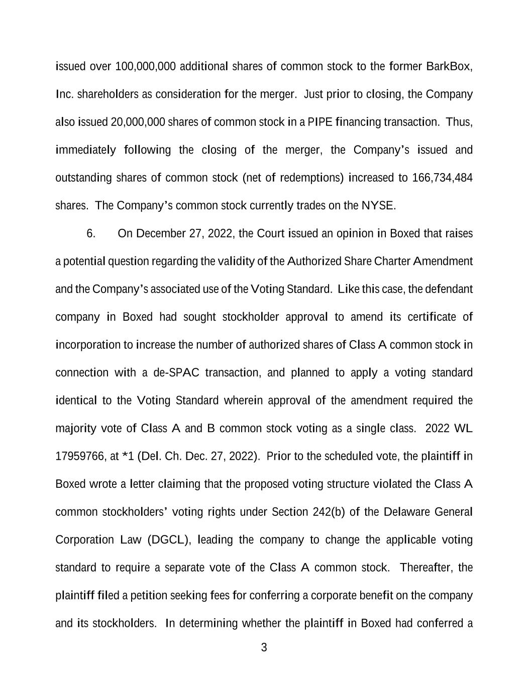 3 issued over 100,000,000 additional shares of common stock to the former BarkBox, Inc. shareholders as consideration for the merger. Just prior to closing, the Company also issued 20,000,000 shares of common stock in a PIPE financing transaction. Thus, immediately following the closing of the merger, the Company’s issued and outstanding shares of common stock (net of redemptions) increased to 166,734,484 shares. The Company’s common stock currently trades on the NYSE. 6. On December 27, 2022, the Court issued an opinion in Boxed that raises a potential question regarding the validity of the Authorized Share Charter Amendment and the Company’s associated use of the Voting Standard. Like this case, the defendant company in Boxed had sought stockholder approval to amend its certificate of incorporation to increase the number of authorized shares of Class A common stock in connection with a de-SPAC transaction, and planned to apply a voting standard identical to the Voting Standard wherein approval of the amendment required the majority vote of Class A and B common stock voting as a single class. 2022 WL 17959766, at *1 (Del. Ch. Dec. 27, 2022). Prior to the scheduled vote, the plaintiff in Boxed wrote a letter claiming that the proposed voting structure violated the Class A common stockholders’ voting rights under Section 242(b) of the Delaware General Corporation Law (DGCL), leading the company to change the applicable voting standard to require a separate vote of the Class A common stock. Thereafter, the plaintiff filed a petition seeking fees for conferring a corporate benefit on the company and its stockholders. In determining whether the plaintiff in Boxed had conferred a