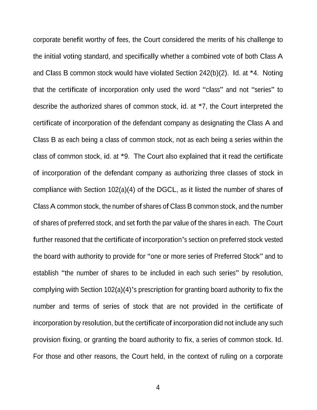 4 corporate benefit worthy of fees, the Court considered the merits of his challenge to the initial voting standard, and specifically whether a combined vote of both Class A and Class B common stock would have violated Section 242(b)(2). Id. at *4. Noting that the certificate of incorporation only used the word “class” and not “series” to describe the authorized shares of common stock, id. at *7, the Court interpreted the certificate of incorporation of the defendant company as designating the Class A and Class B as each being a class of common stock, not as each being a series within the class of common stock, id. at *9. The Court also explained that it read the certificate of incorporation of the defendant company as authorizing three classes of stock in compliance with Section 102(a)(4) of the DGCL, as it listed the number of shares of Class A common stock, the number of shares of Class B common stock, and the number of shares of preferred stock, and set forth the par value of the shares in each. The Court further reasoned that the certificate of incorporation’s section on preferred stock vested the board with authority to provide for “one or more series of Preferred Stock” and to establish “the number of shares to be included in each such series” by resolution, complying with Section 102(a)(4)’s prescription for granting board authority to fix the number and terms of series of stock that are not provided in the certificate of incorporation by resolution, but the certificate of incorporation did not include any such provision fixing, or granting the board authority to fix, a series of common stock. Id. For those and other reasons, the Court held, in the context of ruling on a corporate