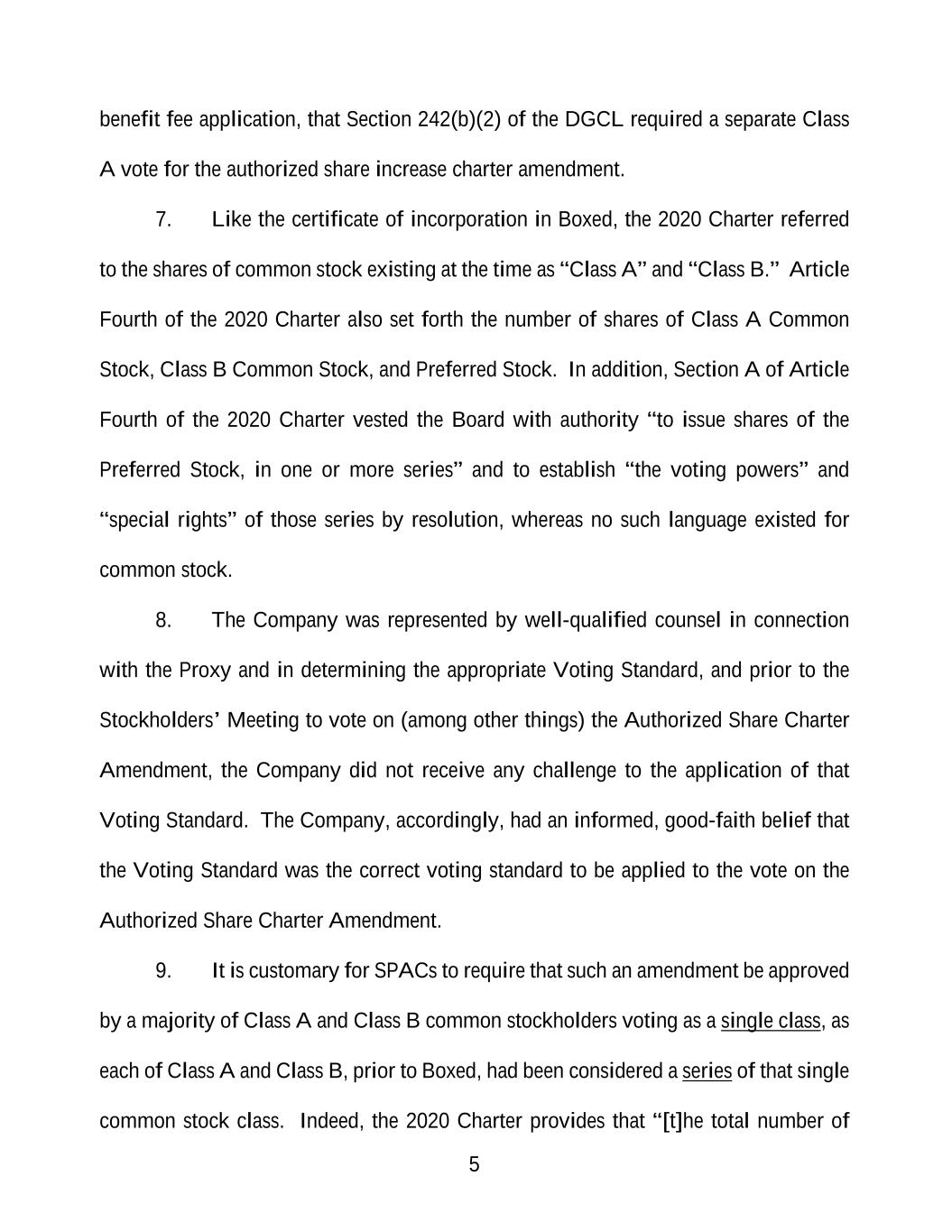5 benefit fee application, that Section 242(b)(2) of the DGCL required a separate Class A vote for the authorized share increase charter amendment. 7. Like the certificate of incorporation in Boxed, the 2020 Charter referred to the shares of common stock existing at the time as “Class A” and “Class B.” Article Fourth of the 2020 Charter also set forth the number of shares of Class A Common Stock, Class B Common Stock, and Preferred Stock. In addition, Section A of Article Fourth of the 2020 Charter vested the Board with authority “to issue shares of the Preferred Stock, in one or more series” and to establish “the voting powers” and “special rights” of those series by resolution, whereas no such language existed for common stock. 8. The Company was represented by well-qualified counsel in connection with the Proxy and in determining the appropriate Voting Standard, and prior to the Stockholders’ Meeting to vote on (among other things) the Authorized Share Charter Amendment, the Company did not receive any challenge to the application of that Voting Standard. The Company, accordingly, had an informed, good-faith belief that the Voting Standard was the correct voting standard to be applied to the vote on the Authorized Share Charter Amendment. 9. It is customary for SPACs to require that such an amendment be approved by a majority of Class A and Class B common stockholders voting as a single class, as each of Class A and Class B, prior to Boxed, had been considered a series of that single common stock class. Indeed, the 2020 Charter provides that “[t]he total number of