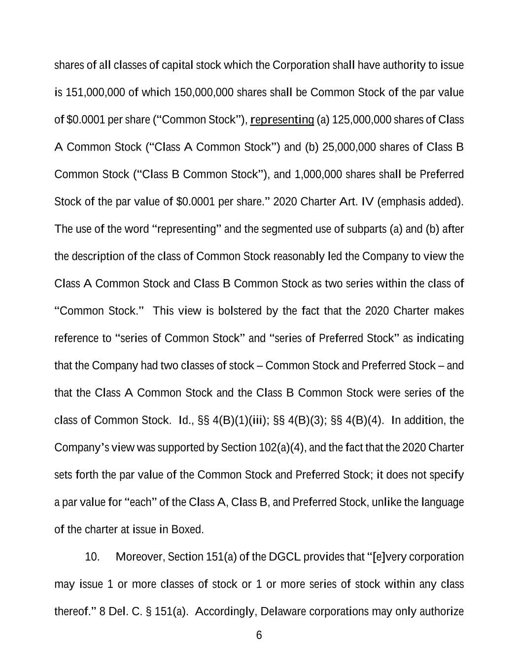 6 shares of all classes of capital stock which the Corporation shall have authority to issue is 151,000,000 of which 150,000,000 shares shall be Common Stock of the par value of $0.0001 per share (“Common Stock”), representing (a) 125,000,000 shares of Class A Common Stock (“Class A Common Stock”) and (b) 25,000,000 shares of Class B Common Stock (“Class B Common Stock”), and 1,000,000 shares shall be Preferred Stock of the par value of $0.0001 per share.” 2020 Charter Art. IV (emphasis added). The use of the word “representing” and the segmented use of subparts (a) and (b) after the description of the class of Common Stock reasonably led the Company to view the Class A Common Stock and Class B Common Stock as two series within the class of “Common Stock.” This view is bolstered by the fact that the 2020 Charter makes reference to “series of Common Stock” and “series of Preferred Stock” as indicating that the Company had two classes of stock – Common Stock and Preferred Stock – and that the Class A Common Stock and the Class B Common Stock were series of the class of Common Stock. Id., §§ 4(B)(1)(iii); §§ 4(B)(3); §§ 4(B)(4). In addition, the Company’s view was supported by Section 102(a)(4), and the fact that the 2020 Charter sets forth the par value of the Common Stock and Preferred Stock; it does not specify a par value for “each” of the Class A, Class B, and Preferred Stock, unlike the language of the charter at issue in Boxed. 10. Moreover, Section 151(a) of the DGCL provides that “[e]very corporation may issue 1 or more classes of stock or 1 or more series of stock within any class thereof.” 8 Del. C. § 151(a). Accordingly, Delaware corporations may only authorize