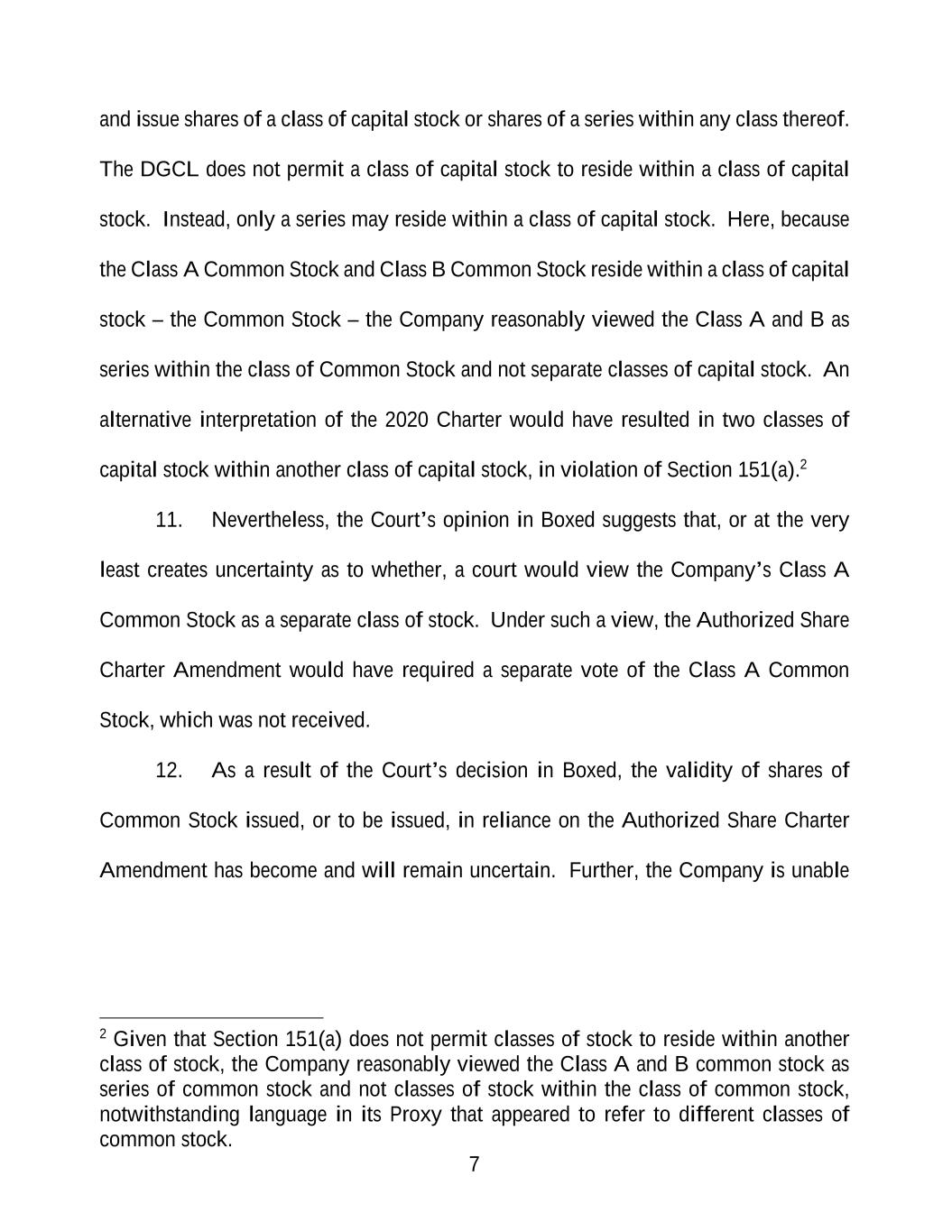 7 and issue shares of a class of capital stock or shares of a series within any class thereof. The DGCL does not permit a class of capital stock to reside within a class of capital stock. Instead, only a series may reside within a class of capital stock. Here, because the Class A Common Stock and Class B Common Stock reside within a class of capital stock – the Common Stock – the Company reasonably viewed the Class A and B as series within the class of Common Stock and not separate classes of capital stock. An alternative interpretation of the 2020 Charter would have resulted in two classes of capital stock within another class of capital stock, in violation of Section 151(a).2 11. Nevertheless, the Court’s opinion in Boxed suggests that, or at the very least creates uncertainty as to whether, a court would view the Company’s Class A Common Stock as a separate class of stock. Under such a view, the Authorized Share Charter Amendment would have required a separate vote of the Class A Common Stock, which was not received. 12. As a result of the Court’s decision in Boxed, the validity of shares of Common Stock issued, or to be issued, in reliance on the Authorized Share Charter Amendment has become and will remain uncertain. Further, the Company is unable 2 Given that Section 151(a) does not permit classes of stock to reside within another class of stock, the Company reasonably viewed the Class A and B common stock as series of common stock and not classes of stock within the class of common stock, notwithstanding language in its Proxy that appeared to refer to different classes of common stock.