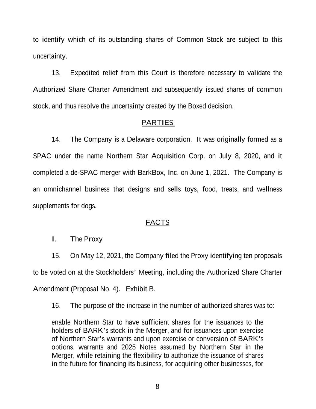 8 to identify which of its outstanding shares of Common Stock are subject to this uncertainty. 13. Expedited relief from this Court is therefore necessary to validate the Authorized Share Charter Amendment and subsequently issued shares of common stock, and thus resolve the uncertainty created by the Boxed decision. PARTIES 14. The Company is a Delaware corporation. It was originally formed as a SPAC under the name Northern Star Acquisition Corp. on July 8, 2020, and it completed a de-SPAC merger with BarkBox, Inc. on June 1, 2021. The Company is an omnichannel business that designs and sells toys, food, treats, and wellness supplements for dogs. FACTS I. The Proxy 15. On May 12, 2021, the Company filed the Proxy identifying ten proposals to be voted on at the Stockholders’ Meeting, including the Authorized Share Charter Amendment (Proposal No. 4). Exhibit B. 16. The purpose of the increase in the number of authorized shares was to: enable Northern Star to have sufficient shares for the issuances to the holders of BARK’s stock in the Merger, and for issuances upon exercise of Northern Star’s warrants and upon exercise or conversion of BARK’s options, warrants and 2025 Notes assumed by Northern Star in the Merger, while retaining the flexibility to authorize the issuance of shares in the future for financing its business, for acquiring other businesses, for