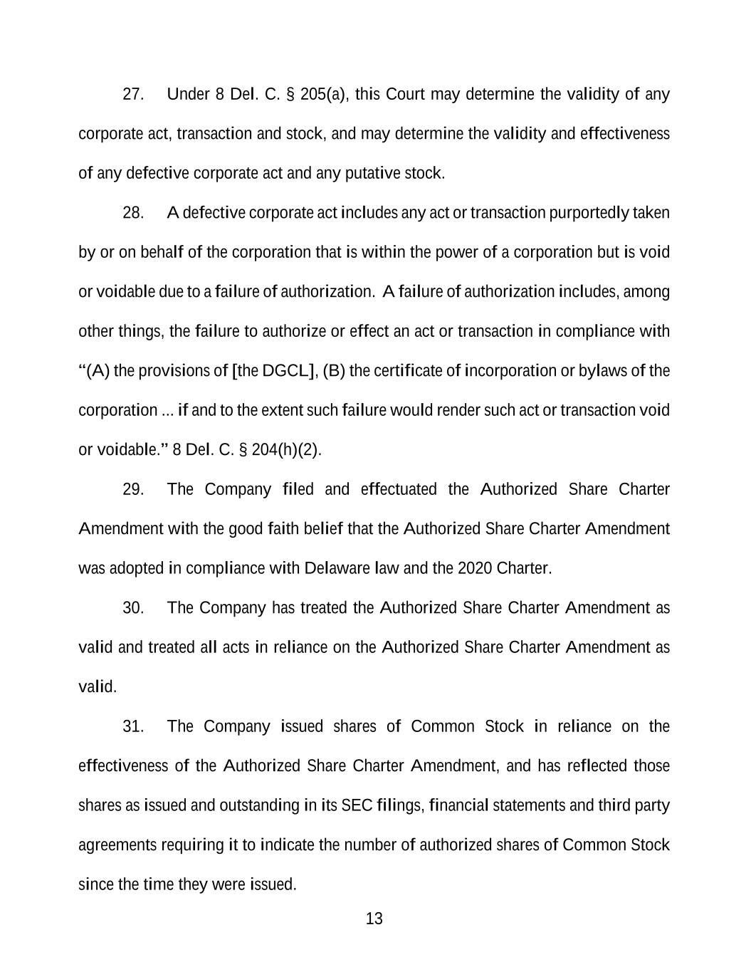 13 27. Under 8 Del. C. § 205(a), this Court may determine the validity of any corporate act, transaction and stock, and may determine the validity and effectiveness of any defective corporate act and any putative stock. 28. A defective corporate act includes any act or transaction purportedly taken by or on behalf of the corporation that is within the power of a corporation but is void or voidable due to a failure of authorization. A failure of authorization includes, among other things, the failure to authorize or effect an act or transaction in compliance with “(A) the provisions of [the DGCL], (B) the certificate of incorporation or bylaws of the corporation ... if and to the extent such failure would render such act or transaction void or voidable.” 8 Del. C. § 204(h)(2). 29. The Company filed and effectuated the Authorized Share Charter Amendment with the good faith belief that the Authorized Share Charter Amendment was adopted in compliance with Delaware law and the 2020 Charter. 30. The Company has treated the Authorized Share Charter Amendment as valid and treated all acts in reliance on the Authorized Share Charter Amendment as valid. 31. The Company issued shares of Common Stock in reliance on the effectiveness of the Authorized Share Charter Amendment, and has reflected those shares as issued and outstanding in its SEC filings, financial statements and third party agreements requiring it to indicate the number of authorized shares of Common Stock since the time they were issued.