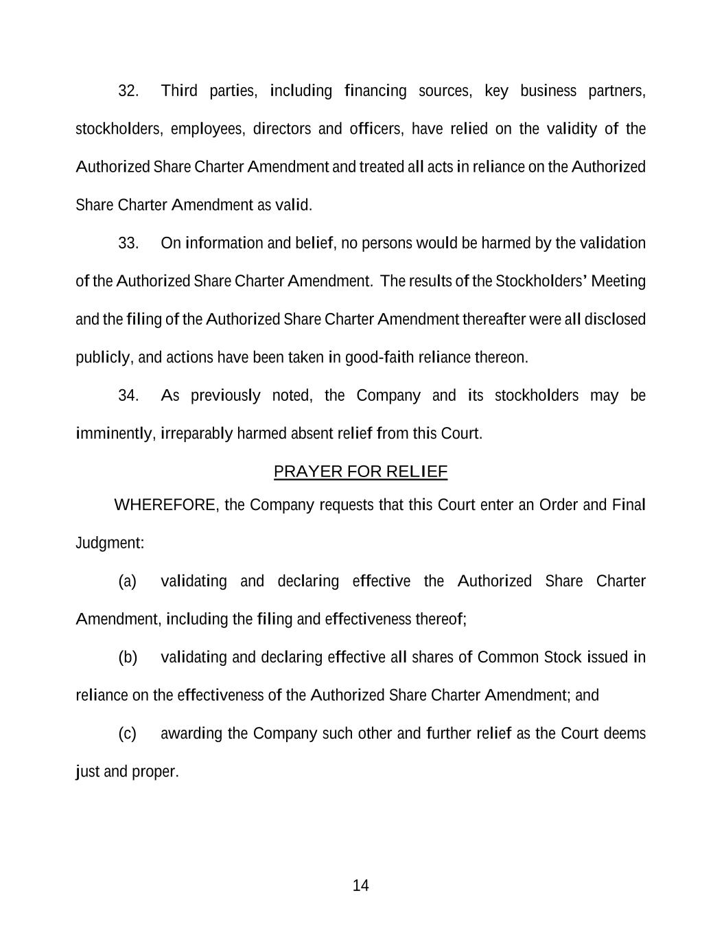 14 32. Third parties, including financing sources, key business partners, stockholders, employees, directors and officers, have relied on the validity of the Authorized Share Charter Amendment and treated all acts in reliance on the Authorized Share Charter Amendment as valid. 33. On information and belief, no persons would be harmed by the validation of the Authorized Share Charter Amendment. The results of the Stockholders’ Meeting and the filing of the Authorized Share Charter Amendment thereafter were all disclosed publicly, and actions have been taken in good-faith reliance thereon. 34. As previously noted, the Company and its stockholders may be imminently, irreparably harmed absent relief from this Court. PRAYER FOR RELIEF WHEREFORE, the Company requests that this Court enter an Order and Final Judgment: (a) validating and declaring effective the Authorized Share Charter Amendment, including the filing and effectiveness thereof; (b) validating and declaring effective all shares of Common Stock issued in reliance on the effectiveness of the Authorized Share Charter Amendment; and (c) awarding the Company such other and further relief as the Court deems just and proper.