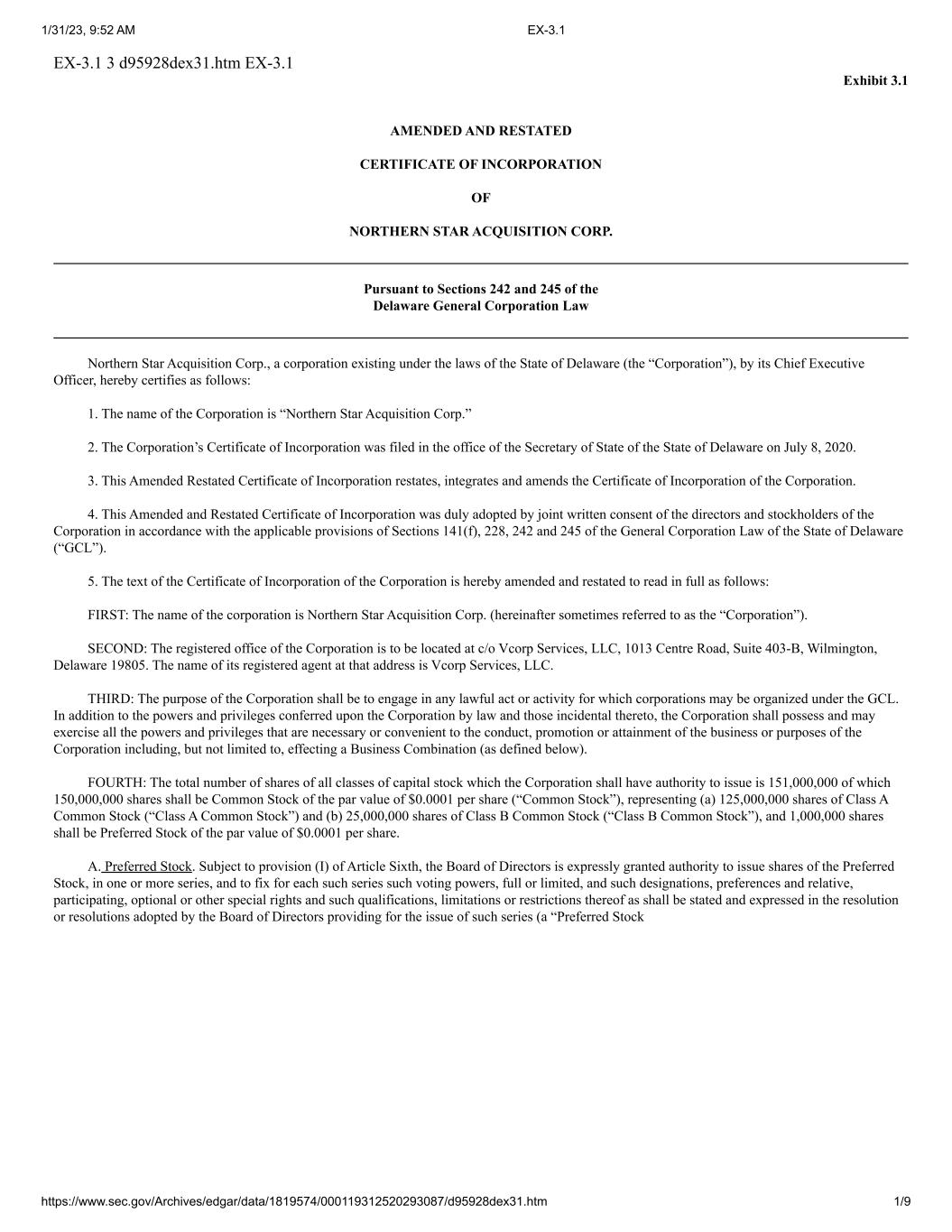 1/31/23, 9:52 AM EX-3.1 https://www.sec.gov/Archives/edgar/data/1819574/000119312520293087/d95928dex31.htm 1/9 EX-3.1 3 d95928dex31.htm EX-3.1 Exhibit 3.1 AMENDED AND RESTATED CERTIFICATE OF INCORPORATION OF NORTHERN STAR ACQUISITION CORP. Pursuant to Sections 242 and 245 of the Delaware General Corporation Law Northern Star Acquisition Corp., a corporation existing under the laws of the State of Delaware (the “Corporation”), by its Chief Executive Officer, hereby certifies as follows: 1. The name of the Corporation is “Northern Star Acquisition Corp.” 2. The Corporation’s Certificate of Incorporation was filed in the office of the Secretary of State of the State of Delaware on July 8, 2020. 3. This Amended Restated Certificate of Incorporation restates, integrates and amends the Certificate of Incorporation of the Corporation. 4. This Amended and Restated Certificate of Incorporation was duly adopted by joint written consent of the directors and stockholders of the Corporation in accordance with the applicable provisions of Sections 141(f), 228, 242 and 245 of the General Corporation Law of the State of Delaware (“GCL”). 5. The text of the Certificate of Incorporation of the Corporation is hereby amended and restated to read in full as follows: FIRST: The name of the corporation is Northern Star Acquisition Corp. (hereinafter sometimes referred to as the “Corporation”). SECOND: The registered office of the Corporation is to be located at c/o Vcorp Services, LLC, 1013 Centre Road, Suite 403-B, Wilmington, Delaware 19805. The name of its registered agent at that address is Vcorp Services, LLC. THIRD: The purpose of the Corporation shall be to engage in any lawful act or activity for which corporations may be organized under the GCL. In addition to the powers and privileges conferred upon the Corporation by law and those incidental thereto, the Corporation shall possess and may exercise all the powers and privileges that are necessary or convenient to the conduct, promotion or attainment of the business or purposes of the Corporation including, but not limited to, effecting a Business Combination (as defined below). FOURTH: The total number of shares of all classes of capital stock which the Corporation shall have authority to issue is 151,000,000 of which 150,000,000 shares shall be Common Stock of the par value of $0.0001 per share (“Common Stock”), representing (a) 125,000,000 shares of Class A Common Stock (“Class A Common Stock”) and (b) 25,000,000 shares of Class B Common Stock (“Class B Common Stock”), and 1,000,000 shares shall be Preferred Stock of the par value of $0.0001 per share. A. Preferred Stock. Subject to provision (I) of Article Sixth, the Board of Directors is expressly granted authority to issue shares of the Preferred Stock, in one or more series, and to fix for each such series such voting powers, full or limited, and such designations, preferences and relative, participating, optional or other special rights and such qualifications, limitations or restrictions thereof as shall be stated and expressed in the resolution or resolutions adopted by the Board of Directors providing for the issue of such series (a “Preferred Stock