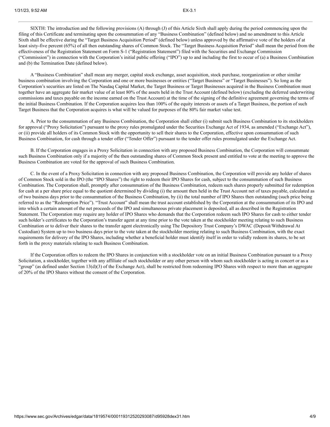 1/31/23, 9:52 AM EX-3.1 https://www.sec.gov/Archives/edgar/data/1819574/000119312520293087/d95928dex31.htm 4/9 SIXTH: The introduction and the following provisions (A) through (J) of this Article Sixth shall apply during the period commencing upon the filing of this Certificate and terminating upon the consummation of any “Business Combination” (defined below) and no amendment to this Article Sixth shall be effective during the “Target Business Acquisition Period” (defined below) unless approved by the affirmative vote of the holders of at least sixty-five percent (65%) of all then outstanding shares of Common Stock. The “Target Business Acquisition Period” shall mean the period from the effectiveness of the Registration Statement on Form S-1 (“Registration Statement”) filed with the Securities and Exchange Commission (“Commission”) in connection with the Corporation’s initial public offering (“IPO”) up to and including the first to occur of (a) a Business Combination and (b) the Termination Date (defined below). A “Business Combination” shall mean any merger, capital stock exchange, asset acquisition, stock purchase, reorganization or other similar business combination involving the Corporation and one or more businesses or entities (“Target Business” or “Target Businesses”). So long as the Corporation’s securities are listed on The Nasdaq Capital Market, the Target Business or Target Businesses acquired in the Business Combination must together have an aggregate fair market value of at least 80% of the assets held in the Trust Account (defined below) (excluding the deferred underwriting commissions and taxes payable on the income earned on the Trust Account) at the time of the signing of the definitive agreement governing the terms of the initial Business Combination. If the Corporation acquires less than 100% of the equity interests or assets of a Target Business, the portion of such Target Business that the Corporation acquires is what will be valued for purposes of the 80% fair market value test. A. Prior to the consummation of any Business Combination, the Corporation shall either (i) submit such Business Combination to its stockholders for approval (“Proxy Solicitation”) pursuant to the proxy rules promulgated under the Securities Exchange Act of 1934, as amended (“Exchange Act”), or (ii) provide all holders of its Common Stock with the opportunity to sell their shares to the Corporation, effective upon consummation of such Business Combination, for cash through a tender offer (“Tender Offer”) pursuant to the tender offer rules promulgated under the Exchange Act. B. If the Corporation engages in a Proxy Solicitation in connection with any proposed Business Combination, the Corporation will consummate such Business Combination only if a majority of the then outstanding shares of Common Stock present and entitled to vote at the meeting to approve the Business Combination are voted for the approval of such Business Combination. C. In the event of a Proxy Solicitation in connection with any proposed Business Combination, the Corporation will provide any holder of shares of Common Stock sold in the IPO (the “IPO Shares”) the right to redeem their IPO Shares for cash, subject to the consummation of such Business Combination. The Corporation shall, promptly after consummation of the Business Combination, redeem such shares properly submitted for redemption for cash at a per share price equal to the quotient determined by dividing (i) the amount then held in the Trust Account net of taxes payable, calculated as of two business days prior to the consummation of the Business Combination, by (ii) the total number of IPO Shares then outstanding (such price being referred to as the “Redemption Price”). “Trust Account” shall mean the trust account established by the Corporation at the consummation of its IPO and into which a certain amount of the net proceeds of the IPO and simultaneous private placement is deposited, all as described in the Registration Statement. The Corporation may require any holder of IPO Shares who demands that the Corporation redeem such IPO Shares for cash to either tender such holder’s certificates to the Corporation’s transfer agent at any time prior to the vote taken at the stockholder meeting relating to such Business Combination or to deliver their shares to the transfer agent electronically using The Depository Trust Company’s DWAC (Deposit/Withdrawal At Custodian) System up to two business days prior to the vote taken at the stockholder meeting relating to such Business Combination, with the exact requirements for delivery of the IPO Shares, including whether a beneficial holder must identify itself in order to validly redeem its shares, to be set forth in the proxy materials relating to such Business Combination. If the Corporation offers to redeem the IPO Shares in conjunction with a stockholder vote on an initial Business Combination pursuant to a Proxy Solicitation, a stockholder, together with any affiliate of such stockholder or any other person with whom such stockholder is acting in concert or as a “group” (as defined under Section 13(d)(3) of the Exchange Act), shall be restricted from redeeming IPO Shares with respect to more than an aggregate of 20% of the IPO Shares without the consent of the Corporation.