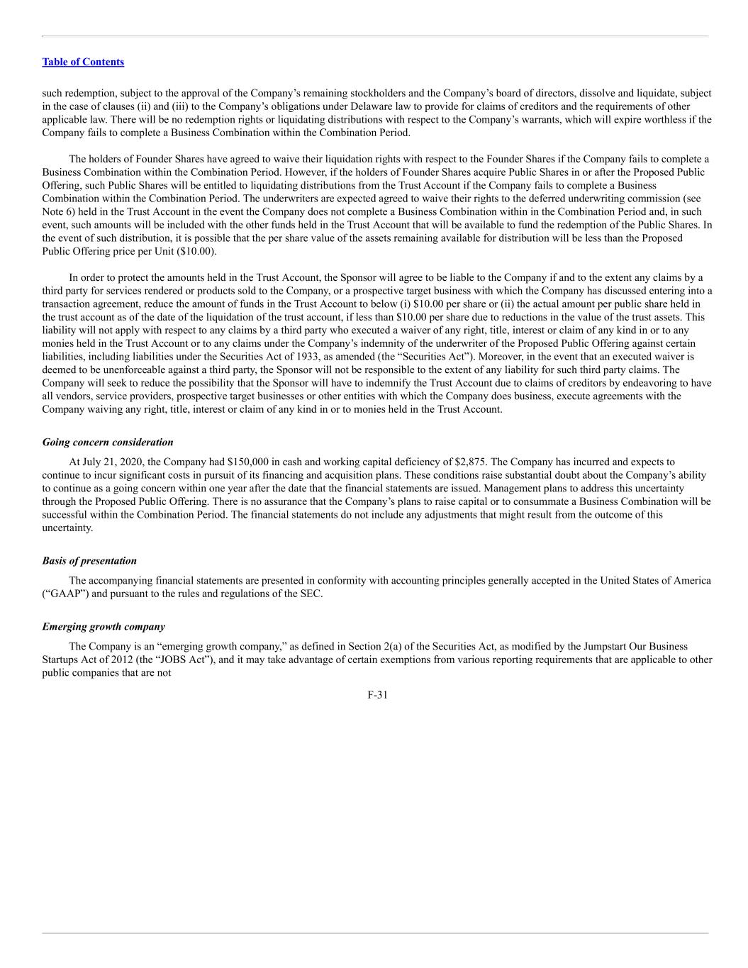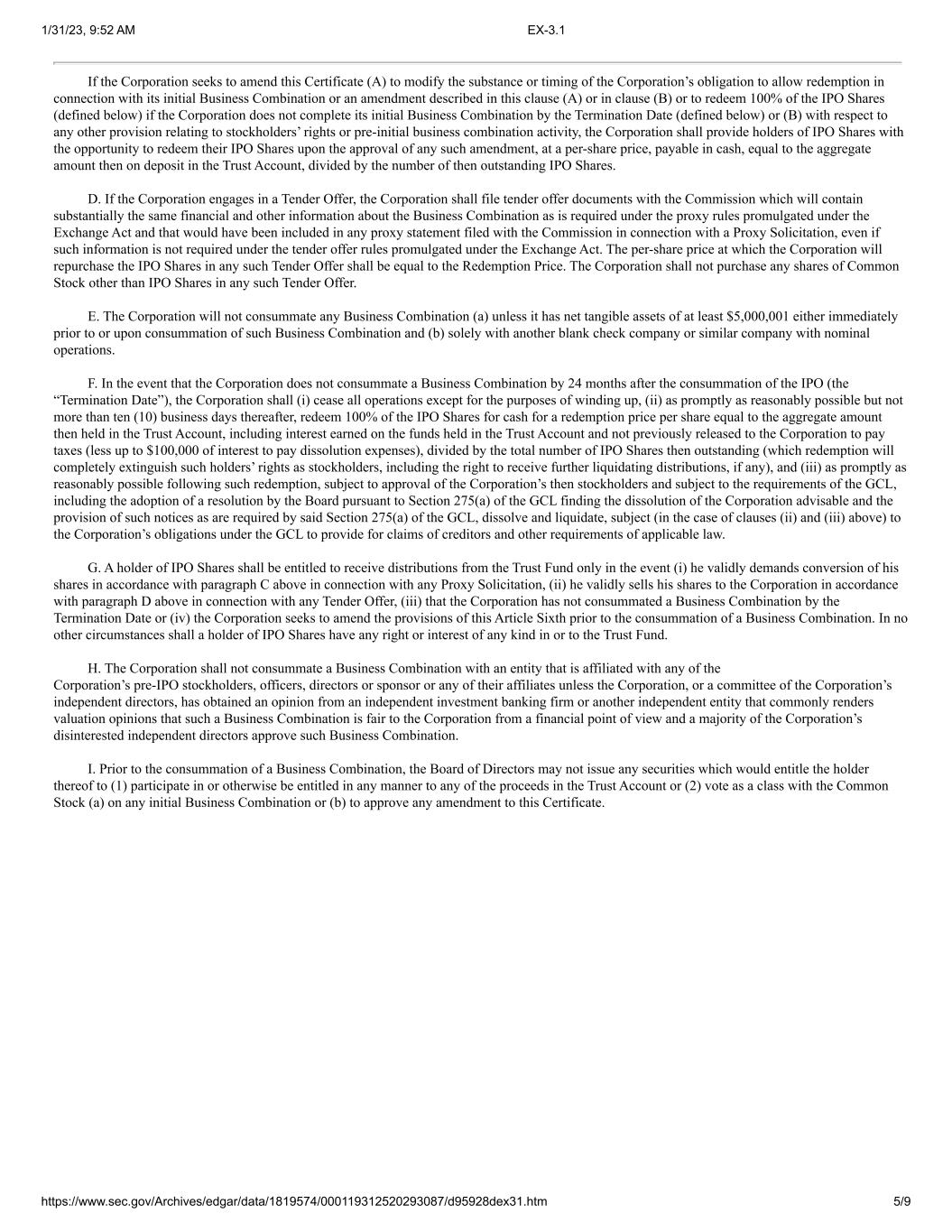 1/31/23, 9:52 AM EX-3.1 https://www.sec.gov/Archives/edgar/data/1819574/000119312520293087/d95928dex31.htm 5/9 If the Corporation seeks to amend this Certificate (A) to modify the substance or timing of the Corporation’s obligation to allow redemption in connection with its initial Business Combination or an amendment described in this clause (A) or in clause (B) or to redeem 100% of the IPO Shares (defined below) if the Corporation does not complete its initial Business Combination by the Termination Date (defined below) or (B) with respect to any other provision relating to stockholders’ rights or pre-initial business combination activity, the Corporation shall provide holders of IPO Shares with the opportunity to redeem their IPO Shares upon the approval of any such amendment, at a per-share price, payable in cash, equal to the aggregate amount then on deposit in the Trust Account, divided by the number of then outstanding IPO Shares. D. If the Corporation engages in a Tender Offer, the Corporation shall file tender offer documents with the Commission which will contain substantially the same financial and other information about the Business Combination as is required under the proxy rules promulgated under the Exchange Act and that would have been included in any proxy statement filed with the Commission in connection with a Proxy Solicitation, even if such information is not required under the tender offer rules promulgated under the Exchange Act. The per-share price at which the Corporation will repurchase the IPO Shares in any such Tender Offer shall be equal to the Redemption Price. The Corporation shall not purchase any shares of Common Stock other than IPO Shares in any such Tender Offer. E. The Corporation will not consummate any Business Combination (a) unless it has net tangible assets of at least $5,000,001 either immediately prior to or upon consummation of such Business Combination and (b) solely with another blank check company or similar company with nominal operations. F. In the event that the Corporation does not consummate a Business Combination by 24 months after the consummation of the IPO (the “Termination Date”), the Corporation shall (i) cease all operations except for the purposes of winding up, (ii) as promptly as reasonably possible but not more than ten (10) business days thereafter, redeem 100% of the IPO Shares for cash for a redemption price per share equal to the aggregate amount then held in the Trust Account, including interest earned on the funds held in the Trust Account and not previously released to the Corporation to pay taxes (less up to $100,000 of interest to pay dissolution expenses), divided by the total number of IPO Shares then outstanding (which redemption will completely extinguish such holders’ rights as stockholders, including the right to receive further liquidating distributions, if any), and (iii) as promptly as reasonably possible following such redemption, subject to approval of the Corporation’s then stockholders and subject to the requirements of the GCL, including the adoption of a resolution by the Board pursuant to Section 275(a) of the GCL finding the dissolution of the Corporation advisable and the provision of such notices as are required by said Section 275(a) of the GCL, dissolve and liquidate, subject (in the case of clauses (ii) and (iii) above) to the Corporation’s obligations under the GCL to provide for claims of creditors and other requirements of applicable law. G. A holder of IPO Shares shall be entitled to receive distributions from the Trust Fund only in the event (i) he validly demands conversion of his shares in accordance with paragraph C above in connection with any Proxy Solicitation, (ii) he validly sells his shares to the Corporation in accordance with paragraph D above in connection with any Tender Offer, (iii) that the Corporation has not consummated a Business Combination by the Termination Date or (iv) the Corporation seeks to amend the provisions of this Article Sixth prior to the consummation of a Business Combination. In no other circumstances shall a holder of IPO Shares have any right or interest of any kind in or to the Trust Fund. H. The Corporation shall not consummate a Business Combination with an entity that is affiliated with any of the Corporation’s pre-IPO stockholders, officers, directors or sponsor or any of their affiliates unless the Corporation, or a committee of the Corporation’s independent directors, has obtained an opinion from an independent investment banking firm or another independent entity that commonly renders valuation opinions that such a Business Combination is fair to the Corporation from a financial point of view and a majority of the Corporation’s disinterested independent directors approve such Business Combination. I. Prior to the consummation of a Business Combination, the Board of Directors may not issue any securities which would entitle the holder thereof to (1) participate in or otherwise be entitled in any manner to any of the proceeds in the Trust Account or (2) vote as a class with the Common Stock (a) on any initial Business Combination or (b) to approve any amendment to this Certificate.