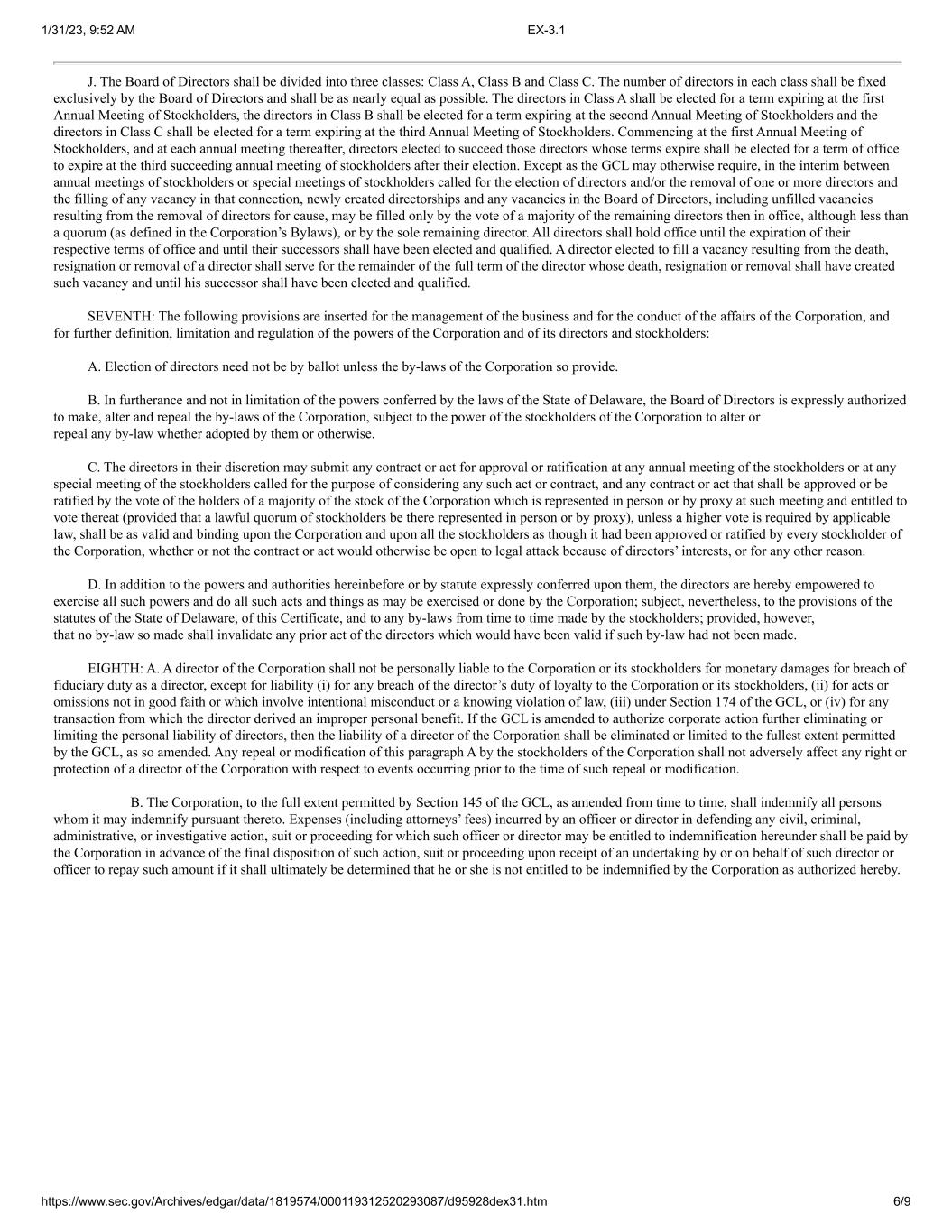 1/31/23, 9:52 AM EX-3.1 https://www.sec.gov/Archives/edgar/data/1819574/000119312520293087/d95928dex31.htm 6/9 J. The Board of Directors shall be divided into three classes: Class A, Class B and Class C. The number of directors in each class shall be fixed exclusively by the Board of Directors and shall be as nearly equal as possible. The directors in Class A shall be elected for a term expiring at the first Annual Meeting of Stockholders, the directors in Class B shall be elected for a term expiring at the second Annual Meeting of Stockholders and the directors in Class C shall be elected for a term expiring at the third Annual Meeting of Stockholders. Commencing at the first Annual Meeting of Stockholders, and at each annual meeting thereafter, directors elected to succeed those directors whose terms expire shall be elected for a term of office to expire at the third succeeding annual meeting of stockholders after their election. Except as the GCL may otherwise require, in the interim between annual meetings of stockholders or special meetings of stockholders called for the election of directors and/or the removal of one or more directors and the filling of any vacancy in that connection, newly created directorships and any vacancies in the Board of Directors, including unfilled vacancies resulting from the removal of directors for cause, may be filled only by the vote of a majority of the remaining directors then in office, although less than a quorum (as defined in the Corporation’s Bylaws), or by the sole remaining director. All directors shall hold office until the expiration of their respective terms of office and until their successors shall have been elected and qualified. A director elected to fill a vacancy resulting from the death, resignation or removal of a director shall serve for the remainder of the full term of the director whose death, resignation or removal shall have created such vacancy and until his successor shall have been elected and qualified. SEVENTH: The following provisions are inserted for the management of the business and for the conduct of the affairs of the Corporation, and for further definition, limitation and regulation of the powers of the Corporation and of its directors and stockholders: A. Election of directors need not be by ballot unless the by-laws of the Corporation so provide. B. In furtherance and not in limitation of the powers conferred by the laws of the State of Delaware, the Board of Directors is expressly authorized to make, alter and repeal the by-laws of the Corporation, subject to the power of the stockholders of the Corporation to alter or repeal any by-law whether adopted by them or otherwise. C. The directors in their discretion may submit any contract or act for approval or ratification at any annual meeting of the stockholders or at any special meeting of the stockholders called for the purpose of considering any such act or contract, and any contract or act that shall be approved or be ratified by the vote of the holders of a majority of the stock of the Corporation which is represented in person or by proxy at such meeting and entitled to vote thereat (provided that a lawful quorum of stockholders be there represented in person or by proxy), unless a higher vote is required by applicable law, shall be as valid and binding upon the Corporation and upon all the stockholders as though it had been approved or ratified by every stockholder of the Corporation, whether or not the contract or act would otherwise be open to legal attack because of directors’ interests, or for any other reason. D. In addition to the powers and authorities hereinbefore or by statute expressly conferred upon them, the directors are hereby empowered to exercise all such powers and do all such acts and things as may be exercised or done by the Corporation; subject, nevertheless, to the provisions of the statutes of the State of Delaware, of this Certificate, and to any by-laws from time to time made by the stockholders; provided, however, that no by-law so made shall invalidate any prior act of the directors which would have been valid if such by-law had not been made. EIGHTH: A. A director of the Corporation shall not be personally liable to the Corporation or its stockholders for monetary damages for breach of fiduciary duty as a director, except for liability (i) for any breach of the director’s duty of loyalty to the Corporation or its stockholders, (ii) for acts or omissions not in good faith or which involve intentional misconduct or a knowing violation of law, (iii) under Section 174 of the GCL, or (iv) for any transaction from which the director derived an improper personal benefit. If the GCL is amended to authorize corporate action further eliminating or limiting the personal liability of directors, then the liability of a director of the Corporation shall be eliminated or limited to the fullest extent permitted by the GCL, as so amended. Any repeal or modification of this paragraph A by the stockholders of the Corporation shall not adversely affect any right or protection of a director of the Corporation with respect to events occurring prior to the time of such repeal or modification. B. The Corporation, to the full extent permitted by Section 145 of the GCL, as amended from time to time, shall indemnify all persons whom it may indemnify pursuant thereto. Expenses (including attorneys’ fees) incurred by an officer or director in defending any civil, criminal, administrative, or investigative action, suit or proceeding for which such officer or director may be entitled to indemnification hereunder shall be paid by the Corporation in advance of the final disposition of such action, suit or proceeding upon receipt of an undertaking by or on behalf of such director or officer to repay such amount if it shall ultimately be determined that he or she is not entitled to be indemnified by the Corporation as authorized hereby.