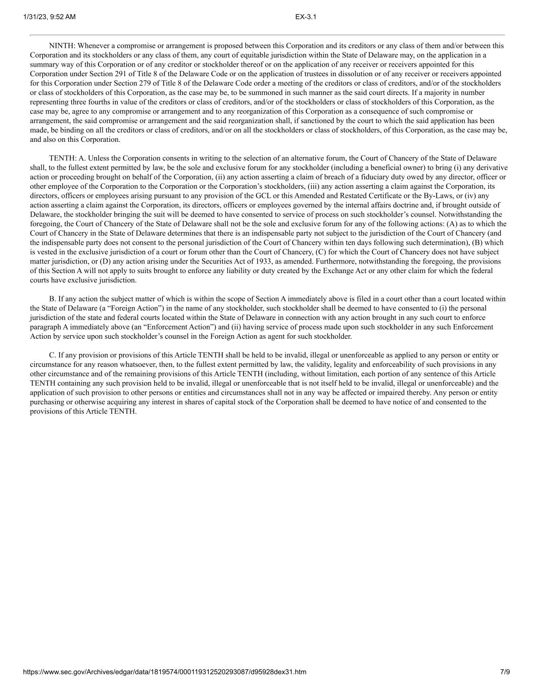 1/31/23, 9:52 AM EX-3.1 https://www.sec.gov/Archives/edgar/data/1819574/000119312520293087/d95928dex31.htm 7/9 NINTH: Whenever a compromise or arrangement is proposed between this Corporation and its creditors or any class of them and/or between this Corporation and its stockholders or any class of them, any court of equitable jurisdiction within the State of Delaware may, on the application in a summary way of this Corporation or of any creditor or stockholder thereof or on the application of any receiver or receivers appointed for this Corporation under Section 291 of Title 8 of the Delaware Code or on the application of trustees in dissolution or of any receiver or receivers appointed for this Corporation under Section 279 of Title 8 of the Delaware Code order a meeting of the creditors or class of creditors, and/or of the stockholders or class of stockholders of this Corporation, as the case may be, to be summoned in such manner as the said court directs. If a majority in number representing three fourths in value of the creditors or class of creditors, and/or of the stockholders or class of stockholders of this Corporation, as the case may be, agree to any compromise or arrangement and to any reorganization of this Corporation as a consequence of such compromise or arrangement, the said compromise or arrangement and the said reorganization shall, if sanctioned by the court to which the said application has been made, be binding on all the creditors or class of creditors, and/or on all the stockholders or class of stockholders, of this Corporation, as the case may be, and also on this Corporation. TENTH: A. Unless the Corporation consents in writing to the selection of an alternative forum, the Court of Chancery of the State of Delaware shall, to the fullest extent permitted by law, be the sole and exclusive forum for any stockholder (including a beneficial owner) to bring (i) any derivative action or proceeding brought on behalf of the Corporation, (ii) any action asserting a claim of breach of a fiduciary duty owed by any director, officer or other employee of the Corporation to the Corporation or the Corporation’s stockholders, (iii) any action asserting a claim against the Corporation, its directors, officers or employees arising pursuant to any provision of the GCL or this Amended and Restated Certificate or the By-Laws, or (iv) any action asserting a claim against the Corporation, its directors, officers or employees governed by the internal affairs doctrine and, if brought outside of Delaware, the stockholder bringing the suit will be deemed to have consented to service of process on such stockholder’s counsel. Notwithstanding the foregoing, the Court of Chancery of the State of Delaware shall not be the sole and exclusive forum for any of the following actions: (A) as to which the Court of Chancery in the State of Delaware determines that there is an indispensable party not subject to the jurisdiction of the Court of Chancery (and the indispensable party does not consent to the personal jurisdiction of the Court of Chancery within ten days following such determination), (B) which is vested in the exclusive jurisdiction of a court or forum other than the Court of Chancery, (C) for which the Court of Chancery does not have subject matter jurisdiction, or (D) any action arising under the Securities Act of 1933, as amended. Furthermore, notwithstanding the foregoing, the provisions of this Section A will not apply to suits brought to enforce any liability or duty created by the Exchange Act or any other claim for which the federal courts have exclusive jurisdiction. B. If any action the subject matter of which is within the scope of Section A immediately above is filed in a court other than a court located within the State of Delaware (a “Foreign Action”) in the name of any stockholder, such stockholder shall be deemed to have consented to (i) the personal jurisdiction of the state and federal courts located within the State of Delaware in connection with any action brought in any such court to enforce paragraph A immediately above (an “Enforcement Action”) and (ii) having service of process made upon such stockholder in any such Enforcement Action by service upon such stockholder’s counsel in the Foreign Action as agent for such stockholder. C. If any provision or provisions of this Article TENTH shall be held to be invalid, illegal or unenforceable as applied to any person or entity or circumstance for any reason whatsoever, then, to the fullest extent permitted by law, the validity, legality and enforceability of such provisions in any other circumstance and of the remaining provisions of this Article TENTH (including, without limitation, each portion of any sentence of this Article TENTH containing any such provision held to be invalid, illegal or unenforceable that is not itself held to be invalid, illegal or unenforceable) and the application of such provision to other persons or entities and circumstances shall not in any way be affected or impaired thereby. Any person or entity purchasing or otherwise acquiring any interest in shares of capital stock of the Corporation shall be deemed to have notice of and consented to the provisions of this Article TENTH.