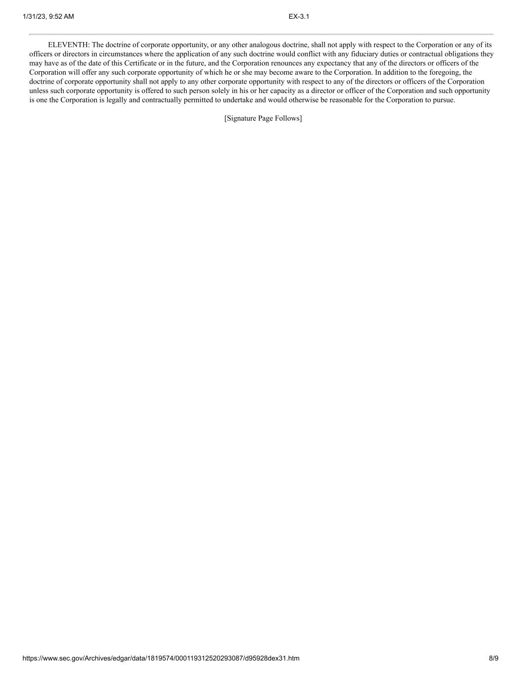 1/31/23, 9:52 AM EX-3.1 https://www.sec.gov/Archives/edgar/data/1819574/000119312520293087/d95928dex31.htm 8/9 ELEVENTH: The doctrine of corporate opportunity, or any other analogous doctrine, shall not apply with respect to the Corporation or any of its officers or directors in circumstances where the application of any such doctrine would conflict with any fiduciary duties or contractual obligations they may have as of the date of this Certificate or in the future, and the Corporation renounces any expectancy that any of the directors or officers of the Corporation will offer any such corporate opportunity of which he or she may become aware to the Corporation. In addition to the foregoing, the doctrine of corporate opportunity shall not apply to any other corporate opportunity with respect to any of the directors or officers of the Corporation unless such corporate opportunity is offered to such person solely in his or her capacity as a director or officer of the Corporation and such opportunity is one the Corporation is legally and contractually permitted to undertake and would otherwise be reasonable for the Corporation to pursue. [Signature Page Follows]