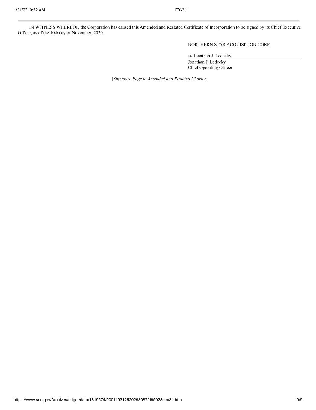 1/31/23, 9:52 AM EX-3.1 https://www.sec.gov/Archives/edgar/data/1819574/000119312520293087/d95928dex31.htm 9/9 IN WITNESS WHEREOF, the Corporation has caused this Amended and Restated Certificate of Incorporation to be signed by its Chief Executive Officer, as of the 10th day of November, 2020. NORTHERN STAR ACQUISITION CORP. /s/ Jonathan J. Ledecky Jonathan J. Ledecky Chief Operating Officer [Signature Page to Amended and Restated Charter]