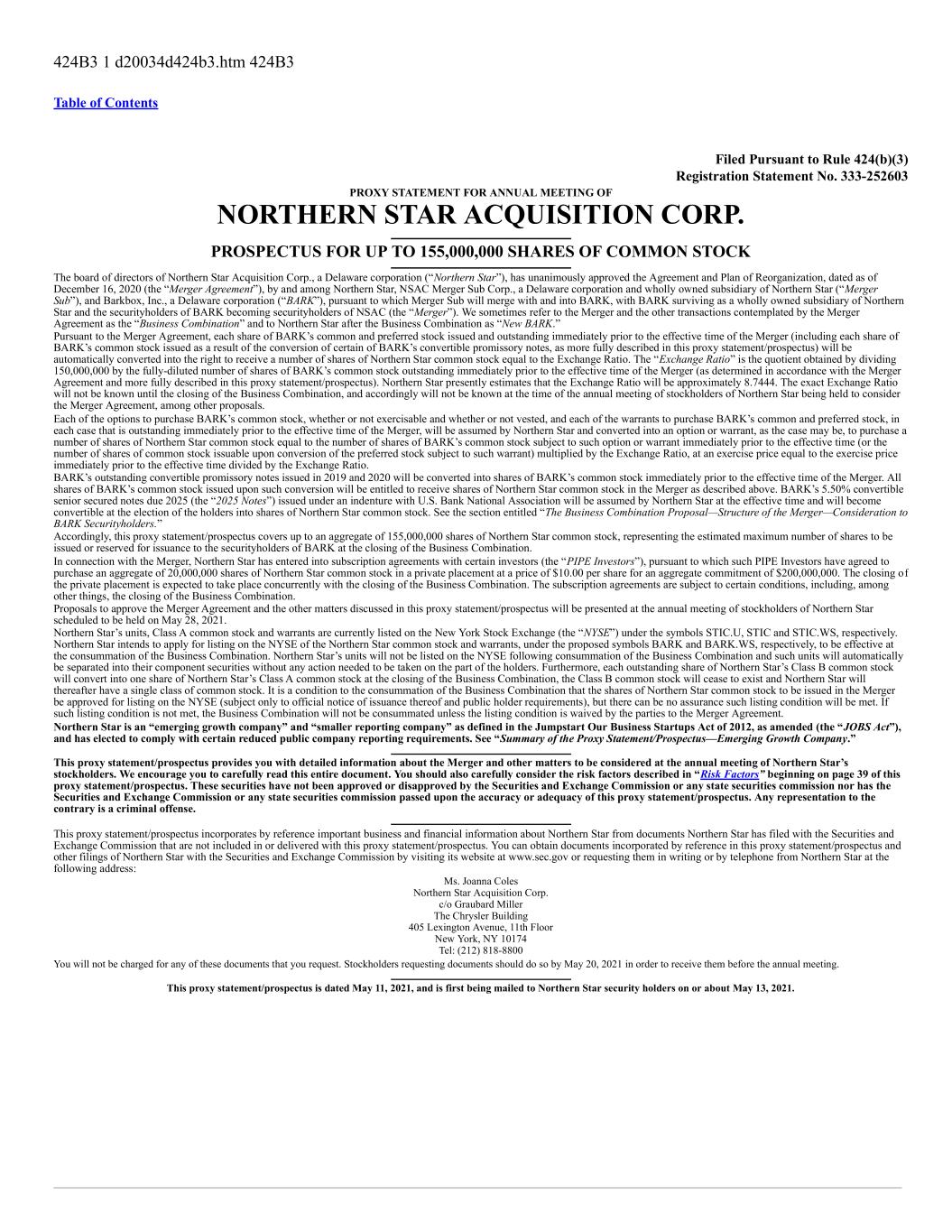424B3 1 d20034d424b3.htm 424B3 Table of Contents     Filed Pursuant to Rule 424(b)(3) Registration Statement No. 333-252603 PROXY STATEMENT FOR ANNUAL MEETING OF NORTHERN STAR ACQUISITION CORP.     PROSPECTUS FOR UP TO 155,000,000 SHARES OF COMMON STOCK     The board of directors of Northern Star Acquisition Corp., a Delaware corporation (“Northern Star”), has unanimously approved the Agreement and Plan of Reorganization, dated as of December 16, 2020 (the “Merger Agreement”), by and among Northern Star, NSAC Merger Sub Corp., a Delaware corporation and wholly owned subsidiary of Northern Star (“Merger Sub”), and Barkbox, Inc., a Delaware corporation (“BARK”), pursuant to which Merger Sub will merge with and into BARK, with BARK surviving as a wholly owned subsidiary of Northern Star and the securityholders of BARK becoming securityholders of NSAC (the “Merger”). We sometimes refer to the Merger and the other transactions contemplated by the Merger Agreement as the “Business Combination” and to Northern Star after the Business Combination as “New BARK.” Pursuant to the Merger Agreement, each share of BARK’s common and preferred stock issued and outstanding immediately prior to the effective time of the Merger (including each share of BARK’s common stock issued as a result of the conversion of certain of BARK’s convertible promissory notes, as more fully described in this proxy statement/prospectus) will be automatically converted into the right to receive a number of shares of Northern Star common stock equal to the Exchange Ratio. The “Exchange Ratio” is the quotient obtained by dividing 150,000,000 by the fully-diluted number of shares of BARK’s common stock outstanding immediately prior to the effective time of the Merger (as determined in accordance with the Merger Agreement and more fully described in this proxy statement/prospectus). Northern Star presently estimates that the Exchange Ratio will be approximately 8.7444. The exact Exchange Ratio will not be known until the closing of the Business Combination, and accordingly will not be known at the time of the annual meeting of stockholders of Northern Star being held to consider the Merger Agreement, among other proposals. Each of the options to purchase BARK’s common stock, whether or not exercisable and whether or not vested, and each of the warrants to purchase BARK’s common and preferred stock, in each case that is outstanding immediately prior to the effective time of the Merger, will be assumed by Northern Star and converted into an option or warrant, as the case may be, to purchase a number of shares of Northern Star common stock equal to the number of shares of BARK’s common stock subject to such option or warrant immediately prior to the effective time (or the number of shares of common stock issuable upon conversion of the preferred stock subject to such warrant) multiplied by the Exchange Ratio, at an exercise price equal to the exercise price immediately prior to the effective time divided by the Exchange Ratio. BARK’s outstanding convertible promissory notes issued in 2019 and 2020 will be converted into shares of BARK’s common stock immediately prior to the effective time of the Merger. All shares of BARK’s common stock issued upon such conversion will be entitled to receive shares of Northern Star common stock in the Merger as described above. BARK’s 5.50% convertible senior secured notes due 2025 (the “2025 Notes”) issued under an indenture with U.S. Bank National Association will be assumed by Northern Star at the effective time and will become convertible at the election of the holders into shares of Northern Star common stock. See the section entitled “The Business Combination Proposal—Structure of the Merger—Consideration to BARK Securityholders.” Accordingly, this proxy statement/prospectus covers up to an aggregate of 155,000,000 shares of Northern Star common stock, representing the estimated maximum number of shares to be issued or reserved for issuance to the securityholders of BARK at the closing of the Business Combination. In connection with the Merger, Northern Star has entered into subscription agreements with certain investors (the “PIPE Investors”), pursuant to which such PIPE Investors have agreed to purchase an aggregate of 20,000,000 shares of Northern Star common stock in a private placement at a price of $10.00 per share for an aggregate commitment of $200,000,000. The closing of the private placement is expected to take place concurrently with the closing of the Business Combination. The subscription agreements are subject to certain conditions, including, among other things, the closing of the Business Combination. Proposals to approve the Merger Agreement and the other matters discussed in this proxy statement/prospectus will be presented at the annual meeting of stockholders of Northern Star scheduled to be held on May 28, 2021. Northern Star’s units, Class A common stock and warrants are currently listed on the New York Stock Exchange (the “NYSE”) under the symbols STIC.U, STIC and STIC.WS, respectively. Northern Star intends to apply for listing on the NYSE of