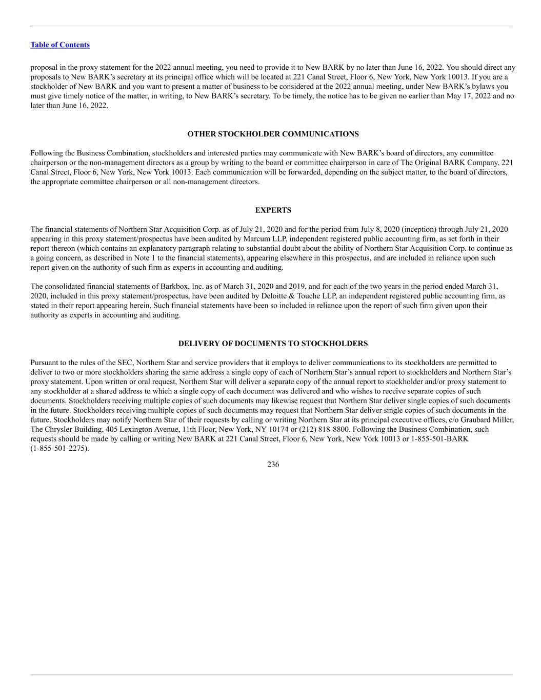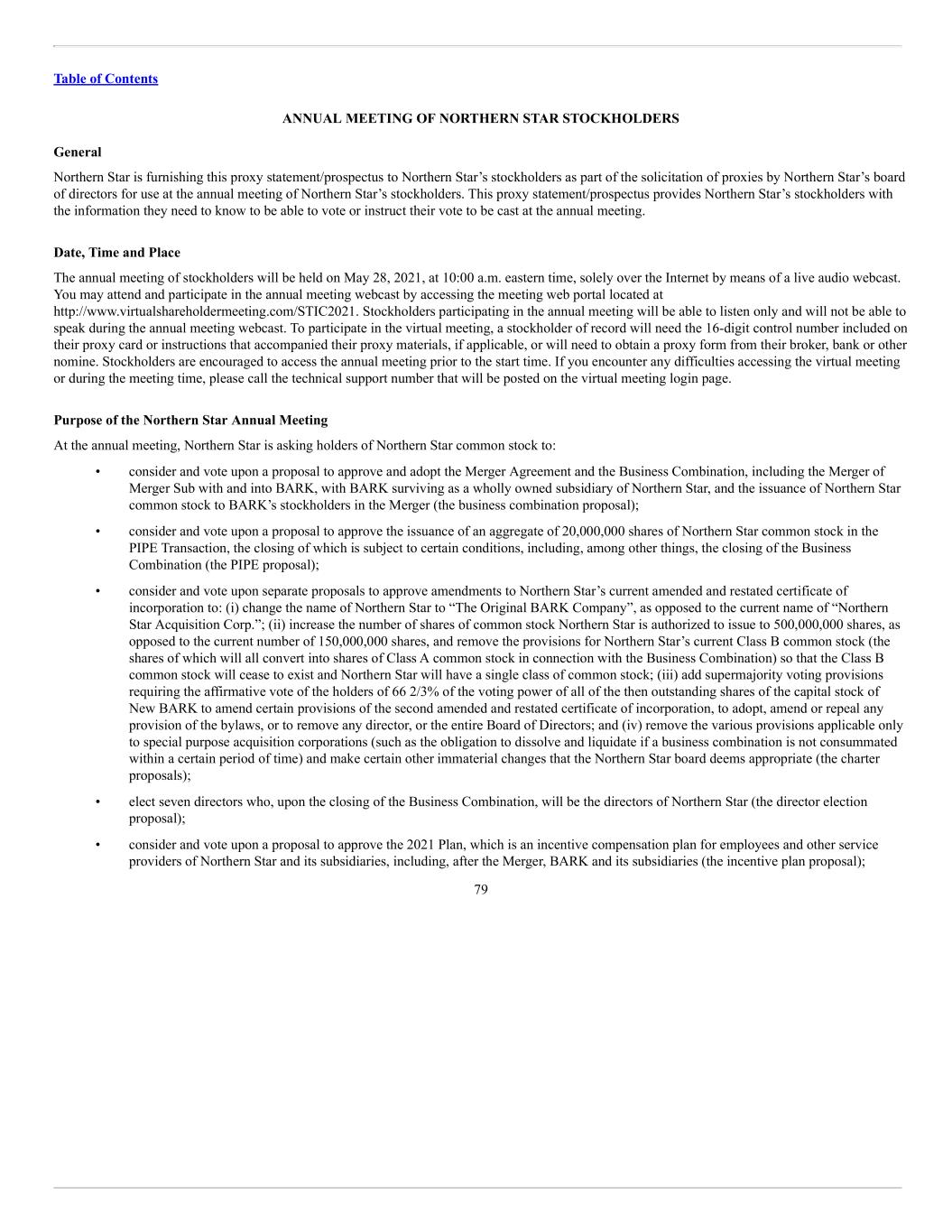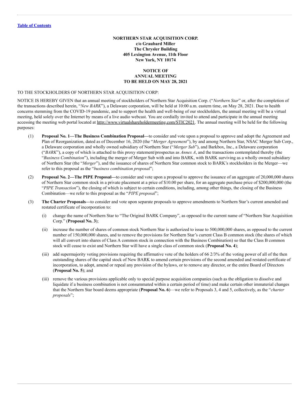 Table of Contents NORTHERN STAR ACQUISITION CORP. c/o Graubard Miller The Chrysler Building 405 Lexington Avenue, 11th Floor New York, NY 10174 NOTICE OF ANNUAL MEETING TO BE HELD ON MAY 28, 2021 TO THE STOCKHOLDERS OF NORTHERN STAR ACQUISITION CORP: NOTICE IS HEREBY GIVEN that an annual meeting of stockholders of Northern Star Acquisition Corp. (“Northern Star” or, after the completion of the transactions described herein, “New BARK”), a Delaware corporation, will be held at 10:00 a.m. eastern time, on May 28, 2021. Due to health concerns stemming from the COVID-19 pandemic, and to support the health and well-being of our stockholders, the annual meeting will be a virtual meeting, held solely over the Internet by means of a live audio webcast. You are cordially invited to attend and participate in the annual meeting accessing the meeting web portal located at http://www.virtualshareholdermeeting.com/STIC2021. The annual meeting will be held for the following purposes:     (1) Proposal No. 1—The Business Combination Proposal—to consider and vote upon a proposal to approve and adopt the Agreement and Plan of Reorganization, dated as of December 16, 2020 (the “Merger Agreement”), by and among Northern Star, NSAC Merger Sub Corp., a Delaware corporation and wholly owned subsidiary of Northern Star (“Merger Sub”), and Barkbox, Inc., a Delaware corporation (“BARK”), a copy of which is attached to this proxy statement/prospectus as Annex A, and the transactions contemplated thereby (the “Business Combination”), including the merger of Merger Sub with and into BARK, with BARK surviving as a wholly owned subsidiary of Northern Star (the “Merger”), and the issuance of shares of Northern Star common stock to BARK’s stockholders in the Merger—we refer to this proposal as the “business combination proposal”;     (2) Proposal No. 2—The PIPE Proposal—to consider and vote upon a proposal to approve the issuance of an aggregate of 20,000,000 shares of Northern Star common stock in a private placement at a price of $10.00 per share, for an aggregate purchase price of $200,000,000 (the “PIPE Transaction”), the closing of which is subject to certain conditions, including, among other things, the closing of the Business Combination—we refer to this proposal as the “PIPE proposal”;     (3) The Charter Proposals—to consider and vote upon separate proposals to approve amendments to Northern Star’s current amended and restated certificate of incorporation to:     (i) change the name of Northern Star to “The Original BARK Company”, as opposed to the current name of “Northern Star Acquisition Corp.” (Proposal No. 3);     (ii) increase the number of shares of common stock Northern Star is authorized to issue to 500,000,000 shares, as opposed to the current number of 150,000,000 shares, and to remove the provisions for Northern Star’s current Class B common stock (the shares of which will all convert into shares of Class A common stock in connection with the Business Combination) so that the Class B common stock will cease to exist and Northern Star will have a single class of common stock (Proposal No. 4);     (iii) add supermajority voting provisions requiring the affirmative vote of the holders of 66 2/3% of the voting power of all of the then outstanding shares of the capital stock of New BARK to amend certain provisions of the second amended and restated certificate of incorporation, to adopt, amend or repeal any provision of the bylaws, or to remove any director, or the entire Board of Directors (Proposal No. 5); and     (iii) remove the various provisions applicable only to special purpose acquisition companies (such as the obligation to dissolve and liquidate if a business combination is not consummated within a certain period of time) and make certain other immaterial changes that the Northern Star board deems appropriate (Proposal No. 6)—we refer to Proposals 3, 4 and 5, collectively, as the “charter proposals”;