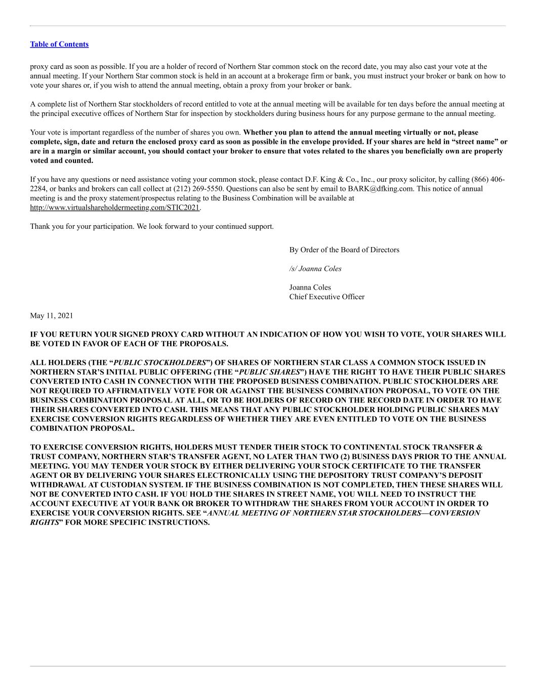 Table of Contents proxy card as soon as possible. If you are a holder of record of Northern Star common stock on the record date, you may also cast your vote at the annual meeting. If your Northern Star common stock is held in an account at a brokerage firm or bank, you must instruct your broker or bank on how to vote your shares or, if you wish to attend the annual meeting, obtain a proxy from your broker or bank. A complete list of Northern Star stockholders of record entitled to vote at the annual meeting will be available for ten days before the annual meeting at the principal executive offices of Northern Star for inspection by stockholders during business hours for any purpose germane to the annual meeting. Your vote is important regardless of the number of shares you own. Whether you plan to attend the annual meeting virtually or not, please complete, sign, date and return the enclosed proxy card as soon as possible in the envelope provided. If your shares are held in “street name” or are in a margin or similar account, you should contact your broker to ensure that votes related to the shares you beneficially own are properly voted and counted. If you have any questions or need assistance voting your common stock, please contact D.F. King & Co., Inc., our proxy solicitor, by calling (866) 406- 2284, or banks and brokers can call collect at (212) 269-5550. Questions can also be sent by email to BARK@dfking.com. This notice of annual meeting is and the proxy statement/prospectus relating to the Business Combination will be available at http://www.virtualshareholdermeeting.com/STIC2021. Thank you for your participation. We look forward to your continued support. By Order of the Board of Directors /s/ Joanna Coles Joanna Coles Chief Executive Officer May 11, 2021 IF YOU RETURN YOUR SIGNED PROXY CARD WITHOUT AN INDICATION OF HOW YOU WISH TO VOTE, YOUR SHARES WILL BE VOTED IN FAVOR OF EACH OF THE PROPOSALS. ALL HOLDERS (THE “PUBLIC STOCKHOLDERS”) OF SHARES OF NORTHERN STAR CLASS A COMMON STOCK ISSUED IN NORTHERN STAR’S INITIAL PUBLIC OFFERING (THE “PUBLIC SHARES”) HAVE THE RIGHT TO HAVE THEIR PUBLIC SHARES CONVERTED INTO CASH IN CONNECTION WITH THE PROPOSED BUSINESS COMBINATION. PUBLIC STOCKHOLDERS ARE NOT REQUIRED TO AFFIRMATIVELY VOTE FOR OR AGAINST THE BUSINESS COMBINATION PROPOSAL, TO VOTE ON THE BUSINESS COMBINATION PROPOSAL AT ALL, OR TO BE HOLDERS OF RECORD ON THE RECORD DATE IN ORDER TO HAVE THEIR SHARES CONVERTED INTO CASH. THIS MEANS THAT ANY PUBLIC STOCKHOLDER HOLDING PUBLIC SHARES MAY EXERCISE CONVERSION RIGHTS REGARDLESS OF WHETHER THEY ARE EVEN ENTITLED TO VOTE ON THE BUSINESS COMBINATION PROPOSAL. TO EXERCISE CONVERSION RIGHTS, HOLDERS MUST TENDER THEIR STOCK TO CONTINENTAL STOCK TRANSFER & TRUST COMPANY, NORTHERN STAR’S TRANSFER AGENT, NO LATER THAN TWO (2) BUSINESS DAYS PRIOR TO THE ANNUAL MEETING. YOU MAY TENDER YOUR STOCK BY EITHER DELIVERING YOUR STOCK CERTIFICATE TO THE TRANSFER AGENT OR BY DELIVERING YOUR SHARES ELECTRONICALLY USING THE DEPOSITORY TRUST COMPANY’S DEPOSIT WITHDRAWAL AT CUSTODIAN SYSTEM. IF THE BUSINESS COMBINATION IS NOT COMPLETED, THEN THESE SHARES WILL NOT BE CONVERTED INTO CASH. IF YOU HOLD THE SHARES IN STREET NAME, YOU WILL NEED TO INSTRUCT THE ACCOUNT EXECUTIVE AT YOUR BANK OR BROKER TO WITHDRAW THE SHARES FROM YOUR ACCOUNT IN ORDER TO EXERCISE YOUR CONVERSION RIGHTS. SEE “ANNUAL MEETING OF NORTHERN STAR STOCKHOLDERS—CONVERSION RIGHTS” FOR MORE SPECIFIC INSTRUCTIONS.