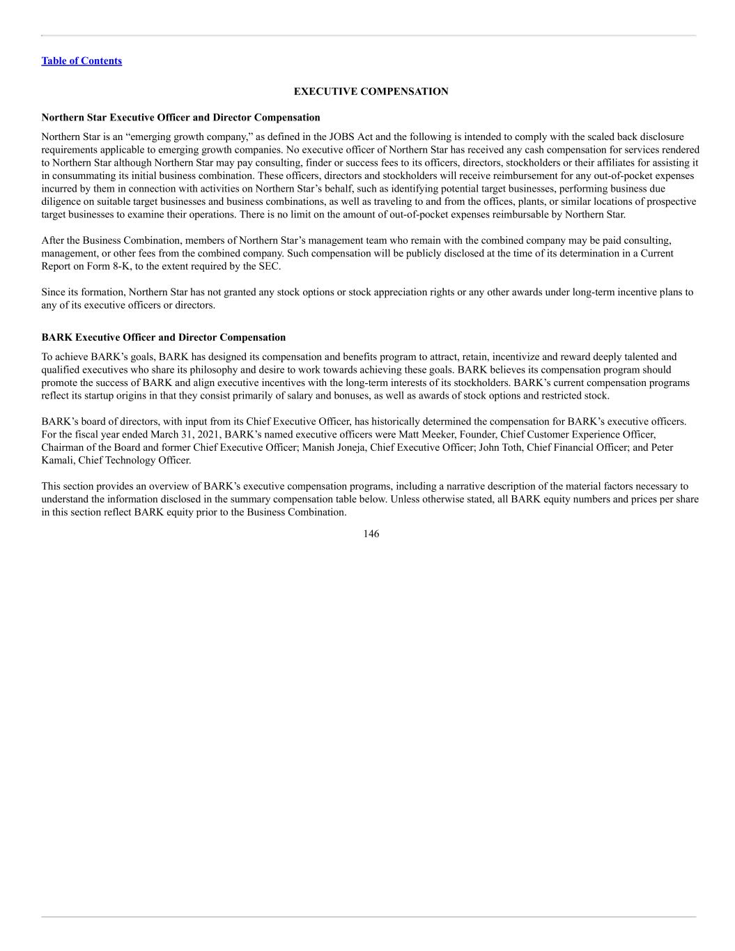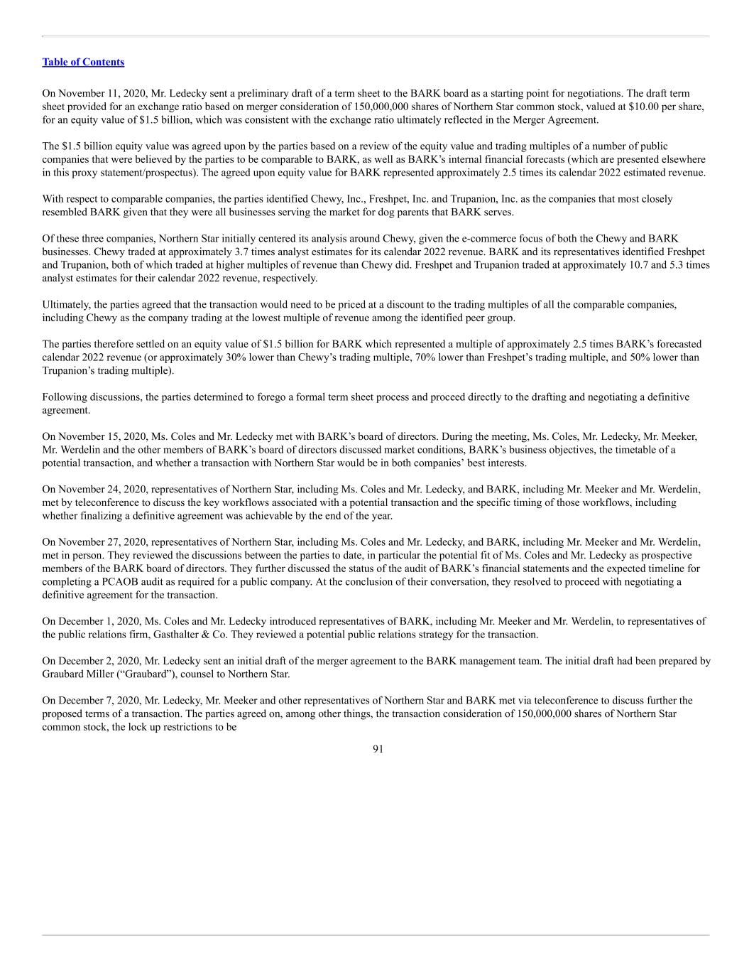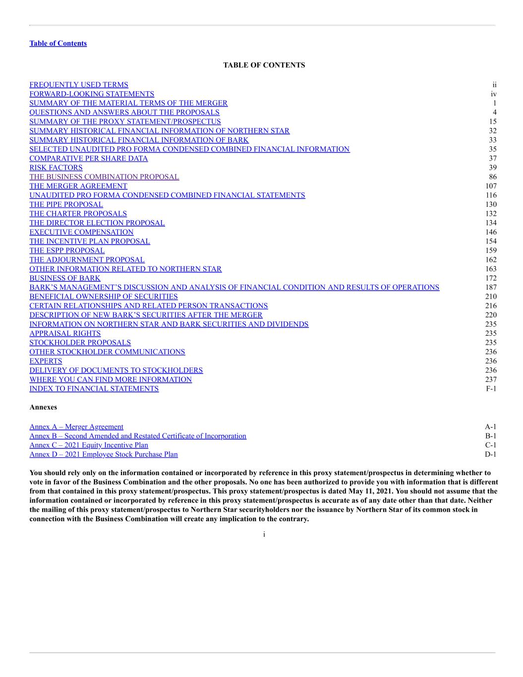 Table of Contents TABLE OF CONTENTS   FREQUENTLY USED TERMS      ii  FORWARD-LOOKING STATEMENTS      iv  SUMMARY OF THE MATERIAL TERMS OF THE MERGER      1  QUESTIONS AND ANSWERS ABOUT THE PROPOSALS      4  SUMMARY OF THE PROXY STATEMENT/PROSPECTUS      15  SUMMARY HISTORICAL FINANCIAL INFORMATION OF NORTHERN STAR      32  SUMMARY HISTORICAL FINANCIAL INFORMATION OF BARK      33  SELECTED UNAUDITED PRO FORMA CONDENSED COMBINED FINANCIAL INFORMATION      35  COMPARATIVE PER SHARE DATA      37  RISK FACTORS      39  THE BUSINESS COMBINATION PROPOSAL      86  THE MERGER AGREEMENT     107  UNAUDITED PRO FORMA CONDENSED COMBINED FINANCIAL STATEMENTS     116  THE PIPE PROPOSAL     130  THE CHARTER PROPOSALS     132  THE DIRECTOR ELECTION PROPOSAL     134  EXECUTIVE COMPENSATION     146  THE INCENTIVE PLAN PROPOSAL     154  THE ESPP PROPOSAL     159  THE ADJOURNMENT PROPOSAL     162  OTHER INFORMATION RELATED TO NORTHERN STAR     163  BUSINESS OF BARK     172  BARK’S MANAGEMENT’S DISCUSSION AND ANALYSIS OF FINANCIAL CONDITION AND RESULTS OF OPERATIONS     187  BENEFICIAL OWNERSHIP OF SECURITIES     210  CERTAIN RELATIONSHIPS AND RELATED PERSON TRANSACTIONS     216  DESCRIPTION OF NEW BARK’S SECURITIES AFTER THE MERGER     220  INFORMATION ON NORTHERN STAR AND BARK SECURITIES AND DIVIDENDS     235  APPRAISAL RIGHTS     235  STOCKHOLDER PROPOSALS     235  OTHER STOCKHOLDER COMMUNICATIONS     236  EXPERTS     236  DELIVERY OF DOCUMENTS TO STOCKHOLDERS     236  WHERE YOU CAN FIND MORE INFORMATION     237  INDEX TO FINANCIAL STATEMENTS      F-1  Annexes   Annex A – Merger Agreement     A-1  Annex B – Second Amended and Restated Certificate of Incorporation     B-1  Annex C – 2021 Equity Incentive Plan     C-1  Annex D – 2021 Employee Stock Purchase Plan     D-1  You should rely only on the information contained or incorporated by reference in this proxy statement/prospectus in determining whether to vote in favor of the Business Combination and the other proposals. No one has been authorized to provide you with information that is different from that contained in this proxy statement/prospectus. This proxy statement/prospectus is dated May 11, 2021. You should not assume that the information contained or incorporated by reference in this proxy statement/prospectus is accurate as of any date other than that date. Neither the mailing of this proxy statement/prospectus to Northern Star securityholders nor the issuance by Northern Star of its common stock in connection with the Business Combination will create any implication to the contrary.   i