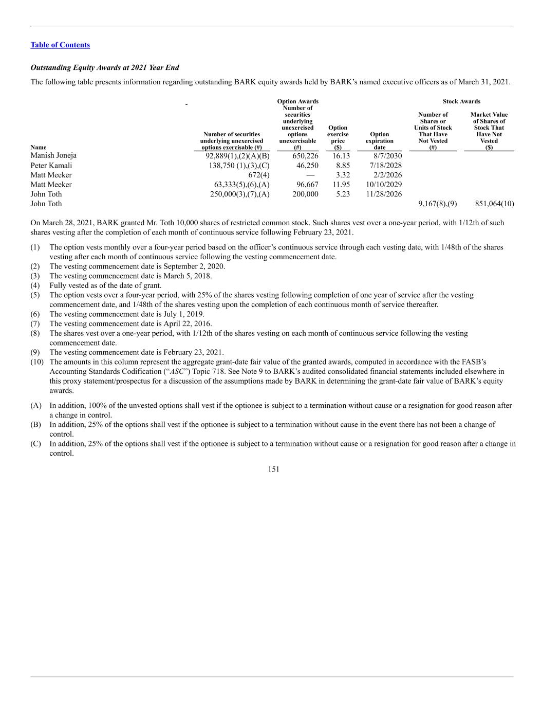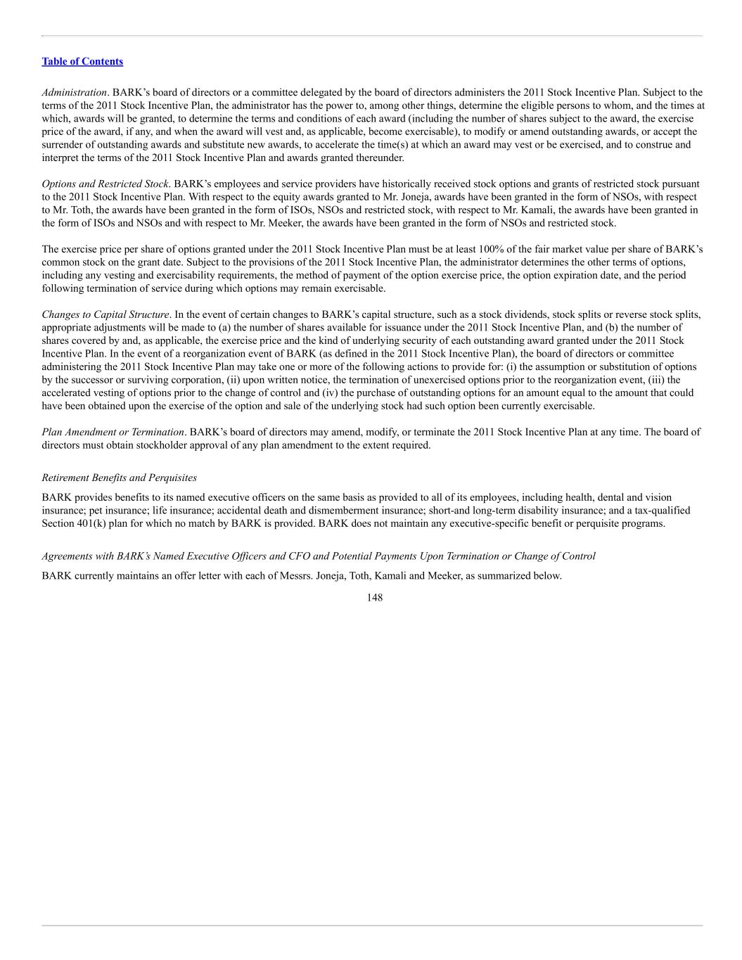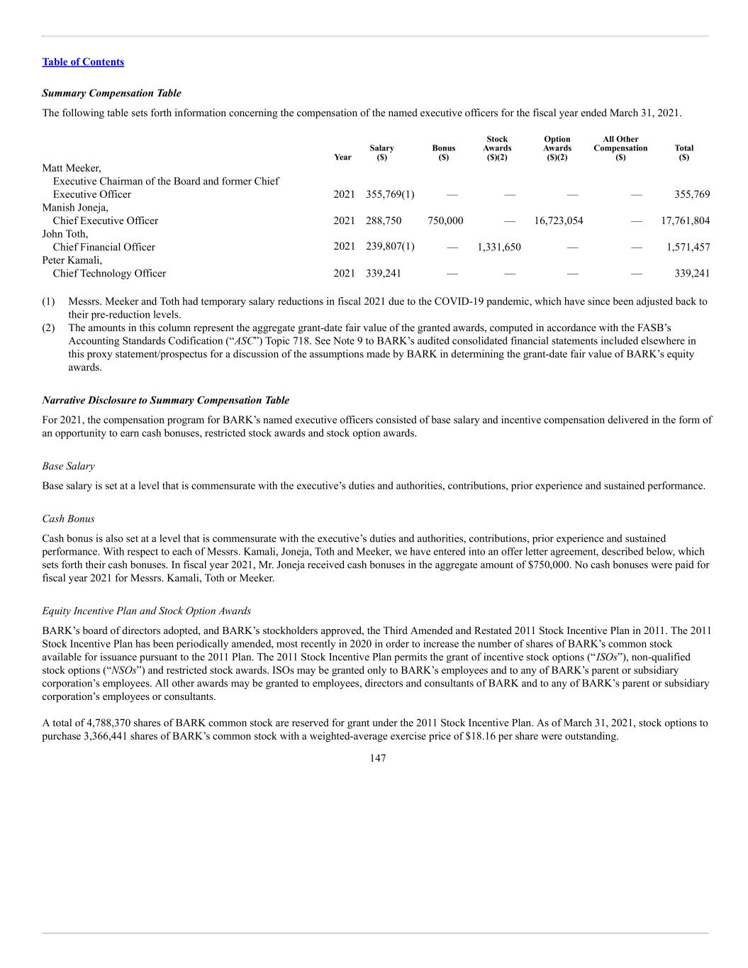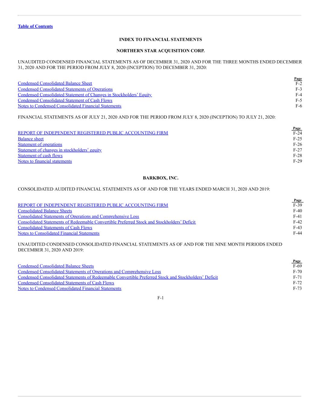Table of Contents TABLE OF CONTENTS   FREQUENTLY USED TERMS      ii  FORWARD-LOOKING STATEMENTS      iv  SUMMARY OF THE MATERIAL TERMS OF THE MERGER      1  QUESTIONS AND ANSWERS ABOUT THE PROPOSALS      4  SUMMARY OF THE PROXY STATEMENT/PROSPECTUS      15  SUMMARY HISTORICAL FINANCIAL INFORMATION OF NORTHERN STAR      32  SUMMARY HISTORICAL FINANCIAL INFORMATION OF BARK      33  SELECTED UNAUDITED PRO FORMA CONDENSED COMBINED FINANCIAL INFORMATION      35  COMPARATIVE PER SHARE DATA      37  RISK FACTORS      39  THE BUSINESS COMBINATION PROPOSAL      86  THE MERGER AGREEMENT     107  UNAUDITED PRO FORMA CONDENSED COMBINED FINANCIAL STATEMENTS     116  THE PIPE PROPOSAL     130  THE CHARTER PROPOSALS     132  THE DIRECTOR ELECTION PROPOSAL     134  EXECUTIVE COMPENSATION     146  THE INCENTIVE PLAN PROPOSAL     154  THE ESPP PROPOSAL     159  THE ADJOURNMENT PROPOSAL     162  OTHER INFORMATION RELATED TO NORTHERN STAR     163  BUSINESS OF BARK     172  BARK’S MANAGEMENT’S DISCUSSION AND ANALYSIS OF FINANCIAL CONDITION AND RESULTS OF OPERATIONS     187  BENEFICIAL OWNERSHIP OF SECURITIES     210  CERTAIN RELATIONSHIPS AND RELATED PERSON TRANSACTIONS     216  DESCRIPTION OF NEW BARK’S SECURITIES AFTER THE MERGER     220  INFORMATION ON NORTHERN STAR AND BARK SECURITIES AND DIVIDENDS     235  APPRAISAL RIGHTS     235  STOCKHOLDER PROPOSALS     235  OTHER STOCKHOLDER COMMUNICATIONS     236  EXPERTS     236  DELIVERY OF DOCUMENTS TO STOCKHOLDERS     236  WHERE YOU CAN FIND MORE INFORMATION     237  INDEX TO FINANCIAL STATEMENTS      F-1  Annexes   Annex A – Merger Agreement     A-1  Annex B – Second Amended and Restated Certificate of Incorporation     B-1  Annex C – 2021 Equity Incentive Plan     C-1  Annex D – 2021 Employee Stock Purchase Plan     D-1  You should rely only on the information contained or incorporated by reference in this proxy statement/prospectus in determining whether to vote in favor of the Business Combination and the other proposals. No one has been authorized to provide you with information that is different from that contained in this proxy statement/prospectus. This proxy statement/prospectus is dated May 11, 2021. You should not assume that the information contained or incorporated by reference in this proxy statement/prospectus is accurate as of any date other than that date. Neither the mailing of this proxy statement/prospectus to Northern Star securityholders nor the issuance by Northern Star of its common stock in connection with the Business Combination will create any implication to the contrary.   i