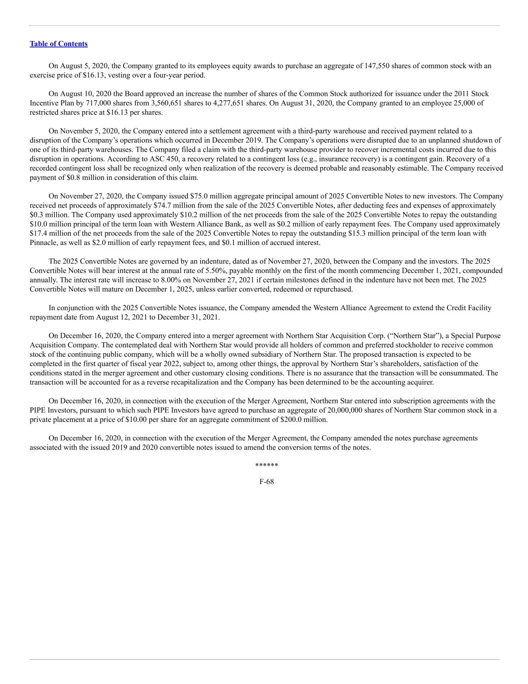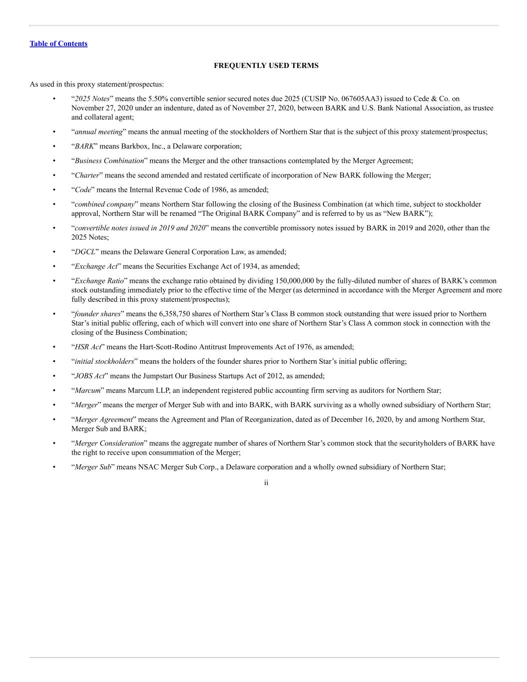 Table of Contents FREQUENTLY USED TERMS As used in this proxy statement/prospectus:     •   “2025 Notes” means the 5.50% convertible senior secured notes due 2025 (CUSIP No. 067605AA3) issued to Cede & Co. on November 27, 2020 under an indenture, dated as of November 27, 2020, between BARK and U.S. Bank National Association, as trustee and collateral agent;     •   “annual meeting” means the annual meeting of the stockholders of Northern Star that is the subject of this proxy statement/prospectus;     •   “BARK” means Barkbox, Inc., a Delaware corporation;     •   “Business Combination” means the Merger and the other transactions contemplated by the Merger Agreement;     •   “Charter” means the second amended and restated certificate of incorporation of New BARK following the Merger;     •   “Code” means the Internal Revenue Code of 1986, as amended;     •   “combined company” means Northern Star following the closing of the Business Combination (at which time, subject to stockholder approval, Northern Star will be renamed “The Original BARK Company” and is referred to by us as “New BARK”);     •   “convertible notes issued in 2019 and 2020” means the convertible promissory notes issued by BARK in 2019 and 2020, other than the 2025 Notes;     •   “DGCL” means the Delaware General Corporation Law, as amended;     •   “Exchange Act” means the Securities Exchange Act of 1934, as amended;     •   “Exchange Ratio” means the exchange ratio obtained by dividing 150,000,000 by the fully-diluted number of shares of BARK’s common stock outstanding immediately prior to the effective time of the Merger (as determined in accordance with the Merger Agreement and more fully described in this proxy statement/prospectus);     •   “founder shares” means the 6,358,750 shares of Northern Star’s Class B common stock outstanding that were issued prior to Northern Star’s initial public offering, each of which will convert into one share of Northern Star’s Class A common stock in connection with the closing of the Business Combination;     •   “HSR Act” means the Hart-Scott-Rodino Antitrust Improvements Act of 1976, as amended;     •   “initial stockholders” means the holders of the founder shares prior to Northern Star’s initial public offering;     •   “JOBS Act” means the Jumpstart Our Business Startups Act of 2012, as amended;     •   “Marcum” means Marcum LLP, an independent registered public accounting firm serving as auditors for Northern Star;     •   “Merger” means the merger of Merger Sub with and into BARK, with BARK surviving as a wholly owned subsidiary of Northern Star;     •   “Merger Agreement” means the Agreement and Plan of Reorganization, dated as of December 16, 2020, by and among Northern Star, Merger Sub and BARK;     •   “Merger Consideration” means the aggregate number of shares of Northern Star’s common stock that the securityholders of BARK have the right to receive upon consummation of the Merger;     •   “Merger Sub” means NSAC Merger Sub Corp., a Delaware corporation and a wholly owned subsidiary of Northern Star;   ii