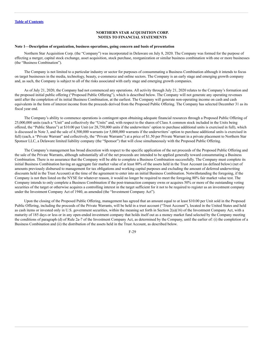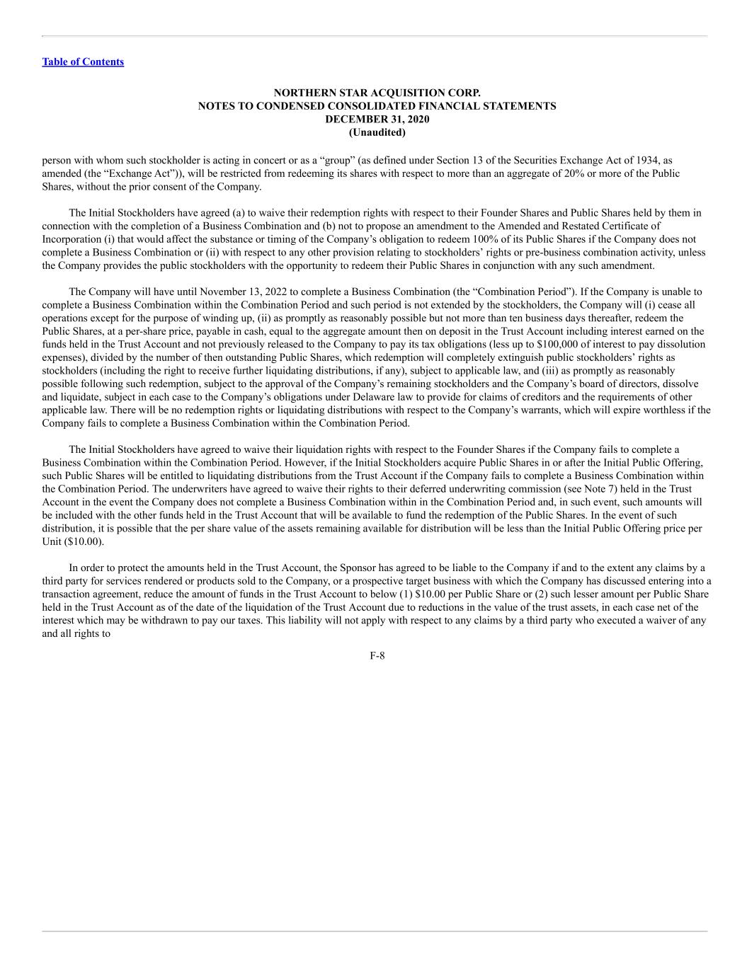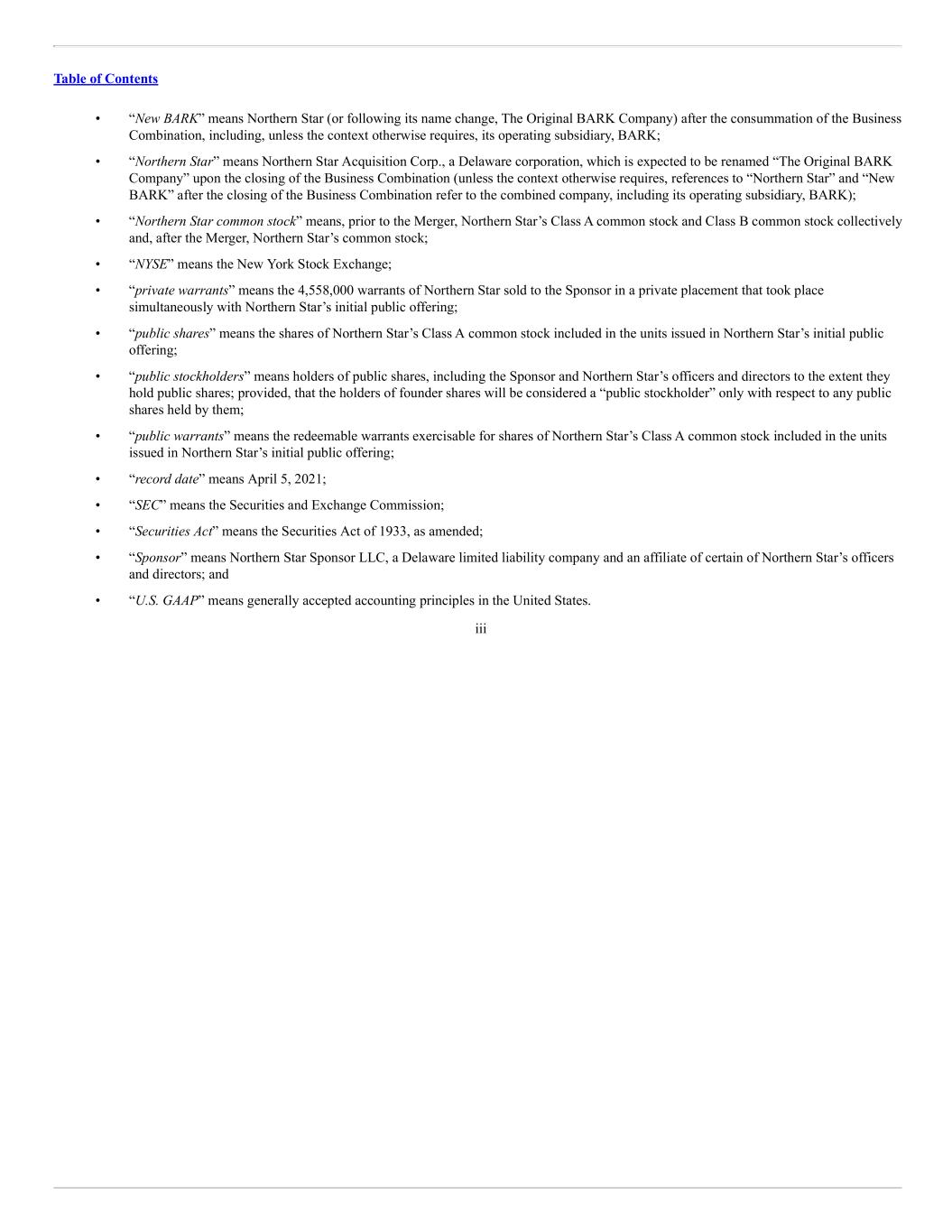 Table of Contents   •   “New BARK” means Northern Star (or following its name change, The Original BARK Company) after the consummation of the Business Combination, including, unless the context otherwise requires, its operating subsidiary, BARK;     •   “Northern Star” means Northern Star Acquisition Corp., a Delaware corporation, which is expected to be renamed “The Original BARK Company” upon the closing of the Business Combination (unless the context otherwise requires, references to “Northern Star” and “New BARK” after the closing of the Business Combination refer to the combined company, including its operating subsidiary, BARK);     •   “Northern Star common stock” means, prior to the Merger, Northern Star’s Class A common stock and Class B common stock collectively and, after the Merger, Northern Star’s common stock;     •   “NYSE” means the New York Stock Exchange;     •   “private warrants” means the 4,558,000 warrants of Northern Star sold to the Sponsor in a private placement that took place simultaneously with Northern Star’s initial public offering;     •   “public shares” means the shares of Northern Star’s Class A common stock included in the units issued in Northern Star’s initial public offering;     •   “public stockholders” means holders of public shares, including the Sponsor and Northern Star’s officers and directors to the extent they hold public shares; provided, that the holders of founder shares will be considered a “public stockholder” only with respect to any public shares held by them;     •   “public warrants” means the redeemable warrants exercisable for shares of Northern Star’s Class A common stock included in the units issued in Northern Star’s initial public offering;     •   “record date” means April 5, 2021;     •   “SEC” means the Securities and Exchange Commission;     •   “Securities Act” means the Securities Act of 1933, as amended;     •   “Sponsor” means Northern Star Sponsor LLC, a Delaware limited liability company and an affiliate of certain of Northern Star’s officers and directors; and     •   “U.S. GAAP” means generally accepted accounting principles in the United States.   iii