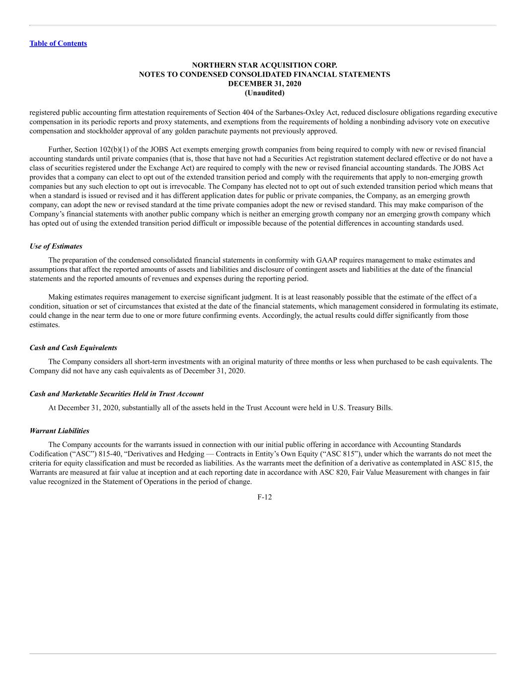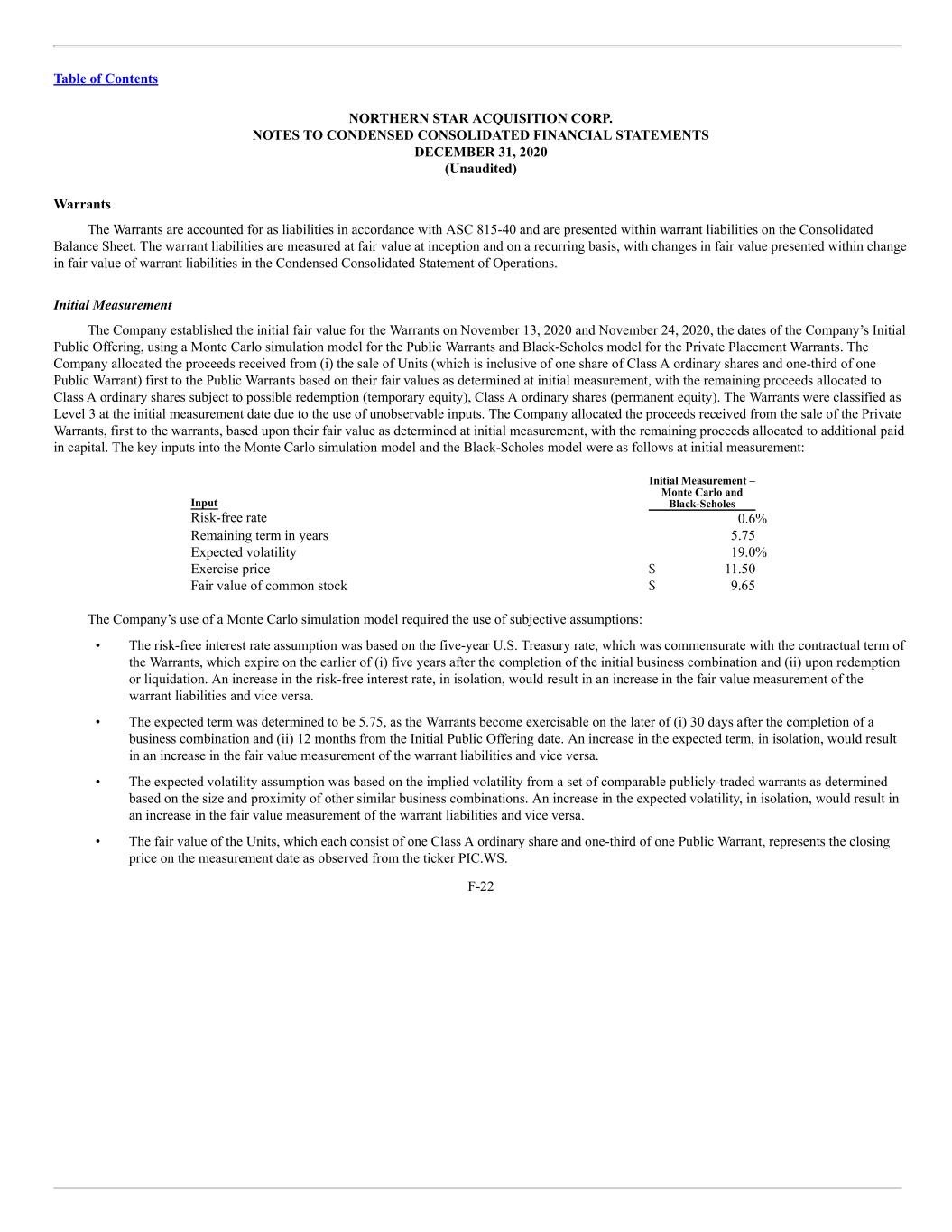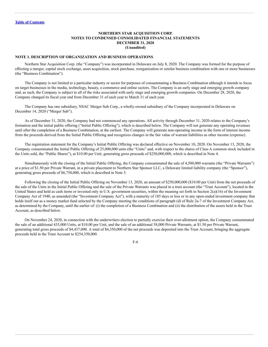 Table of Contents   •   “New BARK” means Northern Star (or following its name change, The Original BARK Company) after the consummation of the Business Combination, including, unless the context otherwise requires, its operating subsidiary, BARK;     •   “Northern Star” means Northern Star Acquisition Corp., a Delaware corporation, which is expected to be renamed “The Original BARK Company” upon the closing of the Business Combination (unless the context otherwise requires, references to “Northern Star” and “New BARK” after the closing of the Business Combination refer to the combined company, including its operating subsidiary, BARK);     •   “Northern Star common stock” means, prior to the Merger, Northern Star’s Class A common stock and Class B common stock collectively and, after the Merger, Northern Star’s common stock;     •   “NYSE” means the New York Stock Exchange;     •   “private warrants” means the 4,558,000 warrants of Northern Star sold to the Sponsor in a private placement that took place simultaneously with Northern Star’s initial public offering;     •   “public shares” means the shares of Northern Star’s Class A common stock included in the units issued in Northern Star’s initial public offering;     •   “public stockholders” means holders of public shares, including the Sponsor and Northern Star’s officers and directors to the extent they hold public shares; provided, that the holders of founder shares will be considered a “public stockholder” only with respect to any public shares held by them;     •   “public warrants” means the redeemable warrants exercisable for shares of Northern Star’s Class A common stock included in the units issued in Northern Star’s initial public offering;     •   “record date” means April 5, 2021;     •   “SEC” means the Securities and Exchange Commission;     •   “Securities Act” means the Securities Act of 1933, as amended;     •   “Sponsor” means Northern Star Sponsor LLC, a Delaware limited liability company and an affiliate of certain of Northern Star’s officers and directors; and     •   “U.S. GAAP” means generally accepted accounting principles in the United States.   iii