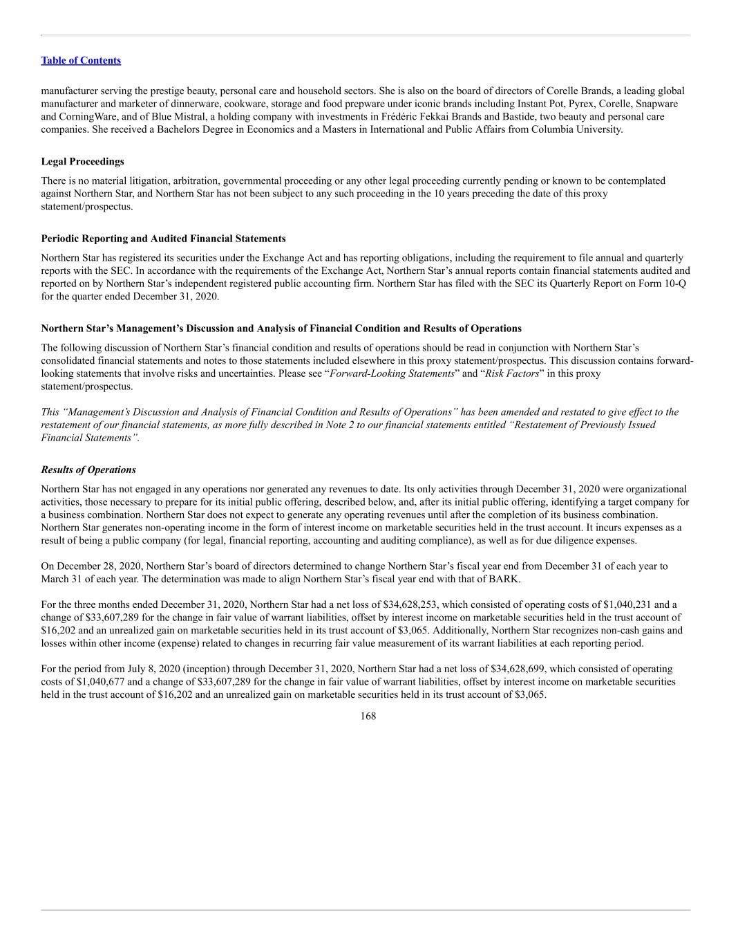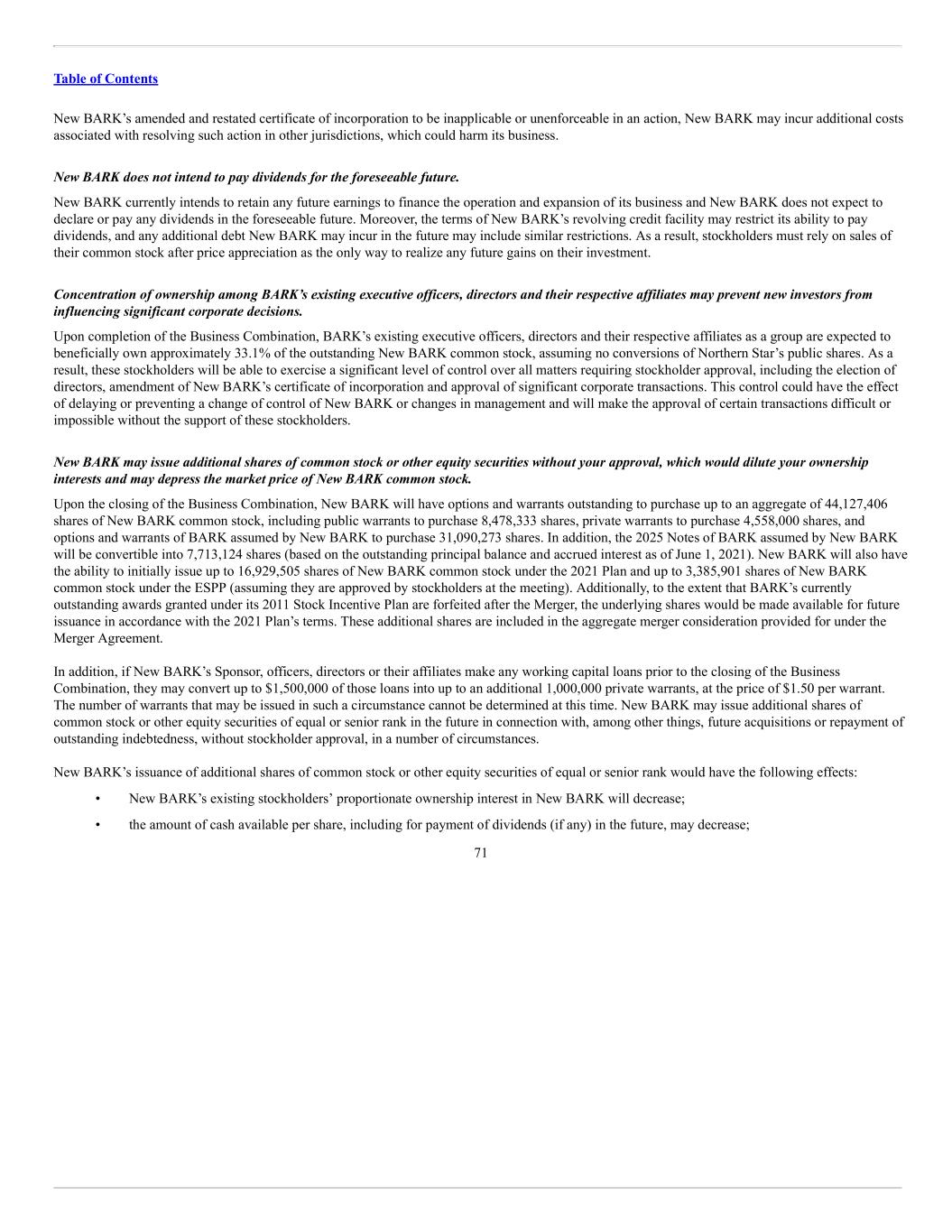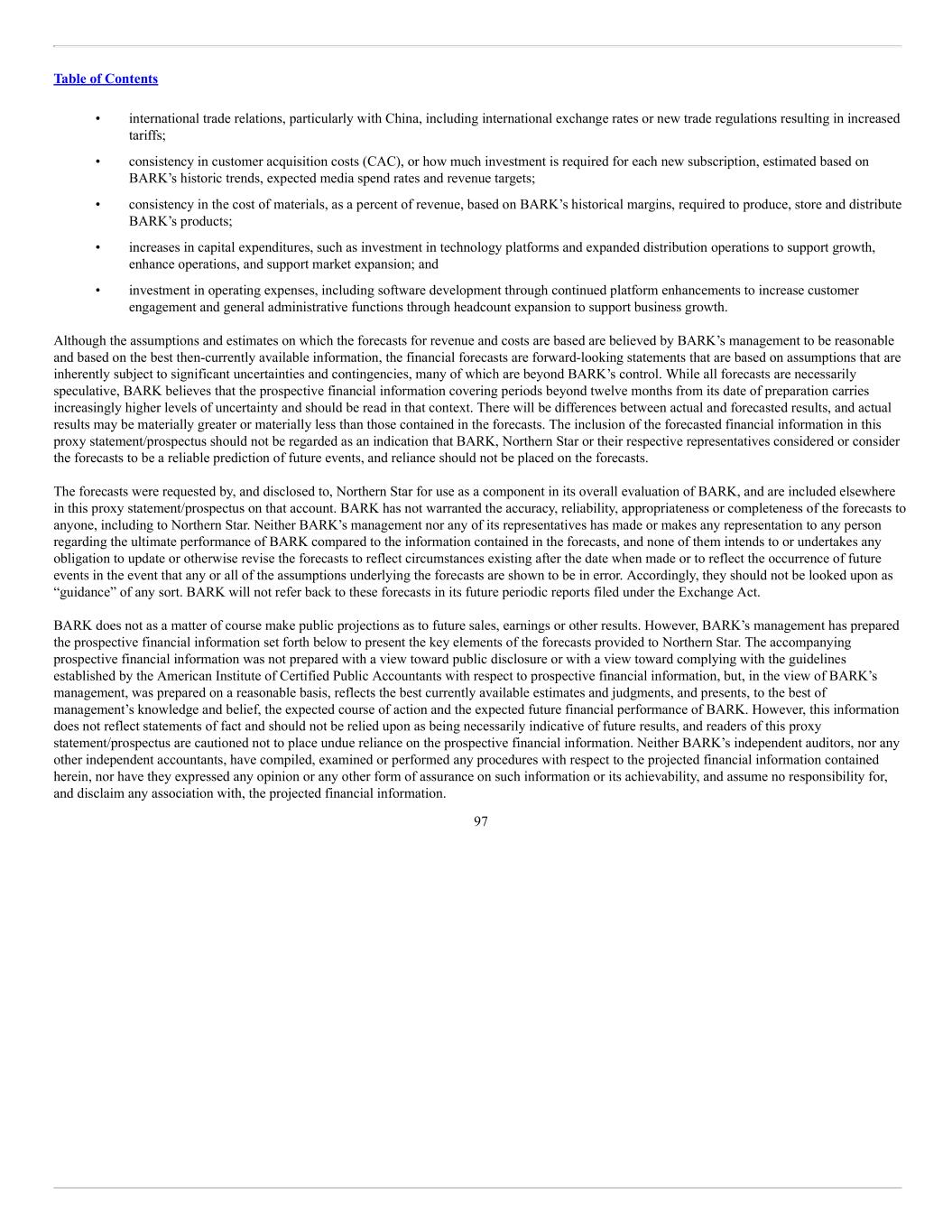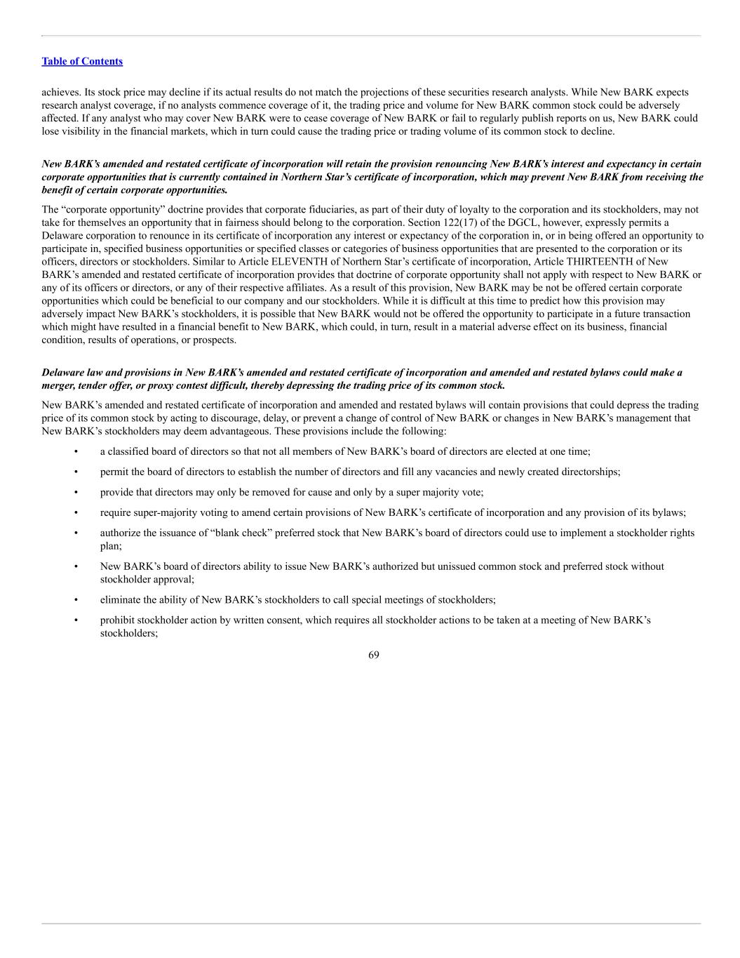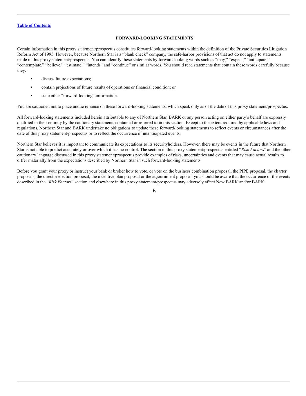 Table of Contents FORWARD-LOOKING STATEMENTS Certain information in this proxy statement/prospectus constitutes forward-looking statements within the definition of the Private Securities Litigation Reform Act of 1995. However, because Northern Star is a “blank check” company, the safe-harbor provisions of that act do not apply to statements made in this proxy statement/prospectus. You can identify these statements by forward-looking words such as “may,” “expect,” “anticipate,” “contemplate,” “believe,” “estimate,” “intends” and “continue” or similar words. You should read statements that contain these words carefully because they:     •   discuss future expectations;     •   contain projections of future results of operations or financial condition; or     •   state other “forward-looking” information. You are cautioned not to place undue reliance on these forward-looking statements, which speak only as of the date of this proxy statement/prospectus. All forward-looking statements included herein attributable to any of Northern Star, BARK or any person acting on either party’s behalf are expressly qualified in their entirety by the cautionary statements contained or referred to in this section. Except to the extent required by applicable laws and regulations, Northern Star and BARK undertake no obligations to update these forward-looking statements to reflect events or circumstances after the date of this proxy statement/prospectus or to reflect the occurrence of unanticipated events. Northern Star believes it is important to communicate its expectations to its securityholders. However, there may be events in the future that Northern Star is not able to predict accurately or over which it has no control. The section in this proxy statement/prospectus entitled “Risk Factors” and the other cautionary language discussed in this proxy statement/prospectus provide examples of risks, uncertainties and events that may cause actual results to differ materially from the expectations described by Northern Star in such forward-looking statements. Before you grant your proxy or instruct your bank or broker how to vote, or vote on the business combination proposal, the PIPE proposal, the charter proposals, the director election proposal, the incentive plan proposal or the adjournment proposal, you should be aware that the occurrence of the events described in the “Risk Factors” section and elsewhere in this proxy statement/prospectus may adversely affect New BARK and/or BARK.   iv