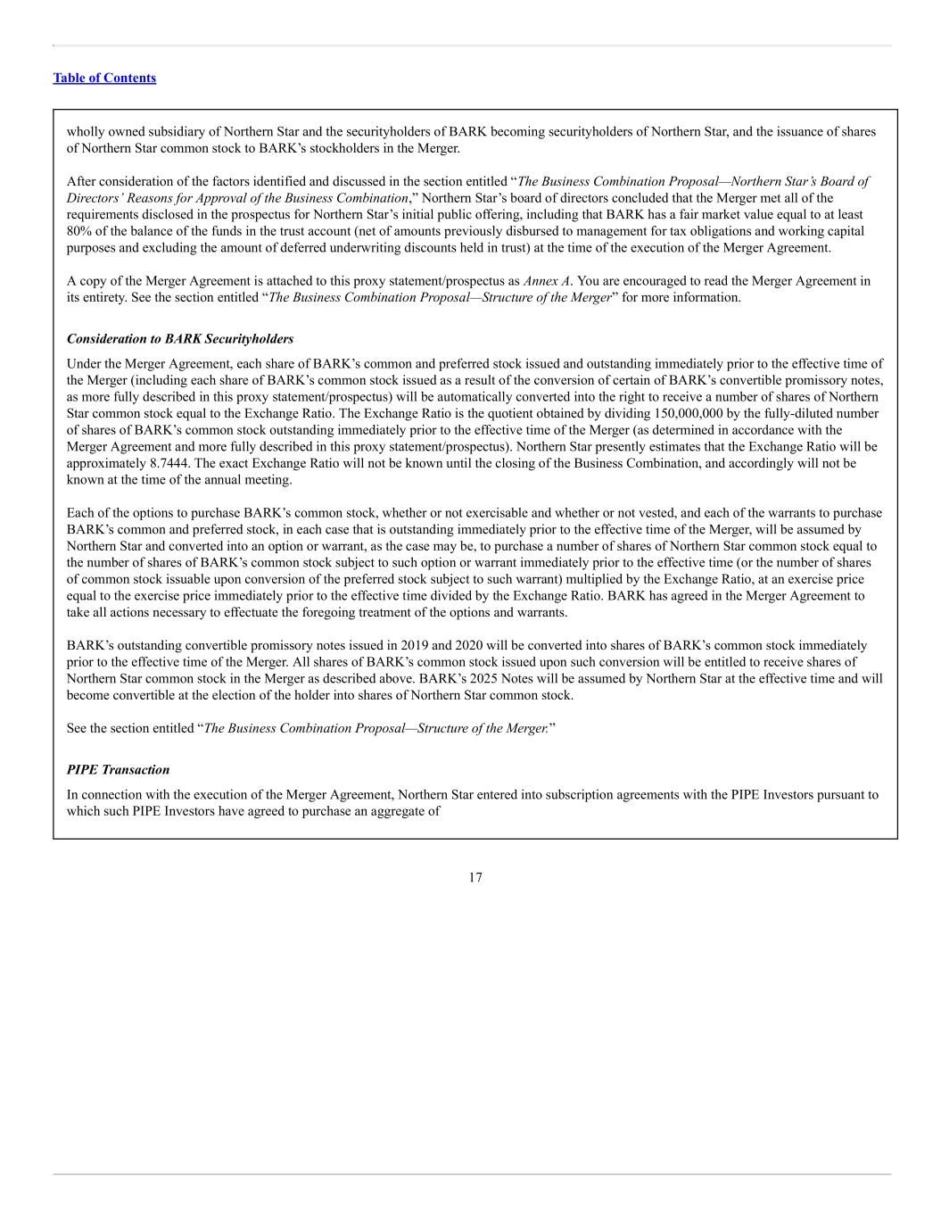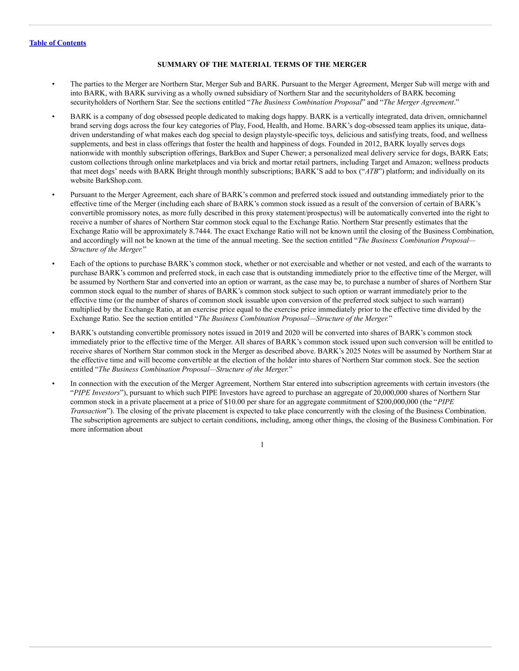 Table of Contents SUMMARY OF THE MATERIAL TERMS OF THE MERGER     •   The parties to the Merger are Northern Star, Merger Sub and BARK. Pursuant to the Merger Agreement, Merger Sub will merge with and into BARK, with BARK surviving as a wholly owned subsidiary of Northern Star and the securityholders of BARK becoming securityholders of Northern Star. See the sections entitled “The Business Combination Proposal” and “The Merger Agreement.”     •   BARK is a company of dog obsessed people dedicated to making dogs happy. BARK is a vertically integrated, data driven, omnichannel brand serving dogs across the four key categories of Play, Food, Health, and Home. BARK’s dog-obsessed team applies its unique, data- driven understanding of what makes each dog special to design playstyle-specific toys, delicious and satisfying treats, food, and wellness supplements, and best in class offerings that foster the health and happiness of dogs. Founded in 2012, BARK loyally serves dogs nationwide with monthly subscription offerings, BarkBox and Super Chewer; a personalized meal delivery service for dogs, BARK Eats; custom collections through online marketplaces and via brick and mortar retail partners, including Target and Amazon; wellness products that meet dogs’ needs with BARK Bright through monthly subscriptions; BARK’S add to box (“ATB”) platform; and individually on its website BarkShop.com.     •   Pursuant to the Merger Agreement, each share of BARK’s common and preferred stock issued and outstanding immediately prior to the effective time of the Merger (including each share of BARK’s common stock issued as a result of the conversion of certain of BARK’s convertible promissory notes, as more fully described in this proxy statement/prospectus) will be automatically converted into the right to receive a number of shares of Northern Star common stock equal to the Exchange Ratio. Northern Star presently estimates that the Exchange Ratio will be approximately 8.7444. The exact Exchange Ratio will not be known until the closing of the Business Combination, and accordingly will not be known at the time of the annual meeting. See the section entitled “The Business Combination Proposal— Structure of the Merger.”     •   Each of the options to purchase BARK’s common stock, whether or not exercisable and whether or not vested, and each of the warrants to purchase BARK’s common and preferred stock, in each case that is outstanding immediately prior to the effective time of the Merger, will be assumed by Northern Star and converted into an option or warrant, as the case may be, to purchase a number of shares of Northern Star common stock equal to the number of shares of BARK’s common stock subject to such option or warrant immediately prior to the effective time (or the number of shares of common stock issuable upon conversion of the preferred stock subject to such warrant) multiplied by the Exchange Ratio, at an exercise price equal to the exercise price immediately prior to the effective time divided by the Exchange Ratio. See the section entitled “The Business Combination Proposal—Structure of the Merger.”     •   BARK’s outstanding convertible promissory notes issued in 2019 and 2020 will be converted into shares of BARK’s common stock immediately prior to the effective time of the Merger. All shares of BARK’s common stock issued upon such conversion will be entitled to receive shares of Northern Star common stock in the Merger as described above. BARK’s 2025 Notes will be assumed by Northern Star at the effective time and will become convertible at the election of the holder into shares of Northern Star common stock. See the section entitled “The Business Combination Proposal—Structure of the Merger.”     •   In connection with the execution of the Merger Agreement, Northern Star entered into subscription agreements with certain investors (the “PIPE Investors”), pursuant to which such PIPE Investors have agreed to purchase an aggregate of 20,000,000 shares of Northern Star common stock in a private placement at a price of $10.00 per share for an aggregate commitment of $200,000,000 (the “PIPE Transaction”). The closing of the private placement is expected to take place concurrently with the closing of the Business Combination. The subscription agreements are subject to certain conditions, including, among other things, the closing of the Business Combination. For more information about   1