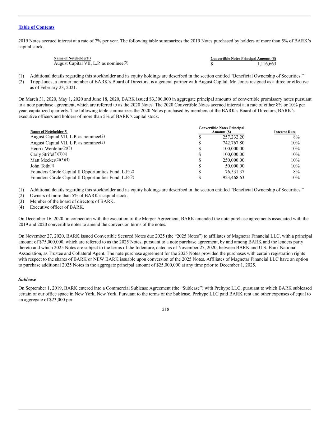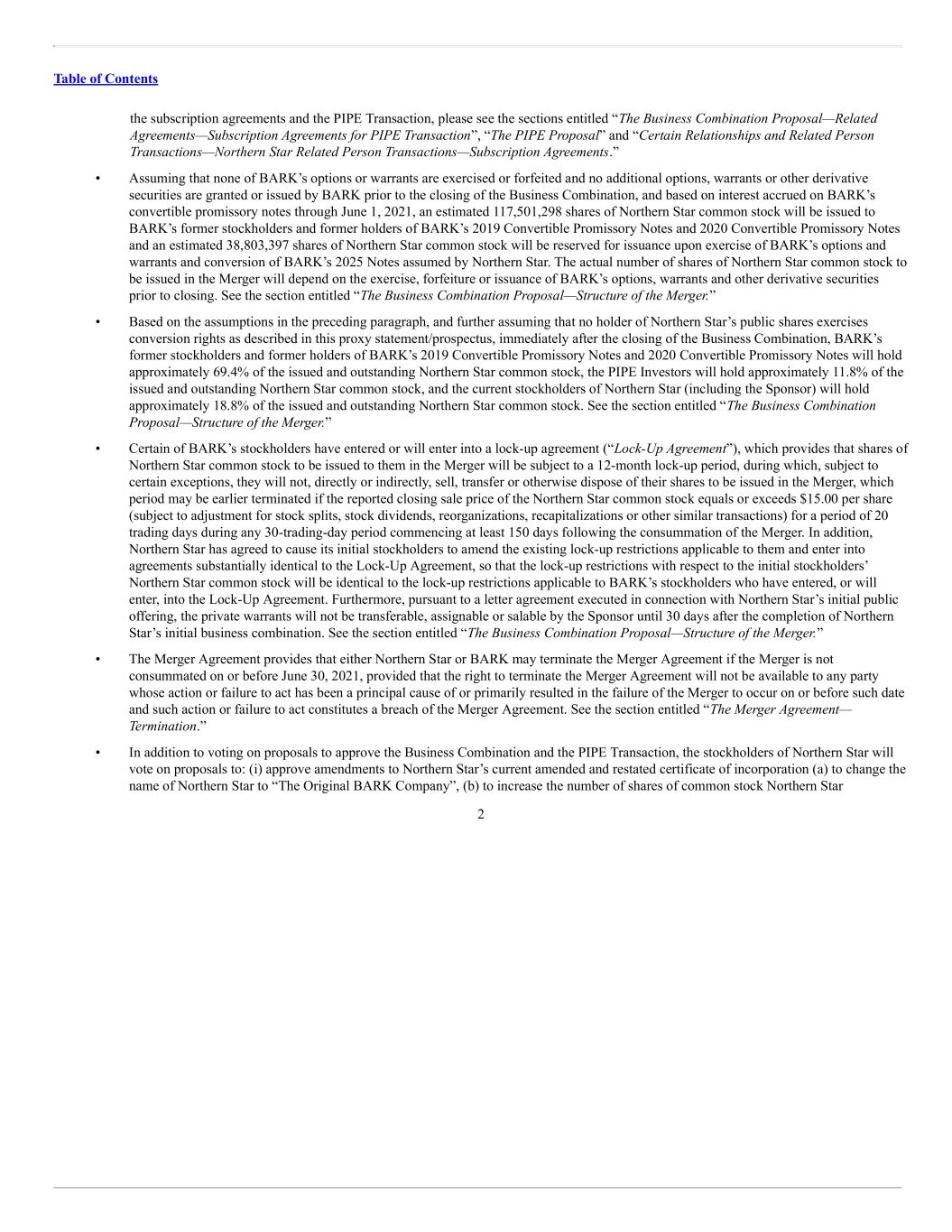 Table of Contents   the subscription agreements and the PIPE Transaction, please see the sections entitled “The Business Combination Proposal—Related Agreements—Subscription Agreements for PIPE Transaction”, “The PIPE Proposal” and “Certain Relationships and Related Person Transactions—Northern Star Related Person Transactions—Subscription Agreements.”     •   Assuming that none of BARK’s options or warrants are exercised or forfeited and no additional options, warrants or other derivative securities are granted or issued by BARK prior to the closing of the Business Combination, and based on interest accrued on BARK’s convertible promissory notes through June 1, 2021, an estimated 117,501,298 shares of Northern Star common stock will be issued to BARK’s former stockholders and former holders of BARK’s 2019 Convertible Promissory Notes and 2020 Convertible Promissory Notes and an estimated 38,803,397 shares of Northern Star common stock will be reserved for issuance upon exercise of BARK’s options and warrants and conversion of BARK’s 2025 Notes assumed by Northern Star. The actual number of shares of Northern Star common stock to be issued in the Merger will depend on the exercise, forfeiture or issuance of BARK’s options, warrants and other derivative securities prior to closing. See the section entitled “The Business Combination Proposal—Structure of the Merger.”     •   Based on the assumptions in the preceding paragraph, and further assuming that no holder of Northern Star’s public shares exercises conversion rights as described in this proxy statement/prospectus, immediately after the closing of the Business Combination, BARK’s former stockholders and former holders of BARK’s 2019 Convertible Promissory Notes and 2020 Convertible Promissory Notes will hold approximately 69.4% of the issued and outstanding Northern Star common stock, the PIPE Investors will hold approximately 11.8% of the issued and outstanding Northern Star common stock, and the current stockholders of Northern Star (including the Sponsor) will hold approximately 18.8% of the issued and outstanding Northern Star common stock. See the section entitled “The Business Combination Proposal—Structure of the Merger.”     •   Certain of BARK’s stockholders have entered or will enter into a lock-up agreement (“Lock-Up Agreement”), which provides that shares of Northern Star common stock to be issued to them in the Merger will be subject to a 12-month lock-up period, during which, subject to certain exceptions, they will not, directly or indirectly, sell, transfer or otherwise dispose of their shares to be issued in the Merger, which period may be earlier terminated if the reported closing sale price of the Northern Star common stock equals or exceeds $15.00 per share (subject to adjustment for stock splits, stock dividends, reorganizations, recapitalizations or other similar transactions) for a period of 20 trading days during any 30-trading-day period commencing at least 150 days following the consummation of the Merger. In addition, Northern Star has agreed to cause its initial stockholders to amend the existing lock-up restrictions applicable to them and enter into agreements substantially identical to the Lock-Up Agreement, so that the lock-up restrictions with respect to the initial stockholders’ Northern Star common stock will be identical to the lock-up restrictions applicable to BARK’s stockholders who have entered, or will enter, into the Lock-Up Agreement. Furthermore, pursuant to a letter agreement executed in connection with Northern Star’s initial public offering, the private warrants will not be transferable, assignable or salable by the Sponsor until 30 days after the completion of Northern Star’s initial business combination. See the section entitled “The Business Combination Proposal—Structure of the Merger.”     •   The Merger Agreement provides that either Northern Star or BARK may terminate the Merger Agreement if the Merger is not consummated on or before June 30, 2021, provided that the right to terminate the Merger Agreement will not be available to any party whose action or failure to act has been a principal cause of or primarily resulted in the failure of the Merger to occur on or before such date and such action or failure to act constitutes a breach of the Merger Agreement. See the section entitled “The Merger Agreement— Termination.”     •   In addition to voting on proposals to approve the Business Combination and the PIPE Transaction, the stockholders of Northern Star will vote on proposals to: (i) approve amendments to Northern Star’s current amended and restated certificate of incorporation (a) to change the name of Northern Star to “The Original BARK Company”, (b) to increase the number of shares of common stock Northern Star   2