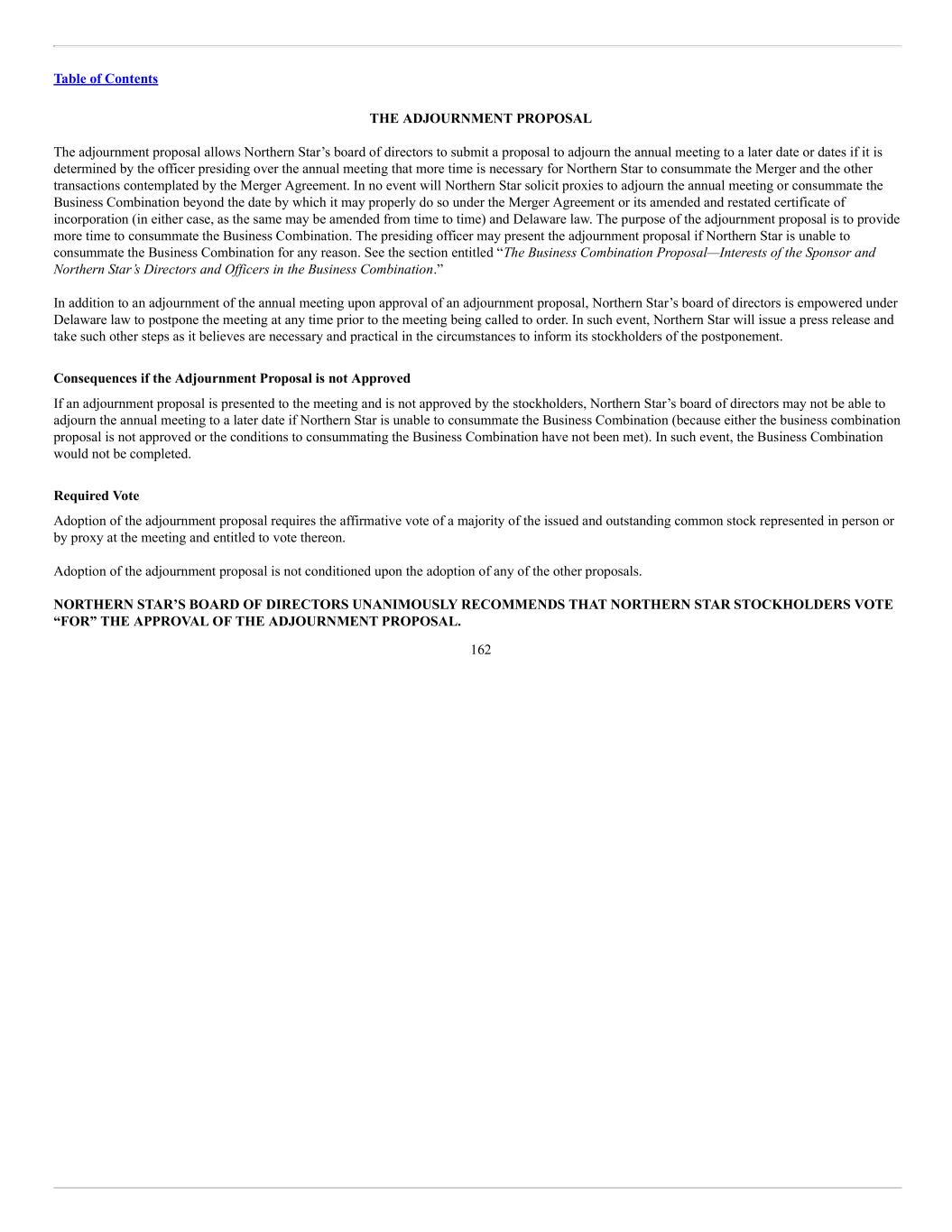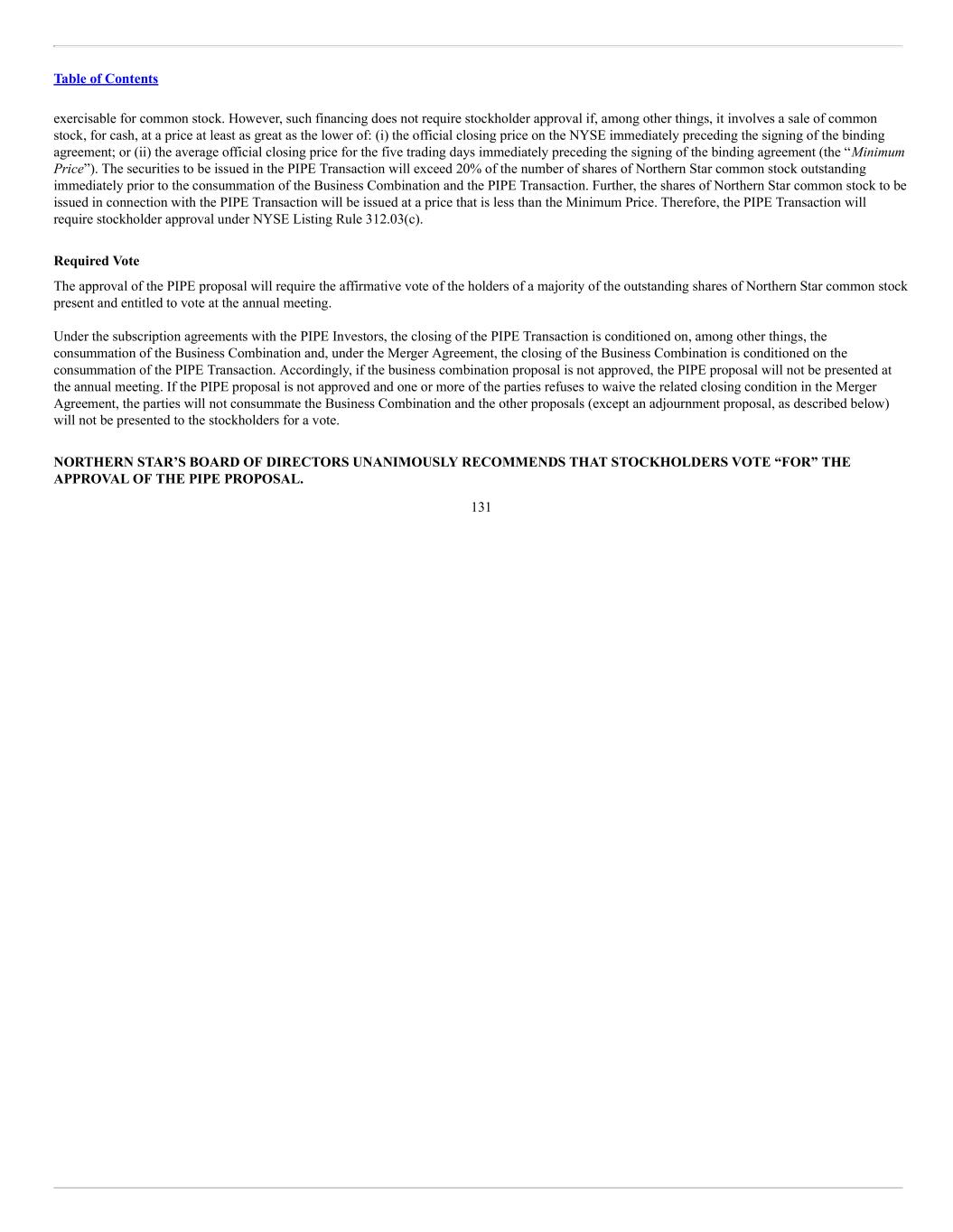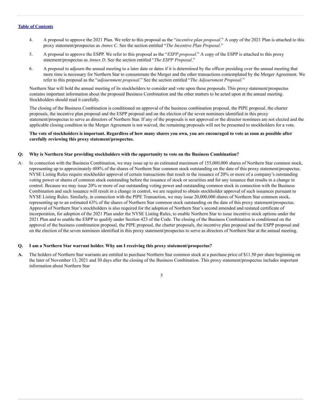 Table of Contents   4. A proposal to approve the 2021 Plan. We refer to this proposal as the “incentive plan proposal.” A copy of the 2021 Plan is attached to this proxy statement/prospectus as Annex C. See the section entitled “The Incentive Plan Proposal.”     5. A proposal to approve the ESPP. We refer to this proposal as the “ESPP proposal.” A copy of the ESPP is attached to this proxy statement/prospectus as Annex D. See the section entitled “The ESPP Proposal.”     6. A proposal to adjourn the annual meeting to a later date or dates if it is determined by the officer presiding over the annual meeting that more time is necessary for Northern Star to consummate the Merger and the other transactions contemplated by the Merger Agreement. We refer to this proposal as the “adjournment proposal.” See the section entitled “The Adjournment Proposal.” Northern Star will hold the annual meeting of its stockholders to consider and vote upon these proposals. This proxy statement/prospectus contains important information about the proposed Business Combination and the other matters to be acted upon at the annual meeting. Stockholders should read it carefully. The closing of the Business Combination is conditioned on approval of the business combination proposal, the PIPE proposal, the charter proposals, the incentive plan proposal and the ESPP proposal and on the election of the seven nominees identified in this proxy statement/prospectus to serve as directors of Northern Star. If any of the proposals is not approved or the director nominees are not elected and the applicable closing condition in the Merger Agreement is not waived, the remaining proposals will not be presented to stockholders for a vote. The vote of stockholders is important. Regardless of how many shares you own, you are encouraged to vote as soon as possible after carefully reviewing this proxy statement/prospectus.   Q: Why is Northern Star providing stockholders with the opportunity to vote on the Business Combination?   A: In connection with the Business Combination, we may issue up to an estimated maximum of 155,000,000 shares of Northern Star common stock, representing up to approximately 488% of the shares of Northern Star common stock outstanding on the date of this proxy statement/prospectus. NYSE Listing Rules require stockholder approval of certain transactions that result in the issuance of 20% or more of a company’s outstanding voting power or shares of common stock outstanding before the issuance of stock or securities and for any issuance that results in a change in control. Because we may issue 20% or more of our outstanding voting power and outstanding common stock in connection with the Business Combination and such issuance will result in a change in control, we are required to obtain stockholder approval of such issuances pursuant to NYSE Listing Rules. Similarly, in connection with the PIPE Transaction, we may issue 20,000,000 shares of Northern Star common stock, representing up to an estimated 63% of the shares of Northern Star common stock outstanding on the date of this proxy statement/prospectus. Approval of Northern Star’s stockholders is also required for the adoption of Northern Star’s second amended and restated certificate of incorporation, for adoption of the 2021 Plan under the NYSE Listing Rules, to enable Northern Star to issue incentive stock options under the 2021 Plan and to enable the ESPP to qualify under Section 423 of the Code. The closing of the Business Combination is conditioned on the approval of the business combination proposal, the PIPE proposal, the charter proposals, the incentive plan proposal and the ESPP proposal and on the election of the seven nominees identified in this proxy statement/prospectus to serve as directors of Northern Star at the annual meeting.   Q. I am a Northern Star warrant holder. Why am I receiving this proxy statement/prospectus?   A. The holders of Northern Star warrants are entitled to purchase Northern Star common stock at a purchase price of $11.50 per share beginning on the later of November 13, 2021 and 30 days after the closing of the Business Combination. This proxy statement/prospectus includes important information about Northern Star   5