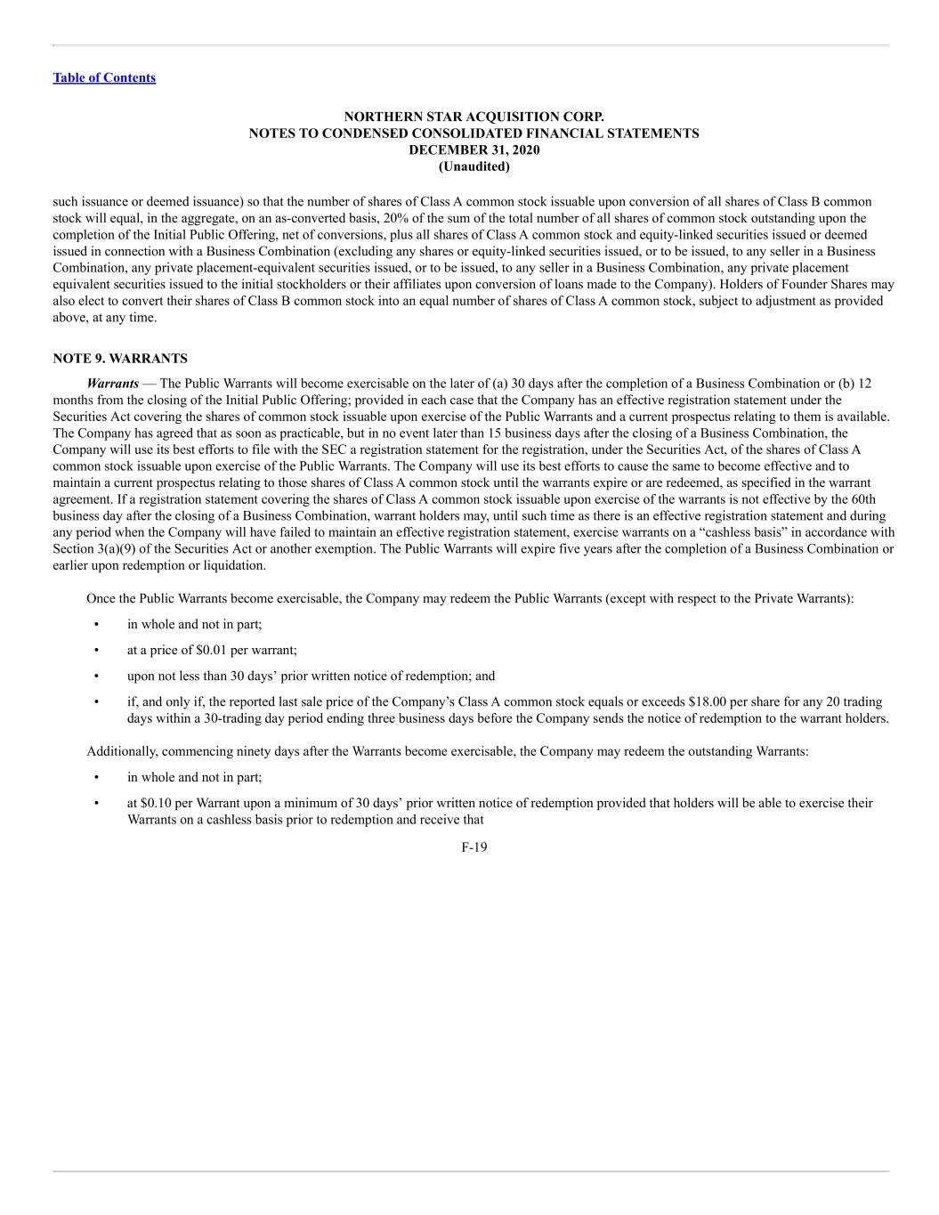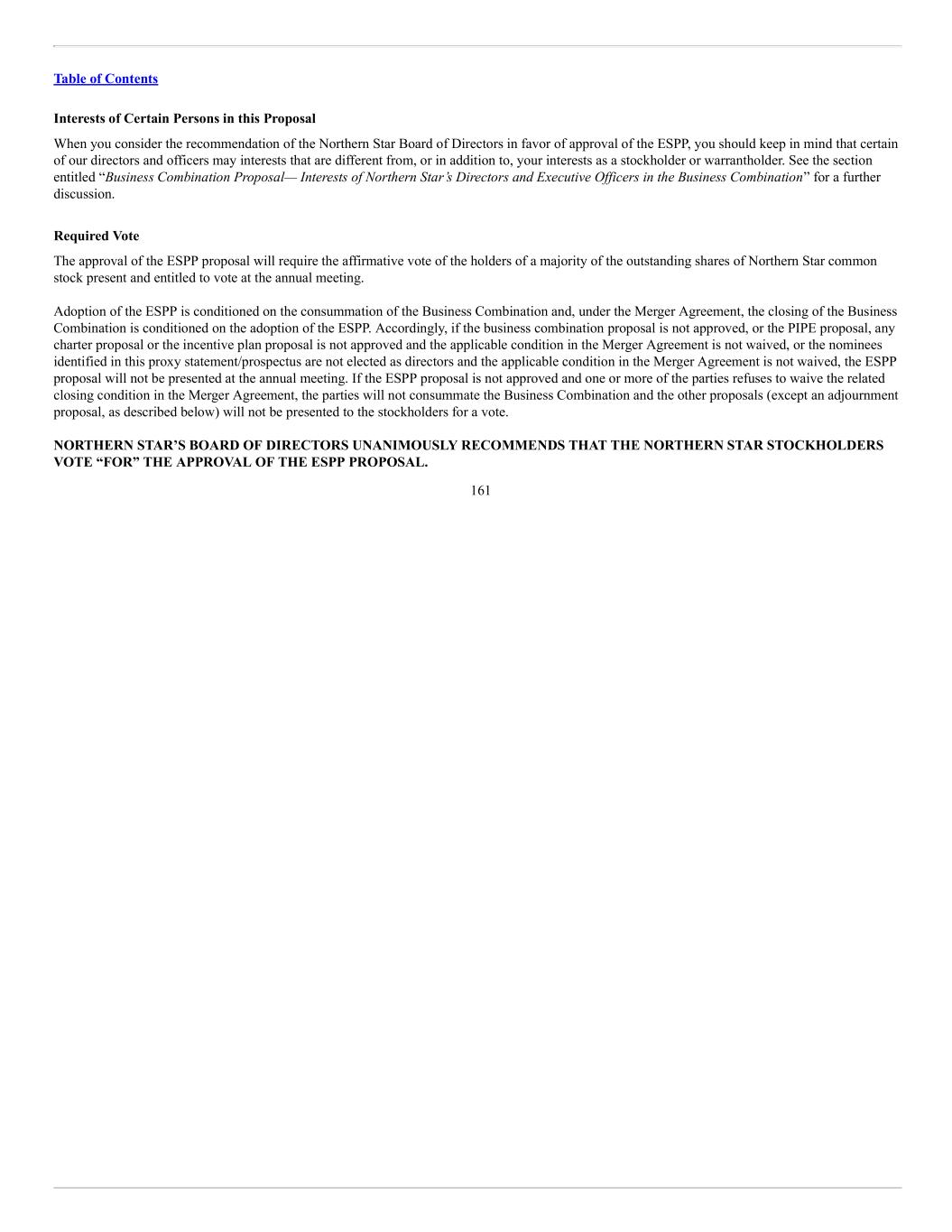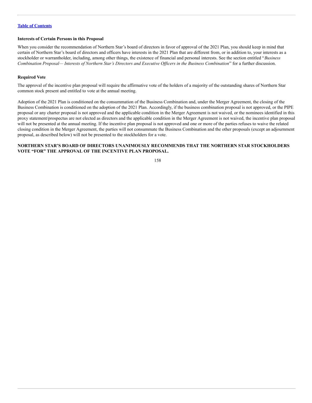 Table of Contents   4. A proposal to approve the 2021 Plan. We refer to this proposal as the “incentive plan proposal.” A copy of the 2021 Plan is attached to this proxy statement/prospectus as Annex C. See the section entitled “The Incentive Plan Proposal.”     5. A proposal to approve the ESPP. We refer to this proposal as the “ESPP proposal.” A copy of the ESPP is attached to this proxy statement/prospectus as Annex D. See the section entitled “The ESPP Proposal.”     6. A proposal to adjourn the annual meeting to a later date or dates if it is determined by the officer presiding over the annual meeting that more time is necessary for Northern Star to consummate the Merger and the other transactions contemplated by the Merger Agreement. We refer to this proposal as the “adjournment proposal.” See the section entitled “The Adjournment Proposal.” Northern Star will hold the annual meeting of its stockholders to consider and vote upon these proposals. This proxy statement/prospectus contains important information about the proposed Business Combination and the other matters to be acted upon at the annual meeting. Stockholders should read it carefully. The closing of the Business Combination is conditioned on approval of the business combination proposal, the PIPE proposal, the charter proposals, the incentive plan proposal and the ESPP proposal and on the election of the seven nominees identified in this proxy statement/prospectus to serve as directors of Northern Star. If any of the proposals is not approved or the director nominees are not elected and the applicable closing condition in the Merger Agreement is not waived, the remaining proposals will not be presented to stockholders for a vote. The vote of stockholders is important. Regardless of how many shares you own, you are encouraged to vote as soon as possible after carefully reviewing this proxy statement/prospectus.   Q: Why is Northern Star providing stockholders with the opportunity to vote on the Business Combination?   A: In connection with the Business Combination, we may issue up to an estimated maximum of 155,000,000 shares of Northern Star common stock, representing up to approximately 488% of the shares of Northern Star common stock outstanding on the date of this proxy statement/prospectus. NYSE Listing Rules require stockholder approval of certain transactions that result in the issuance of 20% or more of a company’s outstanding voting power or shares of common stock outstanding before the issuance of stock or securities and for any issuance that results in a change in control. Because we may issue 20% or more of our outstanding voting power and outstanding common stock in connection with the Business Combination and such issuance will result in a change in control, we are required to obtain stockholder approval of such issuances pursuant to NYSE Listing Rules. Similarly, in connection with the PIPE Transaction, we may issue 20,000,000 shares of Northern Star common stock, representing up to an estimated 63% of the shares of Northern Star common stock outstanding on the date of this proxy statement/prospectus. Approval of Northern Star’s stockholders is also required for the adoption of Northern Star’s second amended and restated certificate of incorporation, for adoption of the 2021 Plan under the NYSE Listing Rules, to enable Northern Star to issue incentive stock options under the 2021 Plan and to enable the ESPP to qualify under Section 423 of the Code. The closing of the Business Combination is conditioned on the approval of the business combination proposal, the PIPE proposal, the charter proposals, the incentive plan proposal and the ESPP proposal and on the election of the seven nominees identified in this proxy statement/prospectus to serve as directors of Northern Star at the annual meeting.   Q. I am a Northern Star warrant holder. Why am I receiving this proxy statement/prospectus?   A. The holders of Northern Star warrants are entitled to purchase Northern Star common stock at a purchase price of $11.50 per share beginning on the later of November 13, 2021 and 30 days after the closing of the Business Combination. This proxy statement/prospectus includes important information about Northern Star   5