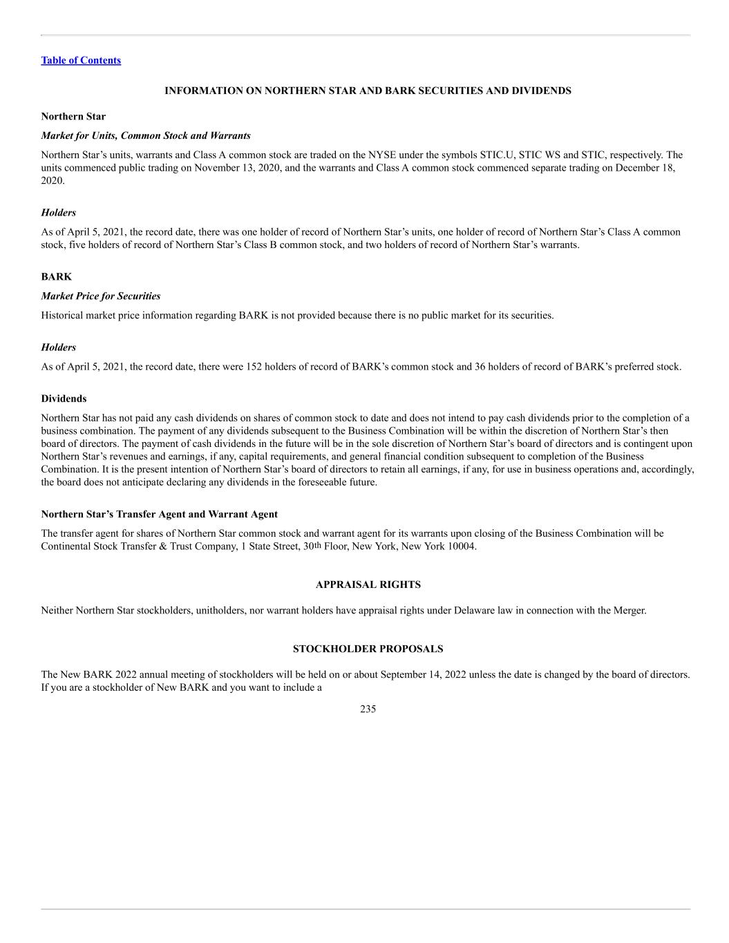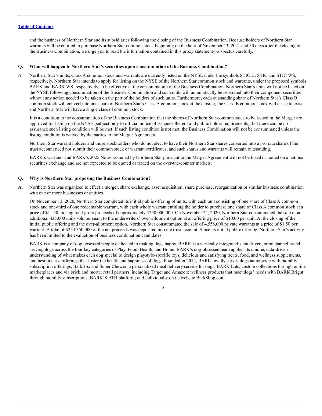 Table of Contents   and the business of Northern Star and its subsidiaries following the closing of the Business Combination. Because holders of Northern Star warrants will be entitled to purchase Northern Star common stock beginning on the later of November 13, 2021 and 30 days after the closing of the Business Combination, we urge you to read the information contained in this proxy statement/prospectus carefully.   Q. What will happen to Northern Star’s securities upon consummation of the Business Combination?   A. Northern Star’s units, Class A common stock and warrants are currently listed on the NYSE under the symbols STIC.U, STIC and STIC WS, respectively. Northern Star intends to apply for listing on the NYSE of the Northern Star common stock and warrants, under the proposed symbols BARK and BARK WS, respectively, to be effective at the consummation of the Business Combination. Northern Star’s units will not be listed on the NYSE following consummation of the Business Combination and such units will automatically be separated into their component securities without any action needed to be taken on the part of the holders of such units. Furthermore, each outstanding share of Northern Star’s Class B common stock will convert into one share of Northern Star’s Class A common stock at the closing, the Class B common stock will cease to exist and Northern Star will have a single class of common stock. It is a condition to the consummation of the Business Combination that the shares of Northern Star common stock to be issued in the Merger are approved for listing on the NYSE (subject only to official notice of issuance thereof and public holder requirements), but there can be no assurance such listing condition will be met. If such listing condition is not met, the Business Combination will not be consummated unless the listing condition is waived by the parties to the Merger Agreement. Northern Star warrant holders and those stockholders who do not elect to have their Northern Star shares converted into a pro rata share of the trust account need not submit their common stock or warrant certificates, and such shares and warrants will remain outstanding. BARK’s warrants and BARK’s 2025 Notes assumed by Northern Star pursuant to the Merger Agreement will not be listed or traded on a national securities exchange and are not expected to be quoted or traded on the over-the-counter markets.   Q. Why is Northern Star proposing the Business Combination?   A. Northern Star was organized to effect a merger, share exchange, asset acquisition, share purchase, reorganization or similar business combination with one or more businesses or entities. On November 13, 2020, Northern Star completed its initial public offering of units, with each unit consisting of one share of Class A common stock and one-third of one redeemable warrant, with each whole warrant entitling the holder to purchase one share of Class A common stock at a price of $11.50, raising total gross proceeds of approximately $250,000,000. On November 24, 2020, Northern Star consummated the sale of an additional 435,000 units sold pursuant to the underwriters’ over-allotment option at an offering price of $10.00 per unit. At the closing of the initial public offering and the over-allotment option, Northern Star consummated the sale of 4,558,000 private warrants at a price of $1.50 per warrant. A total of $254,350,000 of the net proceeds was deposited into the trust account. Since its initial public offering, Northern Star’s activity has been limited to the evaluation of business combination candidates. BARK is a company of dog obsessed people dedicated to making dogs happy. BARK is a vertically integrated, data driven, omnichannel brand serving dogs across the four key categories of Play, Food, Health, and Home. BARK’s dog-obsessed team applies its unique, data-driven understanding of what makes each dog special to design playstyle-specific toys, delicious and satisfying treats, food, and wellness supplements, and best in class offerings that foster the health and happiness of dogs. Founded in 2012, BARK loyally serves dogs nationwide with monthly subscription offerings, BarkBox and Super Chewer; a personalized meal delivery service for dogs, BARK Eats; custom collections through online marketplaces and via brick and mortar retail partners, including Target and Amazon; wellness products that meet dogs’ needs with BARK Bright through monthly subscriptions; BARK’S ATB platform; and individually on its website BarkShop.com.   6
