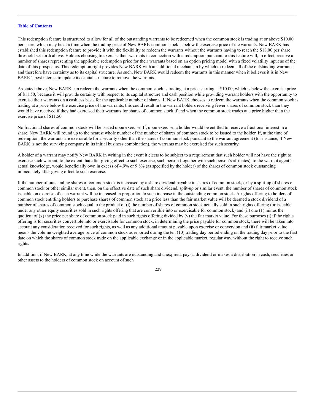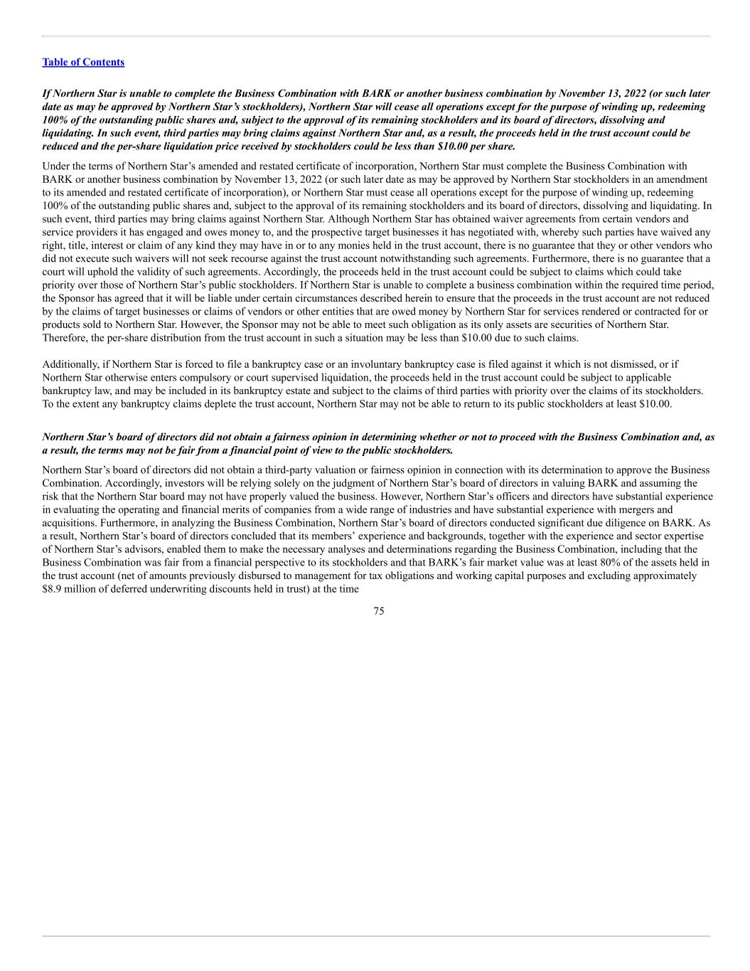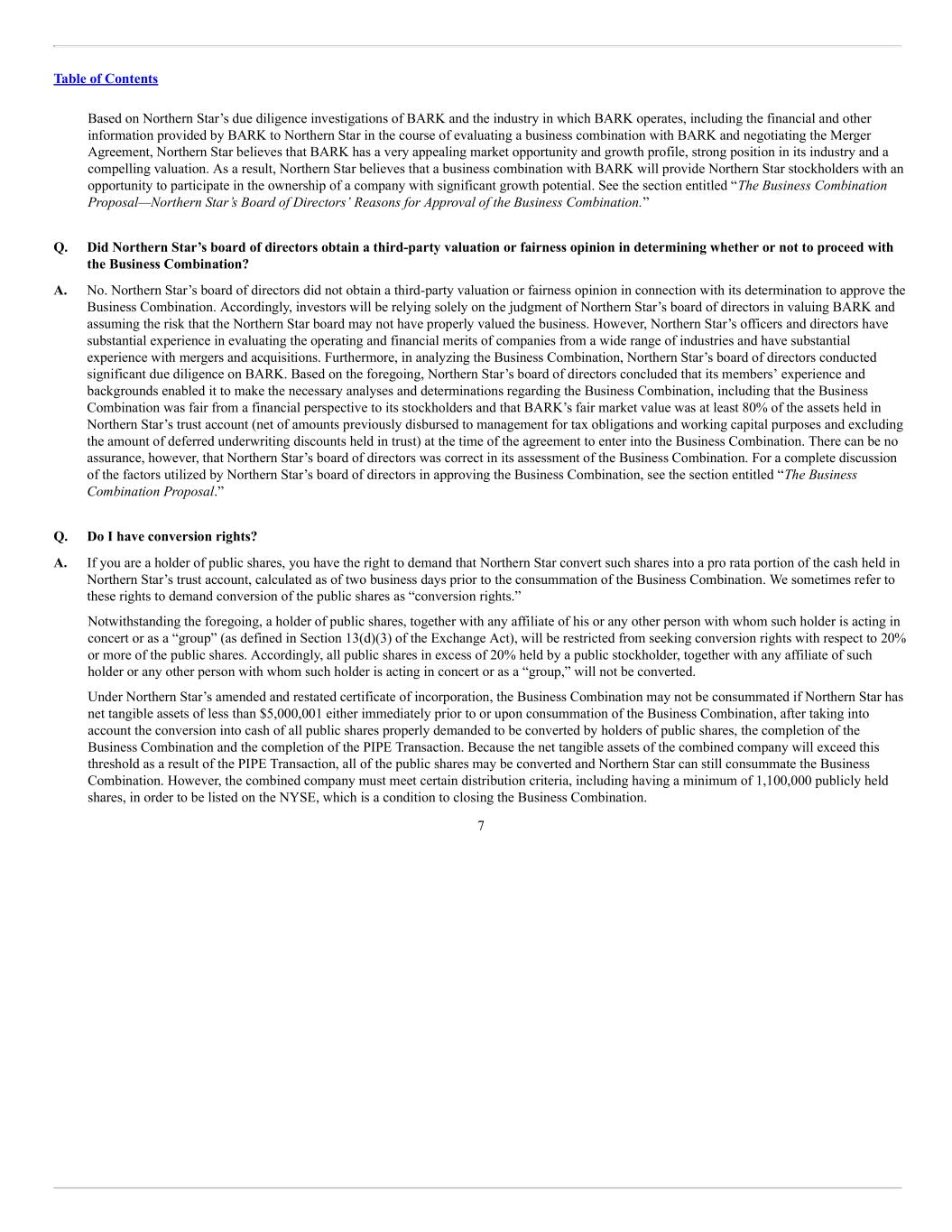 Table of Contents Based on Northern Star’s due diligence investigations of BARK and the industry in which BARK operates, including the financial and other information provided by BARK to Northern Star in the course of evaluating a business combination with BARK and negotiating the Merger Agreement, Northern Star believes that BARK has a very appealing market opportunity and growth profile, strong position in its industry and a compelling valuation. As a result, Northern Star believes that a business combination with BARK will provide Northern Star stockholders with an opportunity to participate in the ownership of a company with significant growth potential. See the section entitled “The Business Combination Proposal—Northern Star’s Board of Directors’ Reasons for Approval of the Business Combination.”   Q. Did Northern Star’s board of directors obtain a third-party valuation or fairness opinion in determining whether or not to proceed with the Business Combination?   A. No. Northern Star’s board of directors did not obtain a third-party valuation or fairness opinion in connection with its determination to approve the Business Combination. Accordingly, investors will be relying solely on the judgment of Northern Star’s board of directors in valuing BARK and assuming the risk that the Northern Star board may not have properly valued the business. However, Northern Star’s officers and directors have substantial experience in evaluating the operating and financial merits of companies from a wide range of industries and have substantial experience with mergers and acquisitions. Furthermore, in analyzing the Business Combination, Northern Star’s board of directors conducted significant due diligence on BARK. Based on the foregoing, Northern Star’s board of directors concluded that its members’ experience and backgrounds enabled it to make the necessary analyses and determinations regarding the Business Combination, including that the Business Combination was fair from a financial perspective to its stockholders and that BARK’s fair market value was at least 80% of the assets held in Northern Star’s trust account (net of amounts previously disbursed to management for tax obligations and working capital purposes and excluding the amount of deferred underwriting discounts held in trust) at the time of the agreement to enter into the Business Combination. There can be no assurance, however, that Northern Star’s board of directors was correct in its assessment of the Business Combination. For a complete discussion of the factors utilized by Northern Star’s board of directors in approving the Business Combination, see the section entitled “The Business Combination Proposal.”   Q. Do I have conversion rights?   A. If you are a holder of public shares, you have the right to demand that Northern Star convert such shares into a pro rata portion of the cash held in Northern Star’s trust account, calculated as of two business days prior to the consummation of the Business Combination. We sometimes refer to these rights to demand conversion of the public shares as “conversion rights.” Notwithstanding the foregoing, a holder of public shares, together with any affiliate of his or any other person with whom such holder is acting in concert or as a “group” (as defined in Section 13(d)(3) of the Exchange Act), will be restricted from seeking conversion rights with respect to 20% or more of the public shares. Accordingly, all public shares in excess of 20% held by a public stockholder, together with any affiliate of such holder or any other person with whom such holder is acting in concert or as a “group,” will not be converted. Under Northern Star’s amended and restated certificate of incorporation, the Business Combination may not be consummated if Northern Star has net tangible assets of less than $5,000,001 either immediately prior to or upon consummation of the Business Combination, after taking into account the conversion into cash of all public shares properly demanded to be converted by holders of public shares, the completion of the Business Combination and the completion of the PIPE Transaction. Because the net tangible assets of the combined company will exceed this threshold as a result of the PIPE Transaction, all of the public shares may be converted and Northern Star can still consummate the Business Combination. However, the combined company must meet certain distribution criteria, including having a minimum of 1,100,000 publicly held shares, in order to be listed on the NYSE, which is a condition to closing the Business Combination.   7