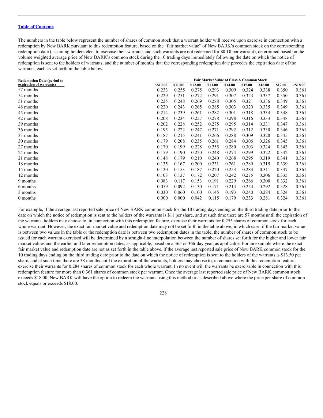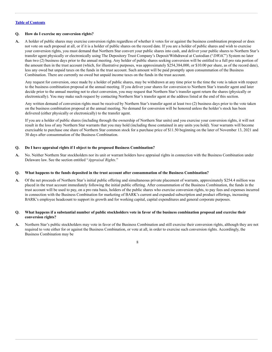 Table of Contents Q. How do I exercise my conversion rights?   A. A holder of public shares may exercise conversion rights regardless of whether it votes for or against the business combination proposal or does not vote on such proposal at all, or if it is a holder of public shares on the record date. If you are a holder of public shares and wish to exercise your conversion rights, you must demand that Northern Star convert your public shares into cash, and deliver your public shares to Northern Star’s transfer agent physically or electronically using The Depository Trust Company’s Deposit/Withdrawal at Custodian (“DWAC”) System no later than two (2) business days prior to the annual meeting. Any holder of public shares seeking conversion will be entitled to a full pro rata portion of the amount then in the trust account (which, for illustrative purposes, was approximately $254,384,000, or $10.00 per share, as of the record date), less any owed but unpaid taxes on the funds in the trust account. Such amount will be paid promptly upon consummation of the Business Combination. There are currently no owed but unpaid income taxes on the funds in the trust account. Any request for conversion, once made by a holder of public shares, may be withdrawn at any time prior to the time the vote is taken with respect to the business combination proposal at the annual meeting. If you deliver your shares for conversion to Northern Star’s transfer agent and later decide prior to the annual meeting not to elect conversion, you may request that Northern Star’s transfer agent return the shares (physically or electronically). You may make such request by contacting Northern Star’s transfer agent at the address listed at the end of this section. Any written demand of conversion rights must be received by Northern Star’s transfer agent at least two (2) business days prior to the vote taken on the business combination proposal at the annual meeting. No demand for conversion will be honored unless the holder’s stock has been delivered (either physically or electronically) to the transfer agent. If you are a holder of public shares (including through the ownership of Northern Star units) and you exercise your conversion rights, it will not result in the loss of any Northern Star warrants that you may hold (including those contained in any units you hold). Your warrants will become exercisable to purchase one share of Northern Star common stock for a purchase price of $11.50 beginning on the later of November 13, 2021 and 30 days after consummation of the Business Combination.   Q. Do I have appraisal rights if I object to the proposed Business Combination?   A. No. Neither Northern Star stockholders nor its unit or warrant holders have appraisal rights in connection with the Business Combination under Delaware law. See the section entitled “Appraisal Rights.”   Q. What happens to the funds deposited in the trust account after consummation of the Business Combination?   A. Of the net proceeds of Northern Star’s initial public offering and simultaneous private placement of warrants, approximately $254.4 million was placed in the trust account immediately following the initial public offering. After consummation of the Business Combination, the funds in the trust account will be used to pay, on a pro rata basis, holders of the public shares who exercise conversion rights, to pay fees and expenses incurred in connection with the Business Combination for marketing of BARK’s current and expanded subscription and product offerings, increasing BARK’s employee headcount to support its growth and for working capital, capital expenditures and general corporate purposes.   Q. What happens if a substantial number of public stockholders vote in favor of the business combination proposal and exercise their conversion rights?   A. Northern Star’s public stockholders may vote in favor of the Business Combination and still exercise their conversion rights, although they are not required to vote either for or against the Business Combination, or vote at all, in order to exercise such conversion rights. Accordingly, the Business Combination may be   8