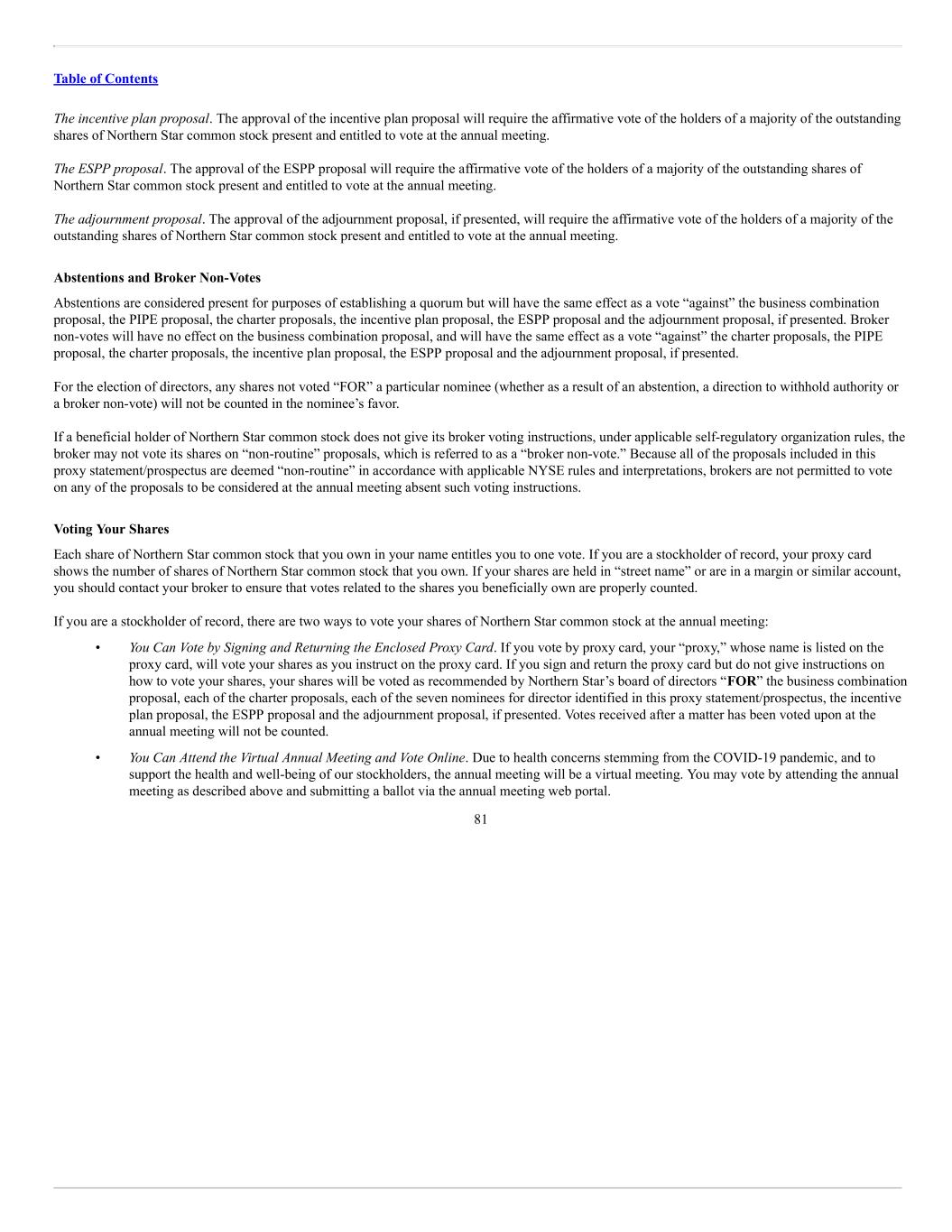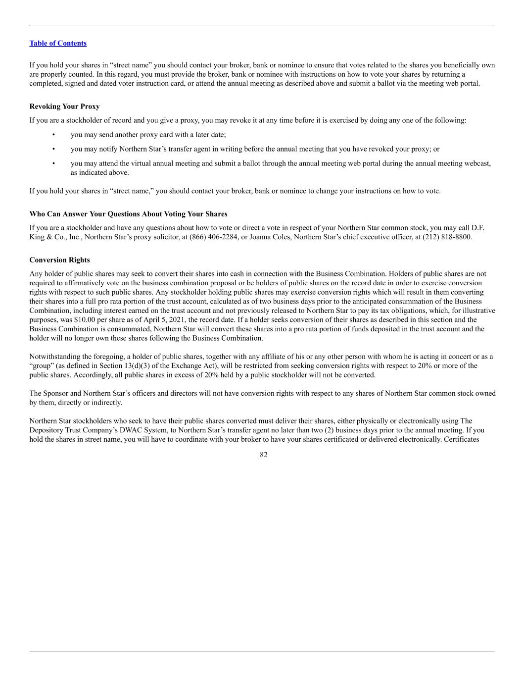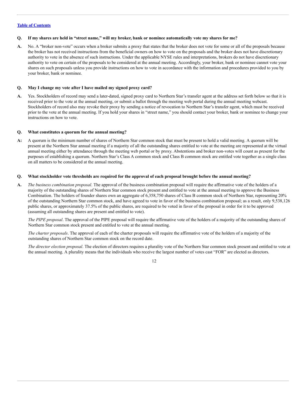Table of Contents Q. If my shares are held in “street name,” will my broker, bank or nominee automatically vote my shares for me?   A. No. A “broker non-vote” occurs when a broker submits a proxy that states that the broker does not vote for some or all of the proposals because the broker has not received instructions from the beneficial owners on how to vote on the proposals and the broker does not have discretionary authority to vote in the absence of such instructions. Under the applicable NYSE rules and interpretations, brokers do not have discretionary authority to vote on certain of the proposals to be considered at the annual meeting. Accordingly, your broker, bank or nominee cannot vote your shares on such proposals unless you provide instructions on how to vote in accordance with the information and procedures provided to you by your broker, bank or nominee.   Q. May I change my vote after I have mailed my signed proxy card?   A. Yes. Stockholders of record may send a later-dated, signed proxy card to Northern Star’s transfer agent at the address set forth below so that it is received prior to the vote at the annual meeting, or submit a ballot through the meeting web portal during the annual meeting webcast. Stockholders of record also may revoke their proxy by sending a notice of revocation to Northern Star’s transfer agent, which must be received prior to the vote at the annual meeting. If you hold your shares in “street name,” you should contact your broker, bank or nominee to change your instructions on how to vote.   Q. What constitutes a quorum for the annual meeting?   A: A quorum is the minimum number of shares of Northern Star common stock that must be present to hold a valid meeting. A quorum will be present at the Northern Star annual meeting if a majority of all the outstanding shares entitled to vote at the meeting are represented at the virtual annual meeting either by attendance through the meeting web portal or by proxy. Abstentions and broker non-votes will count as present for the purposes of establishing a quorum. Northern Star’s Class A common stock and Class B common stock are entitled vote together as a single class on all matters to be considered at the annual meeting.   Q. What stockholder vote thresholds are required for the approval of each proposal brought before the annual meeting?   A. The business combination proposal. The approval of the business combination proposal will require the affirmative vote of the holders of a majority of the outstanding shares of Northern Star common stock present and entitled to vote at the annual meeting to approve the Business Combination. The holders of founder shares own an aggregate of 6,358,750 shares of Class B common stock of Northern Star, representing 20% of the outstanding Northern Star common stock, and have agreed to vote in favor of the business combination proposal; as a result, only 9,538,126 public shares, or approximately 37.5% of the public shares, are required to be voted in favor of the proposal in order for it to be approved (assuming all outstanding shares are present and entitled to vote). The PIPE proposal. The approval of the PIPE proposal will require the affirmative vote of the holders of a majority of the outstanding shares of Northern Star common stock present and entitled to vote at the annual meeting. The charter proposals. The approval of each of the charter proposals will require the affirmative vote of the holders of a majority of the outstanding shares of Northern Star common stock on the record date. The director election proposal. The election of directors requires a plurality vote of the Northern Star common stock present and entitled to vote at the annual meeting. A plurality means that the individuals who receive the largest number of votes cast “FOR” are elected as directors.   12