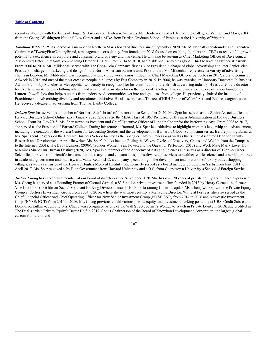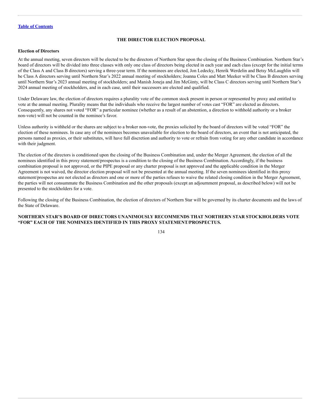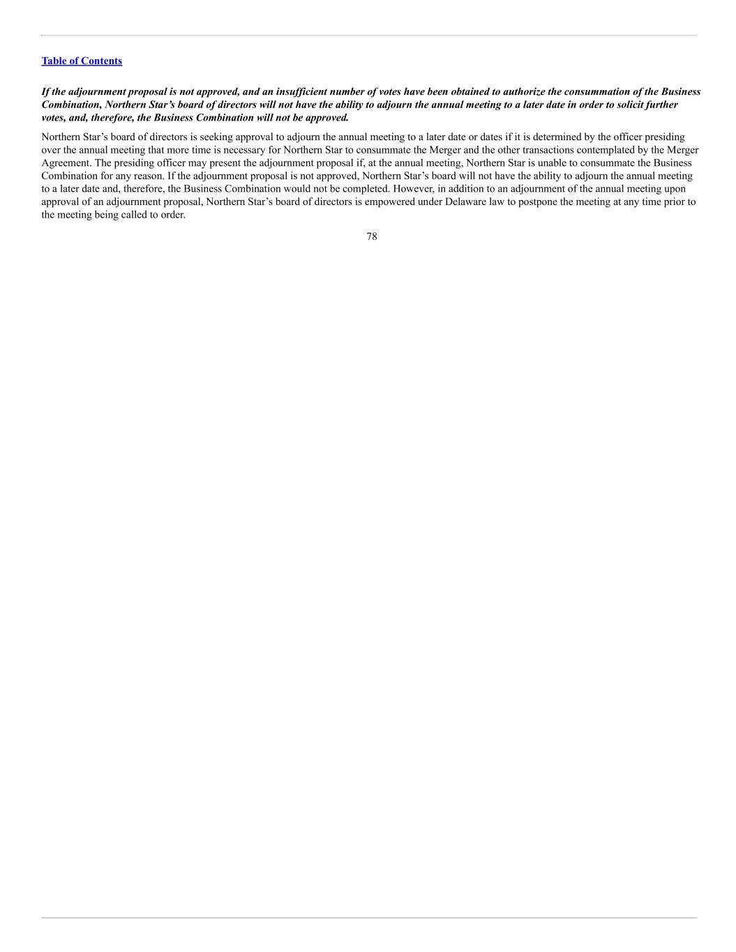 Table of Contents Q. If my shares are held in “street name,” will my broker, bank or nominee automatically vote my shares for me?   A. No. A “broker non-vote” occurs when a broker submits a proxy that states that the broker does not vote for some or all of the proposals because the broker has not received instructions from the beneficial owners on how to vote on the proposals and the broker does not have discretionary authority to vote in the absence of such instructions. Under the applicable NYSE rules and interpretations, brokers do not have discretionary authority to vote on certain of the proposals to be considered at the annual meeting. Accordingly, your broker, bank or nominee cannot vote your shares on such proposals unless you provide instructions on how to vote in accordance with the information and procedures provided to you by your broker, bank or nominee.   Q. May I change my vote after I have mailed my signed proxy card?   A. Yes. Stockholders of record may send a later-dated, signed proxy card to Northern Star’s transfer agent at the address set forth below so that it is received prior to the vote at the annual meeting, or submit a ballot through the meeting web portal during the annual meeting webcast. Stockholders of record also may revoke their proxy by sending a notice of revocation to Northern Star’s transfer agent, which must be received prior to the vote at the annual meeting. If you hold your shares in “street name,” you should contact your broker, bank or nominee to change your instructions on how to vote.   Q. What constitutes a quorum for the annual meeting?   A: A quorum is the minimum number of shares of Northern Star common stock that must be present to hold a valid meeting. A quorum will be present at the Northern Star annual meeting if a majority of all the outstanding shares entitled to vote at the meeting are represented at the virtual annual meeting either by attendance through the meeting web portal or by proxy. Abstentions and broker non-votes will count as present for the purposes of establishing a quorum. Northern Star’s Class A common stock and Class B common stock are entitled vote together as a single class on all matters to be considered at the annual meeting.   Q. What stockholder vote thresholds are required for the approval of each proposal brought before the annual meeting?   A. The business combination proposal. The approval of the business combination proposal will require the affirmative vote of the holders of a majority of the outstanding shares of Northern Star common stock present and entitled to vote at the annual meeting to approve the Business Combination. The holders of founder shares own an aggregate of 6,358,750 shares of Class B common stock of Northern Star, representing 20% of the outstanding Northern Star common stock, and have agreed to vote in favor of the business combination proposal; as a result, only 9,538,126 public shares, or approximately 37.5% of the public shares, are required to be voted in favor of the proposal in order for it to be approved (assuming all outstanding shares are present and entitled to vote). The PIPE proposal. The approval of the PIPE proposal will require the affirmative vote of the holders of a majority of the outstanding shares of Northern Star common stock present and entitled to vote at the annual meeting. The charter proposals. The approval of each of the charter proposals will require the affirmative vote of the holders of a majority of the outstanding shares of Northern Star common stock on the record date. The director election proposal. The election of directors requires a plurality vote of the Northern Star common stock present and entitled to vote at the annual meeting. A plurality means that the individuals who receive the largest number of votes cast “FOR” are elected as directors.   12