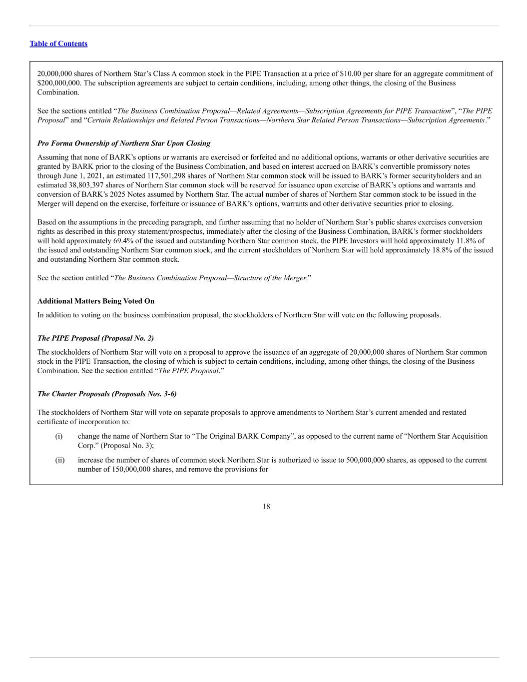 Table of Contents 20,000,000 shares of Northern Star’s Class A common stock in the PIPE Transaction at a price of $10.00 per share for an aggregate commitment of $200,000,000. The subscription agreements are subject to certain conditions, including, among other things, the closing of the Business Combination. See the sections entitled “The Business Combination Proposal—Related Agreements—Subscription Agreements for PIPE Transaction”, “The PIPE Proposal” and “Certain Relationships and Related Person Transactions—Northern Star Related Person Transactions—Subscription Agreements.” Pro Forma Ownership of Northern Star Upon Closing Assuming that none of BARK’s options or warrants are exercised or forfeited and no additional options, warrants or other derivative securities are granted by BARK prior to the closing of the Business Combination, and based on interest accrued on BARK’s convertible promissory notes through June 1, 2021, an estimated 117,501,298 shares of Northern Star common stock will be issued to BARK’s former securityholders and an estimated 38,803,397 shares of Northern Star common stock will be reserved for issuance upon exercise of BARK’s options and warrants and conversion of BARK’s 2025 Notes assumed by Northern Star. The actual number of shares of Northern Star common stock to be issued in the Merger will depend on the exercise, forfeiture or issuance of BARK’s options, warrants and other derivative securities prior to closing. Based on the assumptions in the preceding paragraph, and further assuming that no holder of Northern Star’s public shares exercises conversion rights as described in this proxy statement/prospectus, immediately after the closing of the Business Combination, BARK’s former stockholders will hold approximately 69.4% of the issued and outstanding Northern Star common stock, the PIPE Investors will hold approximately 11.8% of the issued and outstanding Northern Star common stock, and the current stockholders of Northern Star will hold approximately 18.8% of the issued and outstanding Northern Star common stock. See the section entitled “The Business Combination Proposal—Structure of the Merger.” Additional Matters Being Voted On In addition to voting on the business combination proposal, the stockholders of Northern Star will vote on the following proposals. The PIPE Proposal (Proposal No. 2) The stockholders of Northern Star will vote on a proposal to approve the issuance of an aggregate of 20,000,000 shares of Northern Star common stock in the PIPE Transaction, the closing of which is subject to certain conditions, including, among other things, the closing of the Business Combination. See the section entitled “The PIPE Proposal.” The Charter Proposals (Proposals Nos. 3-6) The stockholders of Northern Star will vote on separate proposals to approve amendments to Northern Star’s current amended and restated certificate of incorporation to:     (i) change the name of Northern Star to “The Original BARK Company”, as opposed to the current name of “Northern Star Acquisition Corp.” (Proposal No. 3);     (ii) increase the number of shares of common stock Northern Star is authorized to issue to 500,000,000 shares, as opposed to the current number of 150,000,000 shares, and remove the provisions for   18