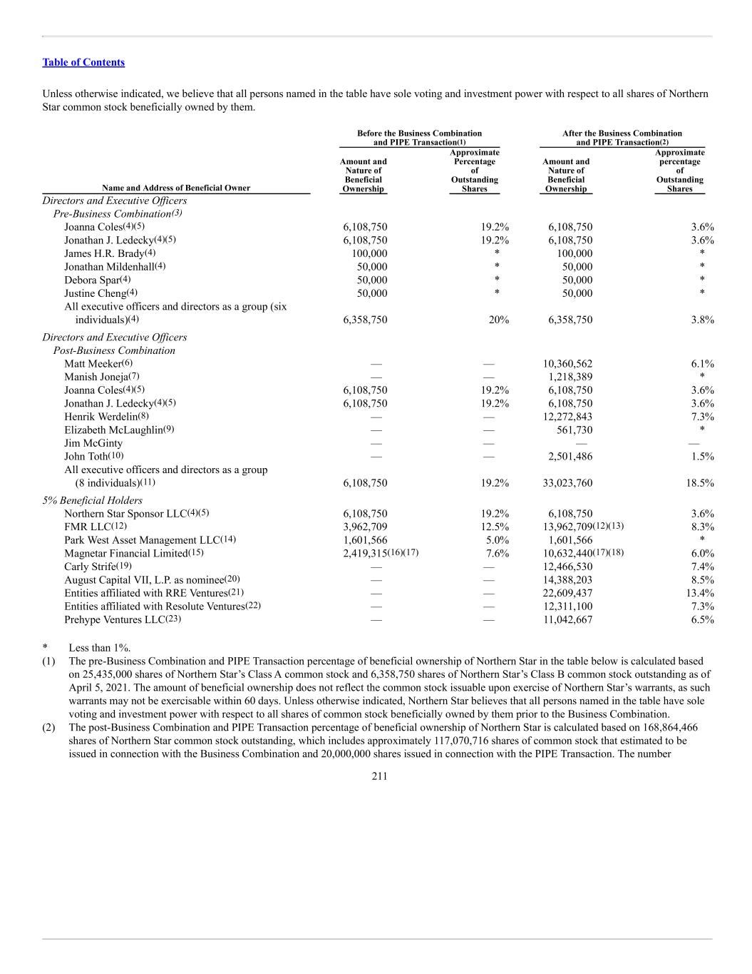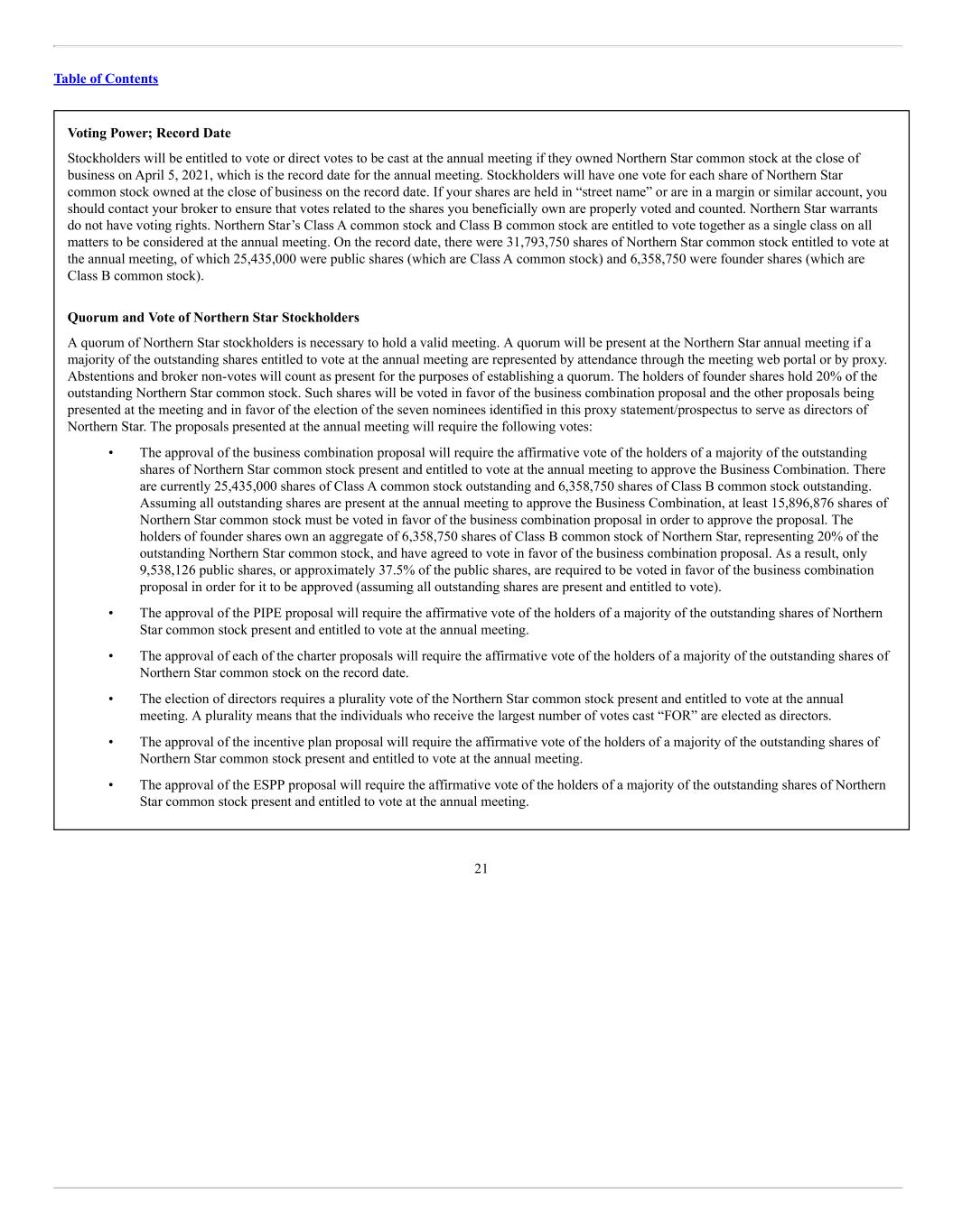 Table of Contents Voting Power; Record Date Stockholders will be entitled to vote or direct votes to be cast at the annual meeting if they owned Northern Star common stock at the close of business on April 5, 2021, which is the record date for the annual meeting. Stockholders will have one vote for each share of Northern Star common stock owned at the close of business on the record date. If your shares are held in “street name” or are in a margin or similar account, you should contact your broker to ensure that votes related to the shares you beneficially own are properly voted and counted. Northern Star warrants do not have voting rights. Northern Star’s Class A common stock and Class B common stock are entitled to vote together as a single class on all matters to be considered at the annual meeting. On the record date, there were 31,793,750 shares of Northern Star common stock entitled to vote at the annual meeting, of which 25,435,000 were public shares (which are Class A common stock) and 6,358,750 were founder shares (which are Class B common stock). Quorum and Vote of Northern Star Stockholders A quorum of Northern Star stockholders is necessary to hold a valid meeting. A quorum will be present at the Northern Star annual meeting if a majority of the outstanding shares entitled to vote at the annual meeting are represented by attendance through the meeting web portal or by proxy. Abstentions and broker non-votes will count as present for the purposes of establishing a quorum. The holders of founder shares hold 20% of the outstanding Northern Star common stock. Such shares will be voted in favor of the business combination proposal and the other proposals being presented at the meeting and in favor of the election of the seven nominees identified in this proxy statement/prospectus to serve as directors of Northern Star. The proposals presented at the annual meeting will require the following votes:     •   The approval of the business combination proposal will require the affirmative vote of the holders of a majority of the outstanding shares of Northern Star common stock present and entitled to vote at the annual meeting to approve the Business Combination. There are currently 25,435,000 shares of Class A common stock outstanding and 6,358,750 shares of Class B common stock outstanding. Assuming all outstanding shares are present at the annual meeting to approve the Business Combination, at least 15,896,876 shares of Northern Star common stock must be voted in favor of the business combination proposal in order to approve the proposal. The holders of founder shares own an aggregate of 6,358,750 shares of Class B common stock of Northern Star, representing 20% of the outstanding Northern Star common stock, and have agreed to vote in favor of the business combination proposal. As a result, only 9,538,126 public shares, or approximately 37.5% of the public shares, are required to be voted in favor of the business combination proposal in order for it to be approved (assuming all outstanding shares are present and entitled to vote).     •   The approval of the PIPE proposal will require the affirmative vote of the holders of a majority of the outstanding shares of Northern Star common stock present and entitled to vote at the annual meeting.     •   The approval of each of the charter proposals will require the affirmative vote of the holders of a majority of the outstanding shares of Northern Star common stock on the record date.     •   The election of directors requires a plurality vote of the Northern Star common stock present and entitled to vote at the annual meeting. A plurality means that the individuals who receive the largest number of votes cast “FOR” are elected as directors.     •   The approval of the incentive plan proposal will require the affirmative vote of the holders of a majority of the outstanding shares of Northern Star common stock present and entitled to vote at the annual meeting.     •   The approval of the ESPP proposal will require the affirmative vote of the holders of a majority of the outstanding shares of Northern Star common stock present and entitled to vote at the annual meeting.   21