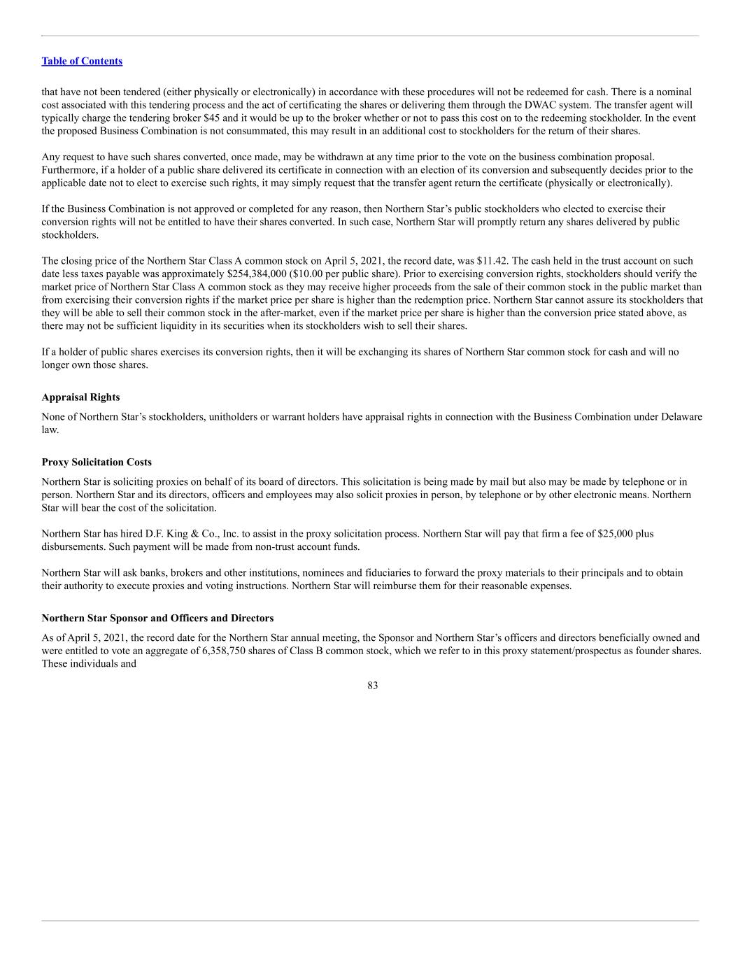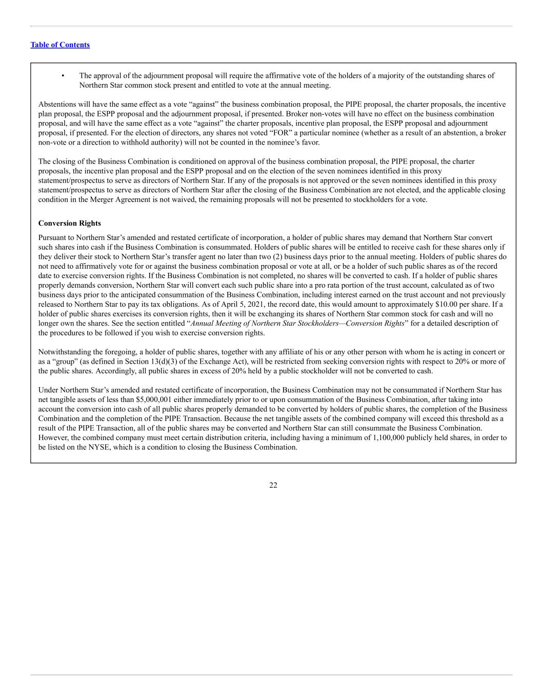 Table of Contents   •   The approval of the adjournment proposal will require the affirmative vote of the holders of a majority of the outstanding shares of Northern Star common stock present and entitled to vote at the annual meeting. Abstentions will have the same effect as a vote “against” the business combination proposal, the PIPE proposal, the charter proposals, the incentive plan proposal, the ESPP proposal and the adjournment proposal, if presented. Broker non-votes will have no effect on the business combination proposal, and will have the same effect as a vote “against” the charter proposals, incentive plan proposal, the ESPP proposal and adjournment proposal, if presented. For the election of directors, any shares not voted “FOR” a particular nominee (whether as a result of an abstention, a broker non-vote or a direction to withhold authority) will not be counted in the nominee’s favor. The closing of the Business Combination is conditioned on approval of the business combination proposal, the PIPE proposal, the charter proposals, the incentive plan proposal and the ESPP proposal and on the election of the seven nominees identified in this proxy statement/prospectus to serve as directors of Northern Star. If any of the proposals is not approved or the seven nominees identified in this proxy statement/prospectus to serve as directors of Northern Star after the closing of the Business Combination are not elected, and the applicable closing condition in the Merger Agreement is not waived, the remaining proposals will not be presented to stockholders for a vote. Conversion Rights Pursuant to Northern Star’s amended and restated certificate of incorporation, a holder of public shares may demand that Northern Star convert such shares into cash if the Business Combination is consummated. Holders of public shares will be entitled to receive cash for these shares only if they deliver their stock to Northern Star’s transfer agent no later than two (2) business days prior to the annual meeting. Holders of public shares do not need to affirmatively vote for or against the business combination proposal or vote at all, or be a holder of such public shares as of the record date to exercise conversion rights. If the Business Combination is not completed, no shares will be converted to cash. If a holder of public shares properly demands conversion, Northern Star will convert each such public share into a pro rata portion of the trust account, calculated as of two business days prior to the anticipated consummation of the Business Combination, including interest earned on the trust account and not previously released to Northern Star to pay its tax obligations. As of April 5, 2021, the record date, this would amount to approximately $10.00 per share. If a holder of public shares exercises its conversion rights, then it will be exchanging its shares of Northern Star common stock for cash and will no longer own the shares. See the section entitled “Annual Meeting of Northern Star Stockholders—Conversion Rights” for a detailed description of the procedures to be followed if you wish to exercise conversion rights. Notwithstanding the foregoing, a holder of public shares, together with any affiliate of his or any other person with whom he is acting in concert or as a “group” (as defined in Section 13(d)(3) of the Exchange Act), will be restricted from seeking conversion rights with respect to 20% or more of the public shares. Accordingly, all public shares in excess of 20% held by a public stockholder will not be converted to cash. Under Northern Star’s amended and restated certificate of incorporation, the Business Combination may not be consummated if Northern Star has net tangible assets of less than $5,000,001 either immediately prior to or upon consummation of the Business Combination, after taking into account the conversion into cash of all public shares properly demanded to be converted by holders of public shares, the completion of the Business Combination and the completion of the PIPE Transaction. Because the net tangible assets of the combined company will exceed this threshold as a result of the PIPE Transaction, all of the public shares may be converted and Northern Star can still consummate the Business Combination. However, the combined company must meet certain distribution criteria, including having a minimum of 1,100,000 publicly held shares, in order to be listed on the NYSE, which is a condition to closing the Business Combination.   22