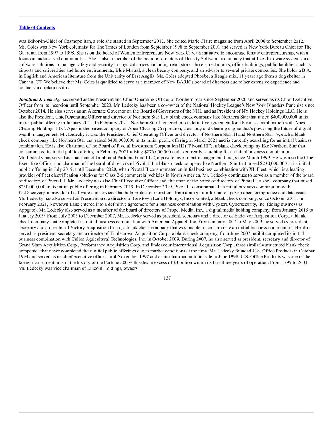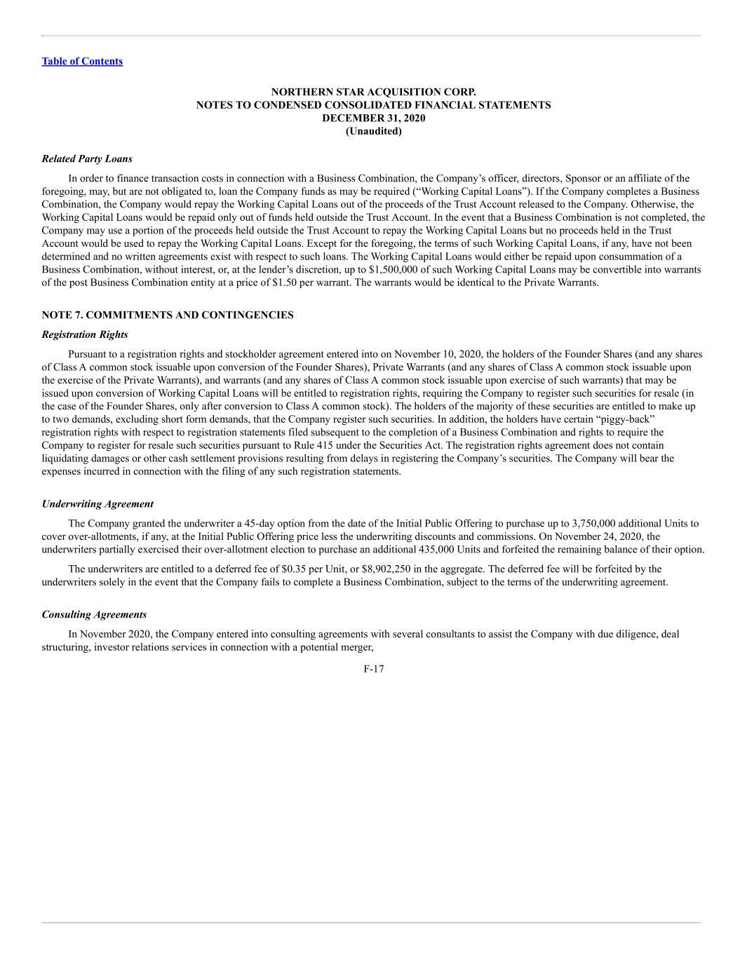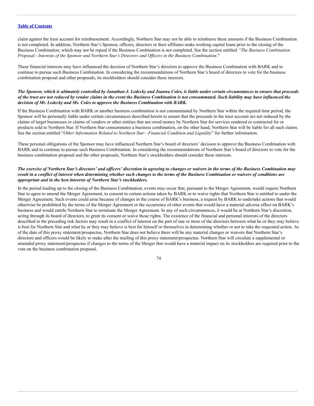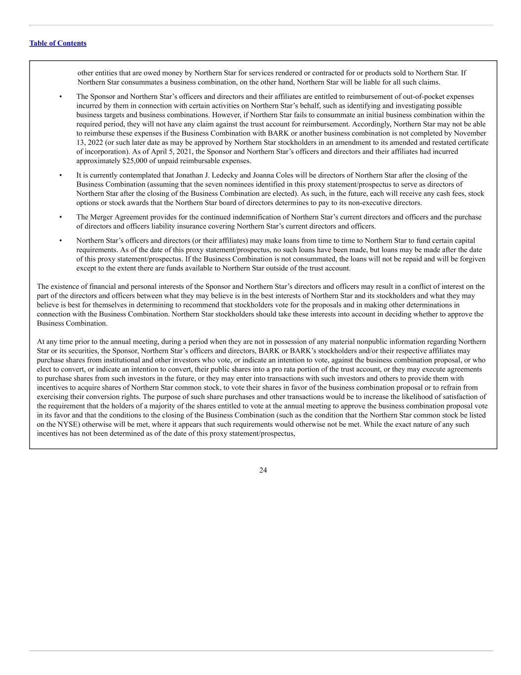 Table of Contents   other entities that are owed money by Northern Star for services rendered or contracted for or products sold to Northern Star. If Northern Star consummates a business combination, on the other hand, Northern Star will be liable for all such claims.     •   The Sponsor and Northern Star’s officers and directors and their affiliates are entitled to reimbursement of out-of-pocket expenses incurred by them in connection with certain activities on Northern Star’s behalf, such as identifying and investigating possible business targets and business combinations. However, if Northern Star fails to consummate an initial business combination within the required period, they will not have any claim against the trust account for reimbursement. Accordingly, Northern Star may not be able to reimburse these expenses if the Business Combination with BARK or another business combination is not completed by November 13, 2022 (or such later date as may be approved by Northern Star stockholders in an amendment to its amended and restated certificate of incorporation). As of April 5, 2021, the Sponsor and Northern Star’s officers and directors and their affiliates had incurred approximately $25,000 of unpaid reimbursable expenses.     •   It is currently contemplated that Jonathan J. Ledecky and Joanna Coles will be directors of Northern Star after the closing of the Business Combination (assuming that the seven nominees identified in this proxy statement/prospectus to serve as directors of Northern Star after the closing of the Business Combination are elected). As such, in the future, each will receive any cash fees, stock options or stock awards that the Northern Star board of directors determines to pay to its non-executive directors.     •   The Merger Agreement provides for the continued indemnification of Northern Star’s current directors and officers and the purchase of directors and officers liability insurance covering Northern Star’s current directors and officers.     •   Northern Star’s officers and directors (or their affiliates) may make loans from time to time to Northern Star to fund certain capital requirements. As of the date of this proxy statement/prospectus, no such loans have been made, but loans may be made after the date of this proxy statement/prospectus. If the Business Combination is not consummated, the loans will not be repaid and will be forgiven except to the extent there are funds available to Northern Star outside of the trust account. The existence of financial and personal interests of the Sponsor and Northern Star’s directors and officers may result in a conflict of interest on the part of the directors and officers between what they may believe is in the best interests of Northern Star and its stockholders and what they may believe is best for themselves in determining to recommend that stockholders vote for the proposals and in making other determinations in connection with the Business Combination. Northern Star stockholders should take these interests into account in deciding whether to approve the Business Combination. At any time prior to the annual meeting, during a period when they are not in possession of any material nonpublic information regarding Northern Star or its securities, the Sponsor, Northern Star’s officers and directors, BARK or BARK’s stockholders and/or their respective affiliates may purchase shares from institutional and other investors who vote, or indicate an intention to vote, against the business combination proposal, or who elect to convert, or indicate an intention to convert, their public shares into a pro rata portion of the trust account, or they may execute agreements to purchase shares from such investors in the future, or they may enter into transactions with such investors and others to provide them with incentives to acquire shares of Northern Star common stock, to vote their shares in favor of the business combination proposal or to refrain from exercising their conversion rights. The purpose of such share purchases and other transactions would be to increase the likelihood of satisfaction of the requirement that the holders of a majority of the shares entitled to vote at the annual meeting to approve the business combination proposal vote in its favor and that the conditions to the closing of the Business Combination (such as the condition that the Northern Star common stock be listed on the NYSE) otherwise will be met, where it appears that such requirements would otherwise not be met. While the exact nature of any such incentives has not been determined as of the date of this proxy statement/prospectus,   24