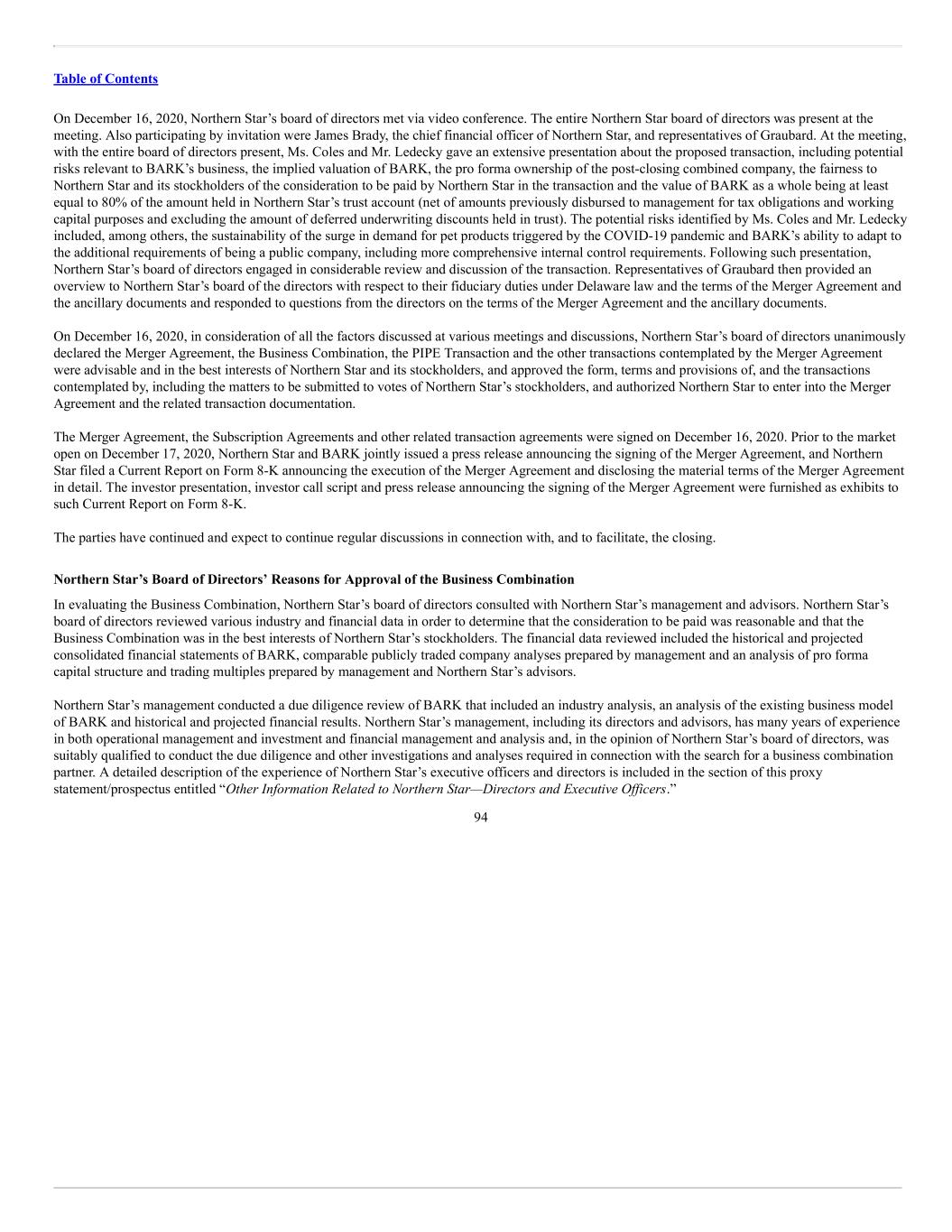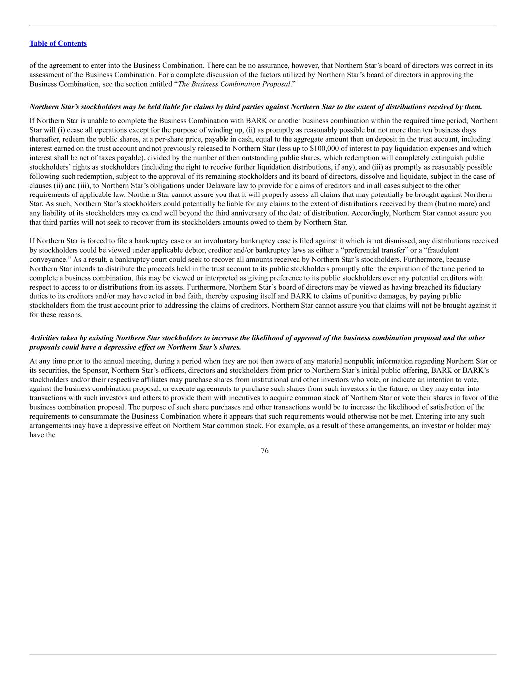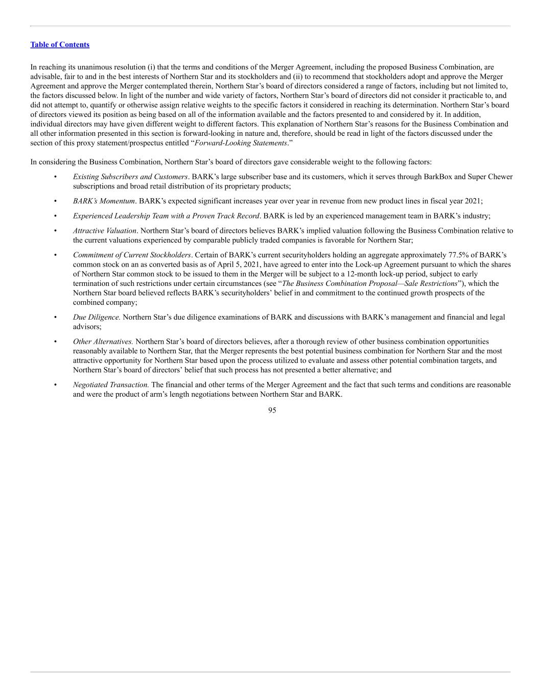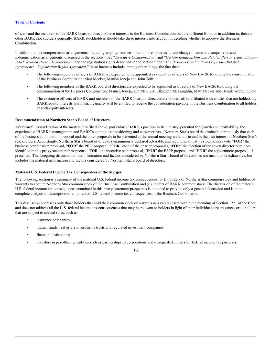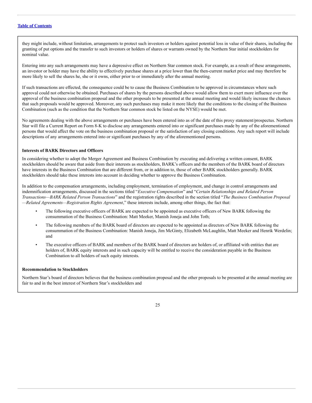 Table of Contents they might include, without limitation, arrangements to protect such investors or holders against potential loss in value of their shares, including the granting of put options and the transfer to such investors or holders of shares or warrants owned by the Northern Star initial stockholders for nominal value. Entering into any such arrangements may have a depressive effect on Northern Star common stock. For example, as a result of these arrangements, an investor or holder may have the ability to effectively purchase shares at a price lower than the then-current market price and may therefore be more likely to sell the shares he, she or it owns, either prior to or immediately after the annual meeting. If such transactions are effected, the consequence could be to cause the Business Combination to be approved in circumstances where such approval could not otherwise be obtained. Purchases of shares by the persons described above would allow them to exert more influence over the approval of the business combination proposal and the other proposals to be presented at the annual meeting and would likely increase the chances that such proposals would be approved. Moreover, any such purchases may make it more likely that the conditions to the closing of the Business Combination (such as the condition that the Northern Star common stock be listed on the NYSE) would be met. No agreements dealing with the above arrangements or purchases have been entered into as of the date of this proxy statement/prospectus. Northern Star will file a Current Report on Form 8-K to disclose any arrangements entered into or significant purchases made by any of the aforementioned persons that would affect the vote on the business combination proposal or the satisfaction of any closing conditions. Any such report will include descriptions of any arrangements entered into or significant purchases by any of the aforementioned persons. Interests of BARK Directors and Officers In considering whether to adopt the Merger Agreement and Business Combination by executing and delivering a written consent, BARK stockholders should be aware that aside from their interests as stockholders, BARK’s officers and the members of the BARK board of directors have interests in the Business Combination that are different from, or in addition to, those of other BARK stockholders generally. BARK stockholders should take these interests into account in deciding whether to approve the Business Combination. In addition to the compensation arrangements, including employment, termination of employment, and change in control arrangements and indemnification arrangements, discussed in the sections titled “Executive Compensation” and “Certain Relationships and Related Person Transactions—BARK Related Person Transactions” and the registration rights described in the section titled “The Business Combination Proposal —Related Agreements—Registration Rights Agreement,” these interests include, among other things, the fact that:     •   The following executive officers of BARK are expected to be appointed as executive officers of New BARK following the consummation of the Business Combination: Matt Meeker, Manish Joneja and John Toth;     •   The following members of the BARK board of directors are expected to be appointed as directors of New BARK following the consummation of the Business Combination: Manish Joneja, Jim McGinty, Elizabeth McLaughlin, Matt Meeker and Henrik Werdelin; and     •   The executive officers of BARK and members of the BARK board of directors are holders of, or affiliated with entities that are holders of, BARK equity interests and in such capacity will be entitled to receive the consideration payable in the Business Combination to all holders of such equity interests. Recommendation to Stockholders Northern Star’s board of directors believes that the business combination proposal and the other proposals to be presented at the annual meeting are fair to and in the best interest of Northern Star’s stockholders and   25