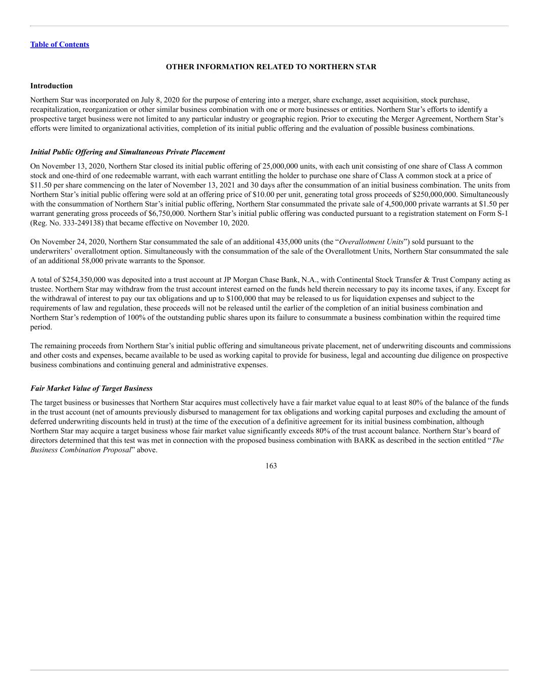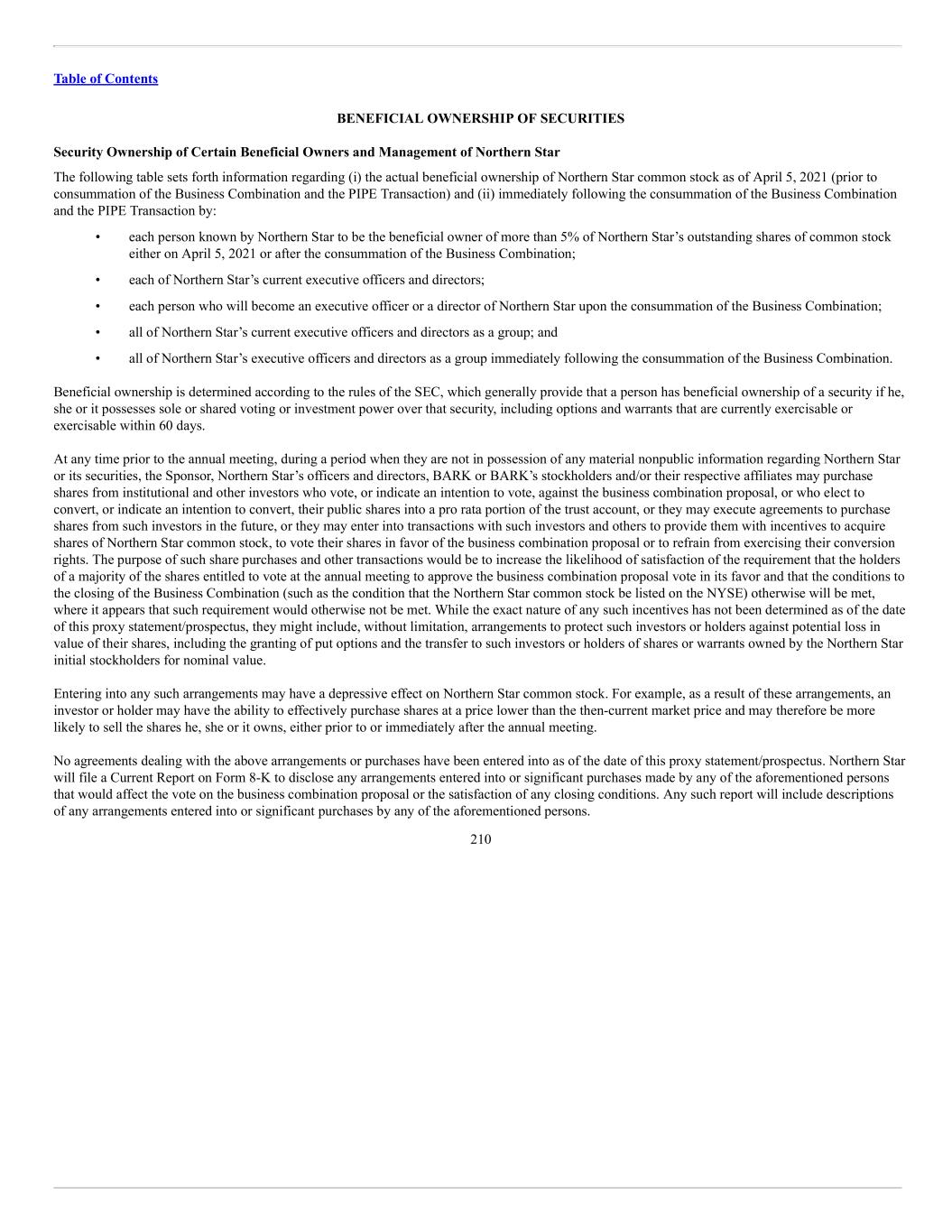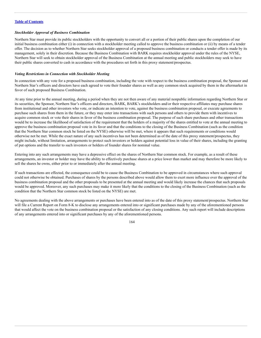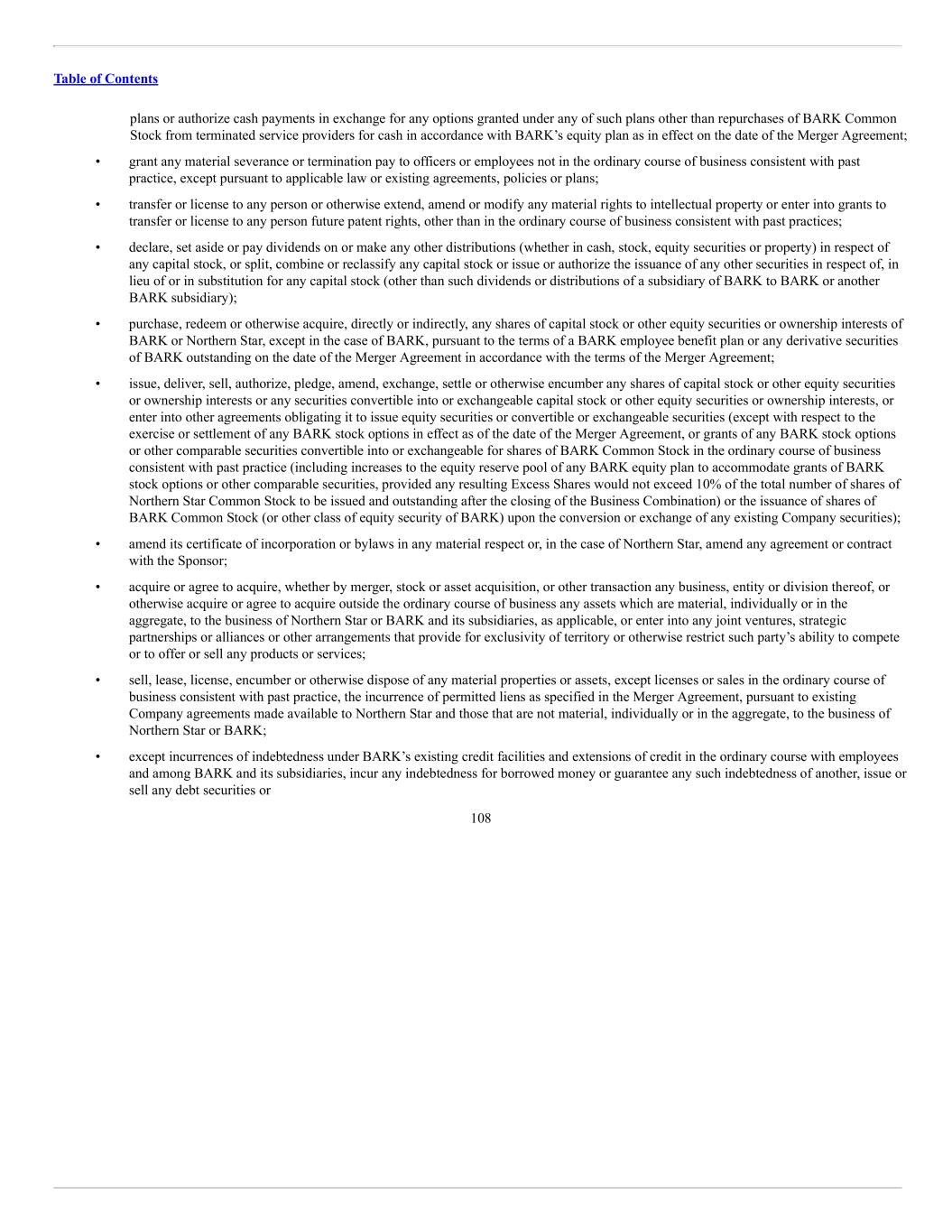 Table of Contents they might include, without limitation, arrangements to protect such investors or holders against potential loss in value of their shares, including the granting of put options and the transfer to such investors or holders of shares or warrants owned by the Northern Star initial stockholders for nominal value. Entering into any such arrangements may have a depressive effect on Northern Star common stock. For example, as a result of these arrangements, an investor or holder may have the ability to effectively purchase shares at a price lower than the then-current market price and may therefore be more likely to sell the shares he, she or it owns, either prior to or immediately after the annual meeting. If such transactions are effected, the consequence could be to cause the Business Combination to be approved in circumstances where such approval could not otherwise be obtained. Purchases of shares by the persons described above would allow them to exert more influence over the approval of the business combination proposal and the other proposals to be presented at the annual meeting and would likely increase the chances that such proposals would be approved. Moreover, any such purchases may make it more likely that the conditions to the closing of the Business Combination (such as the condition that the Northern Star common stock be listed on the NYSE) would be met. No agreements dealing with the above arrangements or purchases have been entered into as of the date of this proxy statement/prospectus. Northern Star will file a Current Report on Form 8-K to disclose any arrangements entered into or significant purchases made by any of the aforementioned persons that would affect the vote on the business combination proposal or the satisfaction of any closing conditions. Any such report will include descriptions of any arrangements entered into or significant purchases by any of the aforementioned persons. Interests of BARK Directors and Officers In considering whether to adopt the Merger Agreement and Business Combination by executing and delivering a written consent, BARK stockholders should be aware that aside from their interests as stockholders, BARK’s officers and the members of the BARK board of directors have interests in the Business Combination that are different from, or in addition to, those of other BARK stockholders generally. BARK stockholders should take these interests into account in deciding whether to approve the Business Combination. In addition to the compensation arrangements, including employment, termination of employment, and change in control arrangements and indemnification arrangements, discussed in the sections titled “Executive Compensation” and “Certain Relationships and Related Person Transactions—BARK Related Person Transactions” and the registration rights described in the section titled “The Business Combination Proposal —Related Agreements—Registration Rights Agreement,” these interests include, among other things, the fact that:     •   The following executive officers of BARK are expected to be appointed as executive officers of New BARK following the consummation of the Business Combination: Matt Meeker, Manish Joneja and John Toth;     •   The following members of the BARK board of directors are expected to be appointed as directors of New BARK following the consummation of the Business Combination: Manish Joneja, Jim McGinty, Elizabeth McLaughlin, Matt Meeker and Henrik Werdelin; and     •   The executive officers of BARK and members of the BARK board of directors are holders of, or affiliated with entities that are holders of, BARK equity interests and in such capacity will be entitled to receive the consideration payable in the Business Combination to all holders of such equity interests. Recommendation to Stockholders Northern Star’s board of directors believes that the business combination proposal and the other proposals to be presented at the annual meeting are fair to and in the best interest of Northern Star’s stockholders and   25