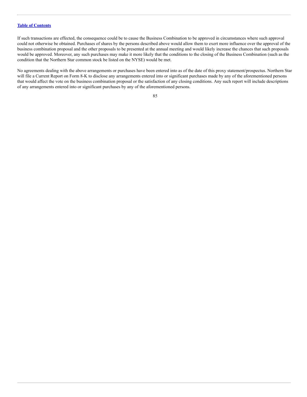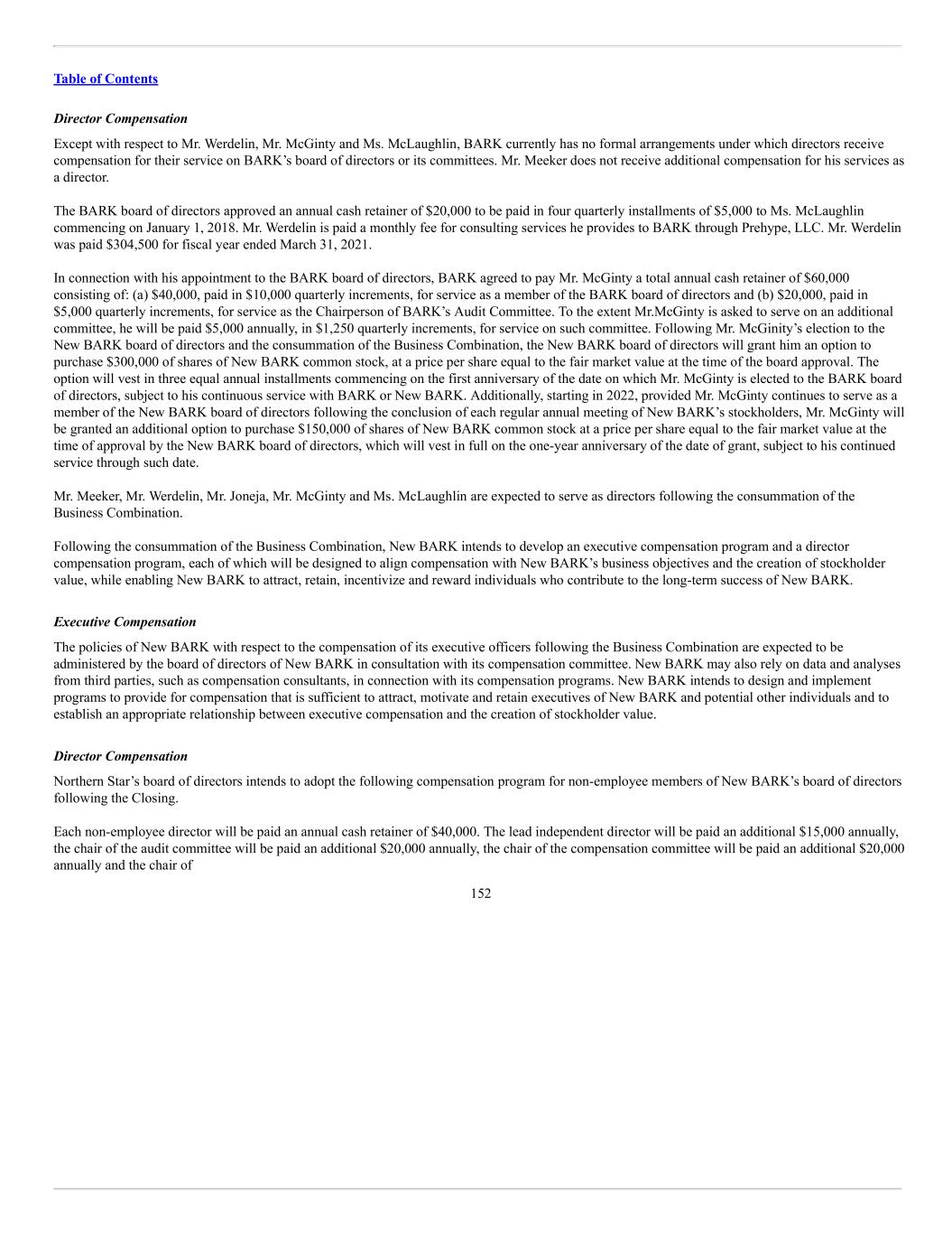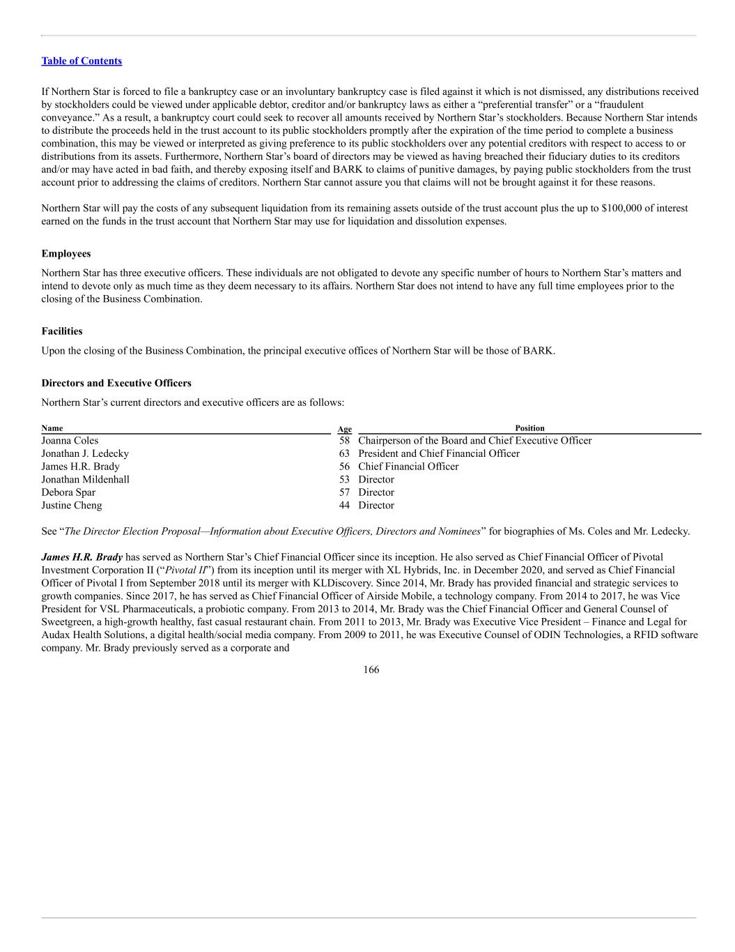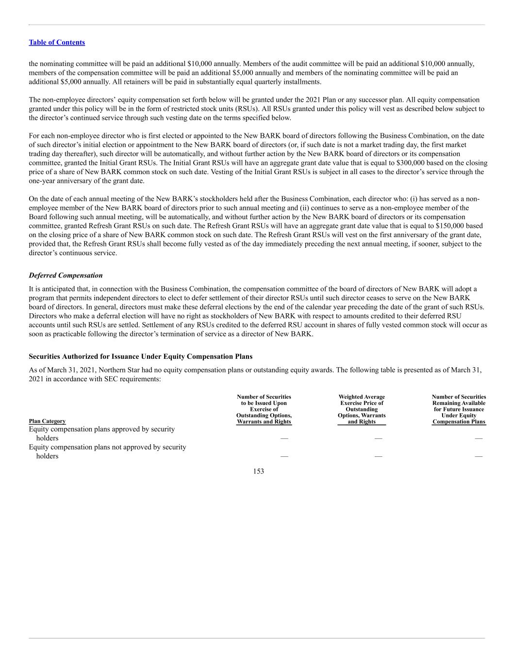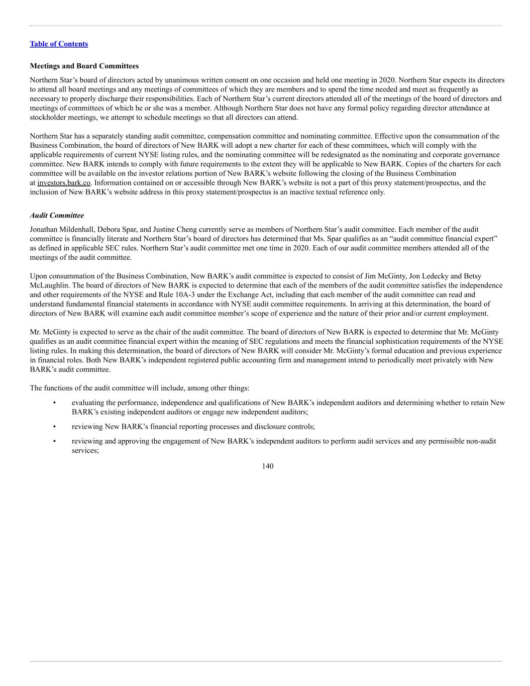Table of Contents they might include, without limitation, arrangements to protect such investors or holders against potential loss in value of their shares, including the granting of put options and the transfer to such investors or holders of shares or warrants owned by the Northern Star initial stockholders for nominal value. Entering into any such arrangements may have a depressive effect on Northern Star common stock. For example, as a result of these arrangements, an investor or holder may have the ability to effectively purchase shares at a price lower than the then-current market price and may therefore be more likely to sell the shares he, she or it owns, either prior to or immediately after the annual meeting. If such transactions are effected, the consequence could be to cause the Business Combination to be approved in circumstances where such approval could not otherwise be obtained. Purchases of shares by the persons described above would allow them to exert more influence over the approval of the business combination proposal and the other proposals to be presented at the annual meeting and would likely increase the chances that such proposals would be approved. Moreover, any such purchases may make it more likely that the conditions to the closing of the Business Combination (such as the condition that the Northern Star common stock be listed on the NYSE) would be met. No agreements dealing with the above arrangements or purchases have been entered into as of the date of this proxy statement/prospectus. Northern Star will file a Current Report on Form 8-K to disclose any arrangements entered into or significant purchases made by any of the aforementioned persons that would affect the vote on the business combination proposal or the satisfaction of any closing conditions. Any such report will include descriptions of any arrangements entered into or significant purchases by any of the aforementioned persons. Interests of BARK Directors and Officers In considering whether to adopt the Merger Agreement and Business Combination by executing and delivering a written consent, BARK stockholders should be aware that aside from their interests as stockholders, BARK’s officers and the members of the BARK board of directors have interests in the Business Combination that are different from, or in addition to, those of other BARK stockholders generally. BARK stockholders should take these interests into account in deciding whether to approve the Business Combination. In addition to the compensation arrangements, including employment, termination of employment, and change in control arrangements and indemnification arrangements, discussed in the sections titled “Executive Compensation” and “Certain Relationships and Related Person Transactions—BARK Related Person Transactions” and the registration rights described in the section titled “The Business Combination Proposal —Related Agreements—Registration Rights Agreement,” these interests include, among other things, the fact that:     •   The following executive officers of BARK are expected to be appointed as executive officers of New BARK following the consummation of the Business Combination: Matt Meeker, Manish Joneja and John Toth;     •   The following members of the BARK board of directors are expected to be appointed as directors of New BARK following the consummation of the Business Combination: Manish Joneja, Jim McGinty, Elizabeth McLaughlin, Matt Meeker and Henrik Werdelin; and     •   The executive officers of BARK and members of the BARK board of directors are holders of, or affiliated with entities that are holders of, BARK equity interests and in such capacity will be entitled to receive the consideration payable in the Business Combination to all holders of such equity interests. Recommendation to Stockholders Northern Star’s board of directors believes that the business combination proposal and the other proposals to be presented at the annual meeting are fair to and in the best interest of Northern Star’s stockholders and   25