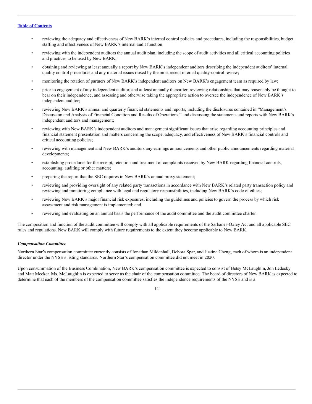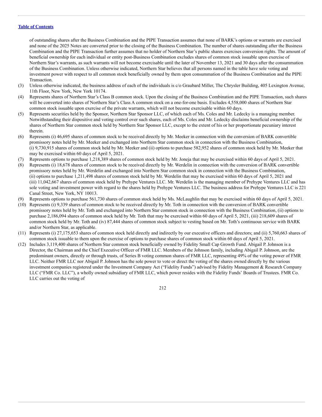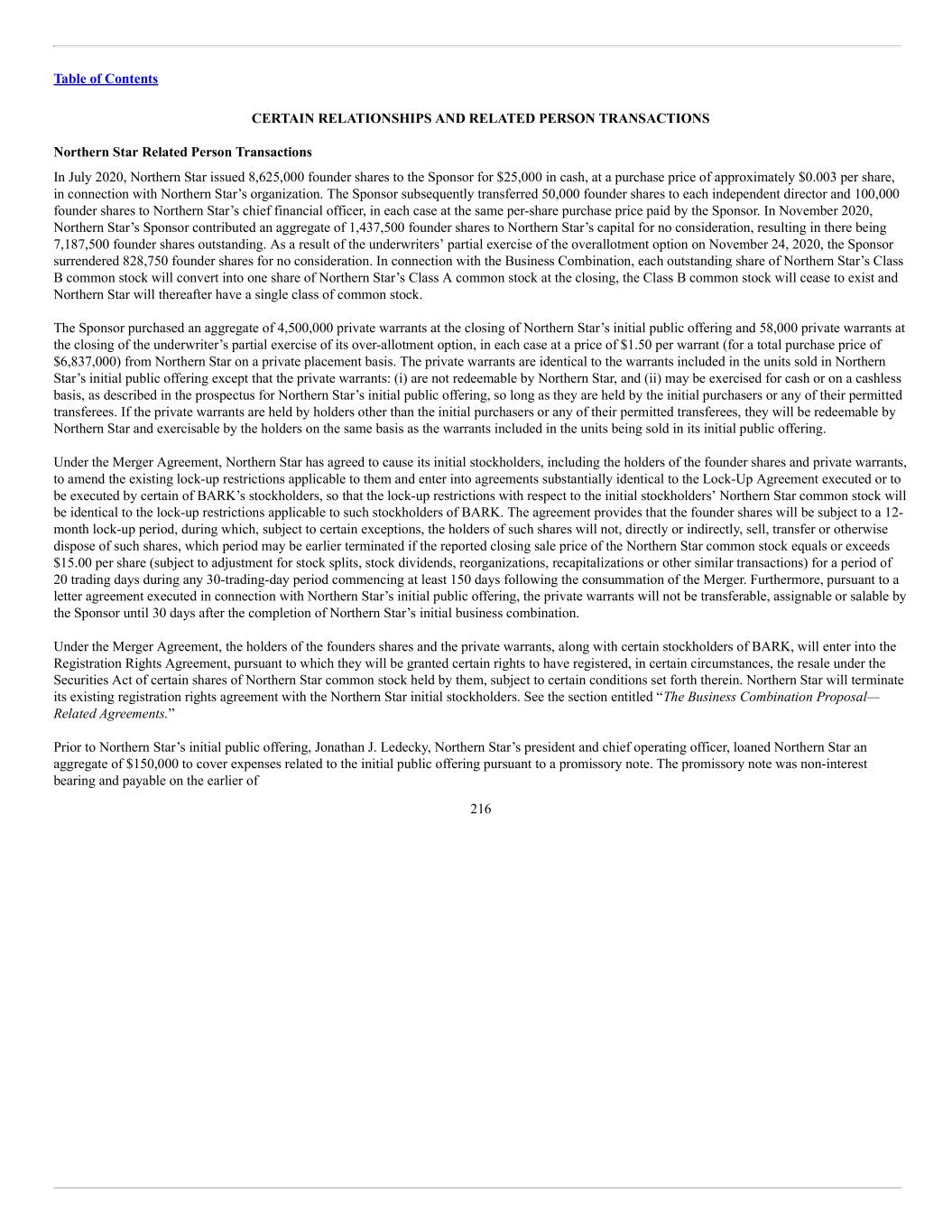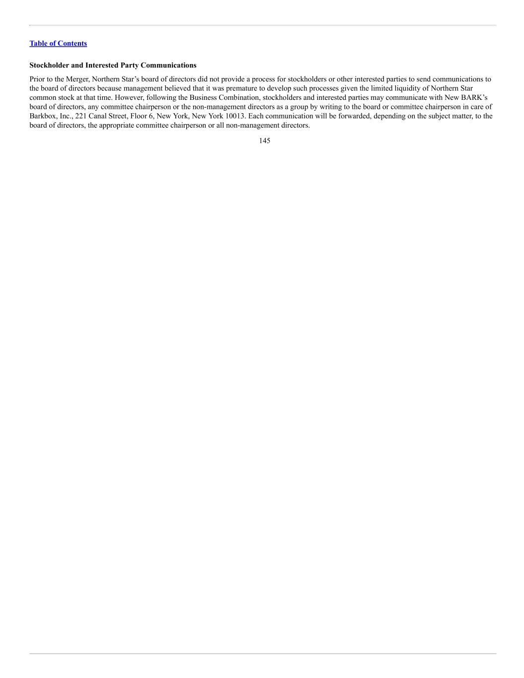 Table of Contents they might include, without limitation, arrangements to protect such investors or holders against potential loss in value of their shares, including the granting of put options and the transfer to such investors or holders of shares or warrants owned by the Northern Star initial stockholders for nominal value. Entering into any such arrangements may have a depressive effect on Northern Star common stock. For example, as a result of these arrangements, an investor or holder may have the ability to effectively purchase shares at a price lower than the then-current market price and may therefore be more likely to sell the shares he, she or it owns, either prior to or immediately after the annual meeting. If such transactions are effected, the consequence could be to cause the Business Combination to be approved in circumstances where such approval could not otherwise be obtained. Purchases of shares by the persons described above would allow them to exert more influence over the approval of the business combination proposal and the other proposals to be presented at the annual meeting and would likely increase the chances that such proposals would be approved. Moreover, any such purchases may make it more likely that the conditions to the closing of the Business Combination (such as the condition that the Northern Star common stock be listed on the NYSE) would be met. No agreements dealing with the above arrangements or purchases have been entered into as of the date of this proxy statement/prospectus. Northern Star will file a Current Report on Form 8-K to disclose any arrangements entered into or significant purchases made by any of the aforementioned persons that would affect the vote on the business combination proposal or the satisfaction of any closing conditions. Any such report will include descriptions of any arrangements entered into or significant purchases by any of the aforementioned persons. Interests of BARK Directors and Officers In considering whether to adopt the Merger Agreement and Business Combination by executing and delivering a written consent, BARK stockholders should be aware that aside from their interests as stockholders, BARK’s officers and the members of the BARK board of directors have interests in the Business Combination that are different from, or in addition to, those of other BARK stockholders generally. BARK stockholders should take these interests into account in deciding whether to approve the Business Combination. In addition to the compensation arrangements, including employment, termination of employment, and change in control arrangements and indemnification arrangements, discussed in the sections titled “Executive Compensation” and “Certain Relationships and Related Person Transactions—BARK Related Person Transactions” and the registration rights described in the section titled “The Business Combination Proposal —Related Agreements—Registration Rights Agreement,” these interests include, among other things, the fact that:     •   The following executive officers of BARK are expected to be appointed as executive officers of New BARK following the consummation of the Business Combination: Matt Meeker, Manish Joneja and John Toth;     •   The following members of the BARK board of directors are expected to be appointed as directors of New BARK following the consummation of the Business Combination: Manish Joneja, Jim McGinty, Elizabeth McLaughlin, Matt Meeker and Henrik Werdelin; and     •   The executive officers of BARK and members of the BARK board of directors are holders of, or affiliated with entities that are holders of, BARK equity interests and in such capacity will be entitled to receive the consideration payable in the Business Combination to all holders of such equity interests. Recommendation to Stockholders Northern Star’s board of directors believes that the business combination proposal and the other proposals to be presented at the annual meeting are fair to and in the best interest of Northern Star’s stockholders and   25