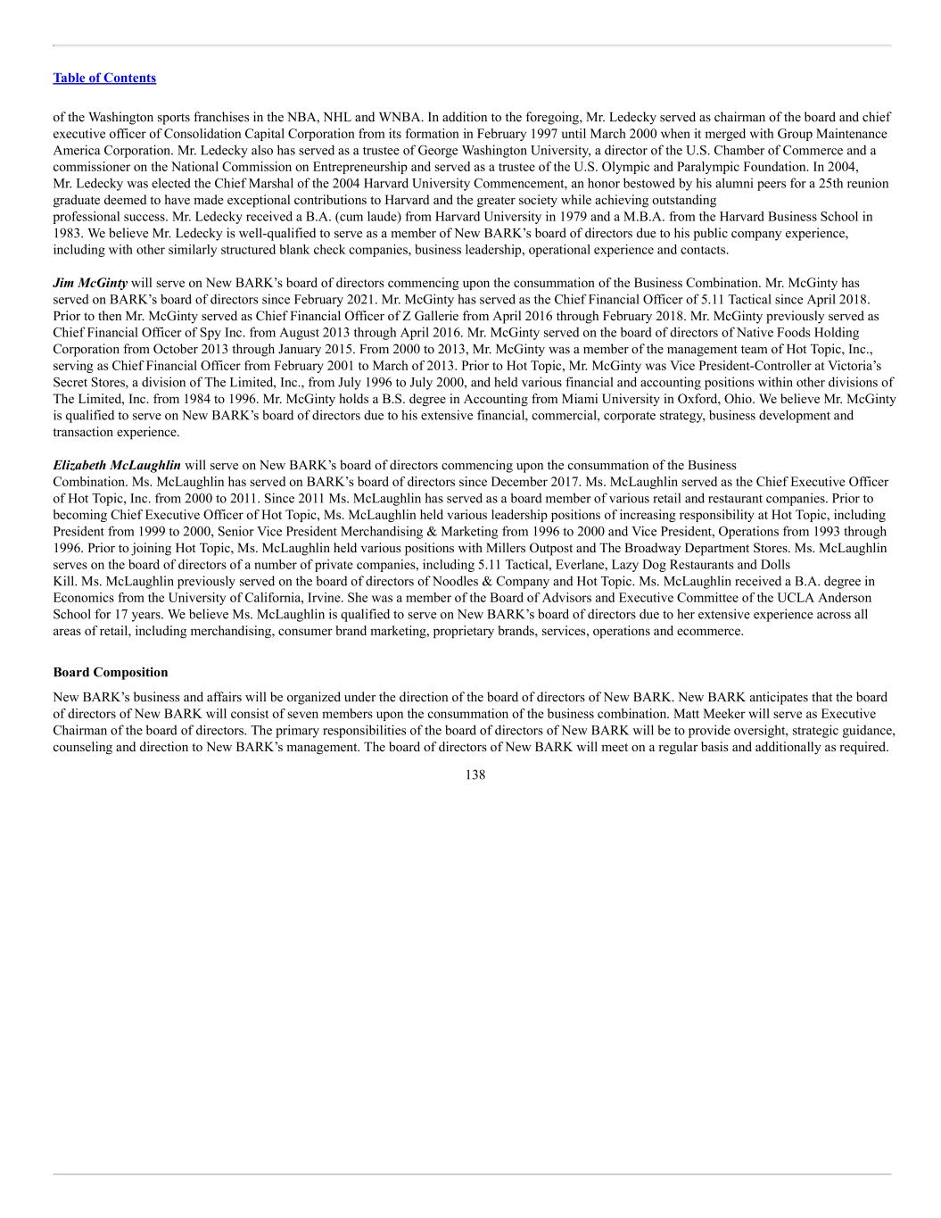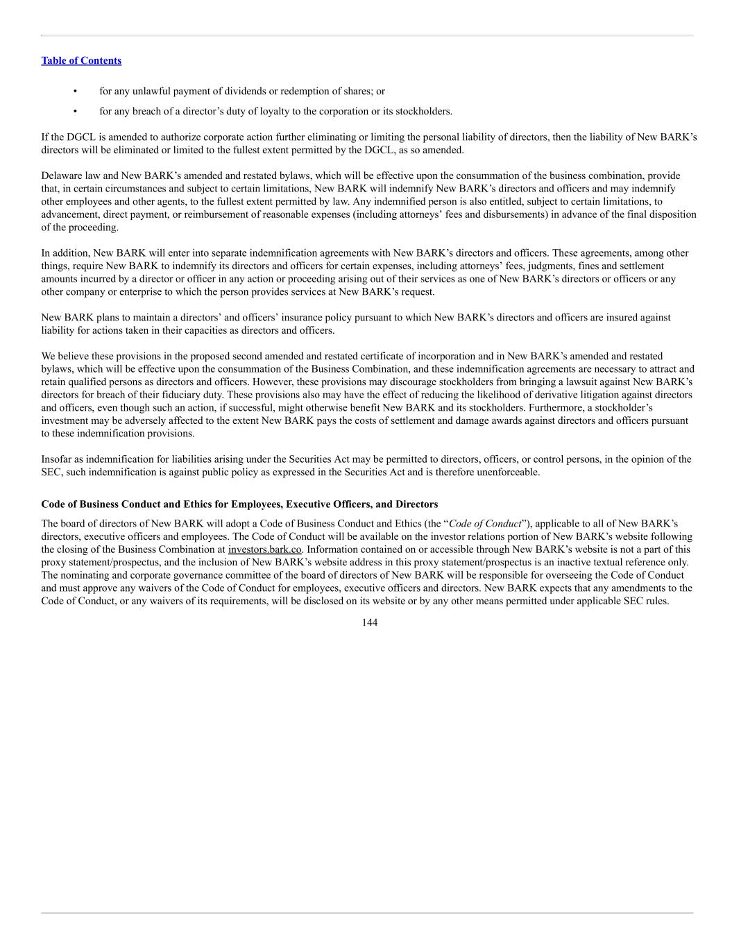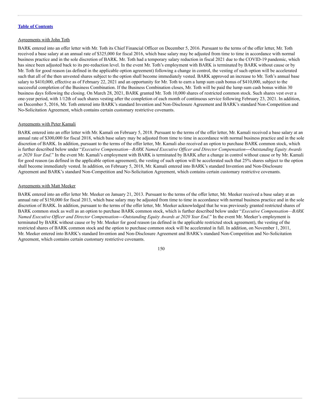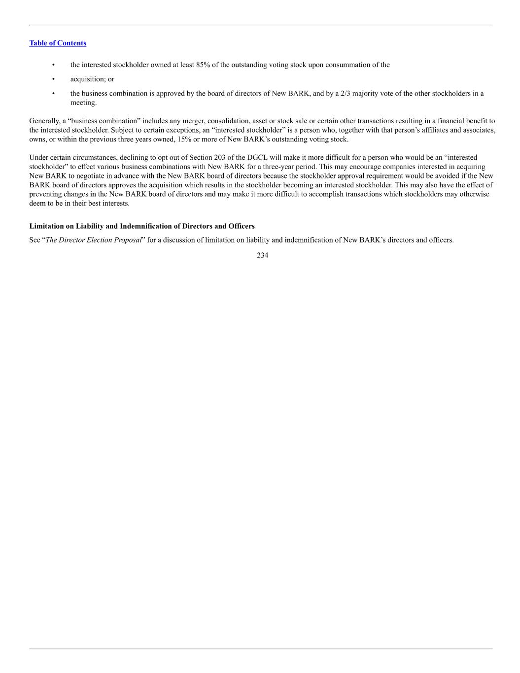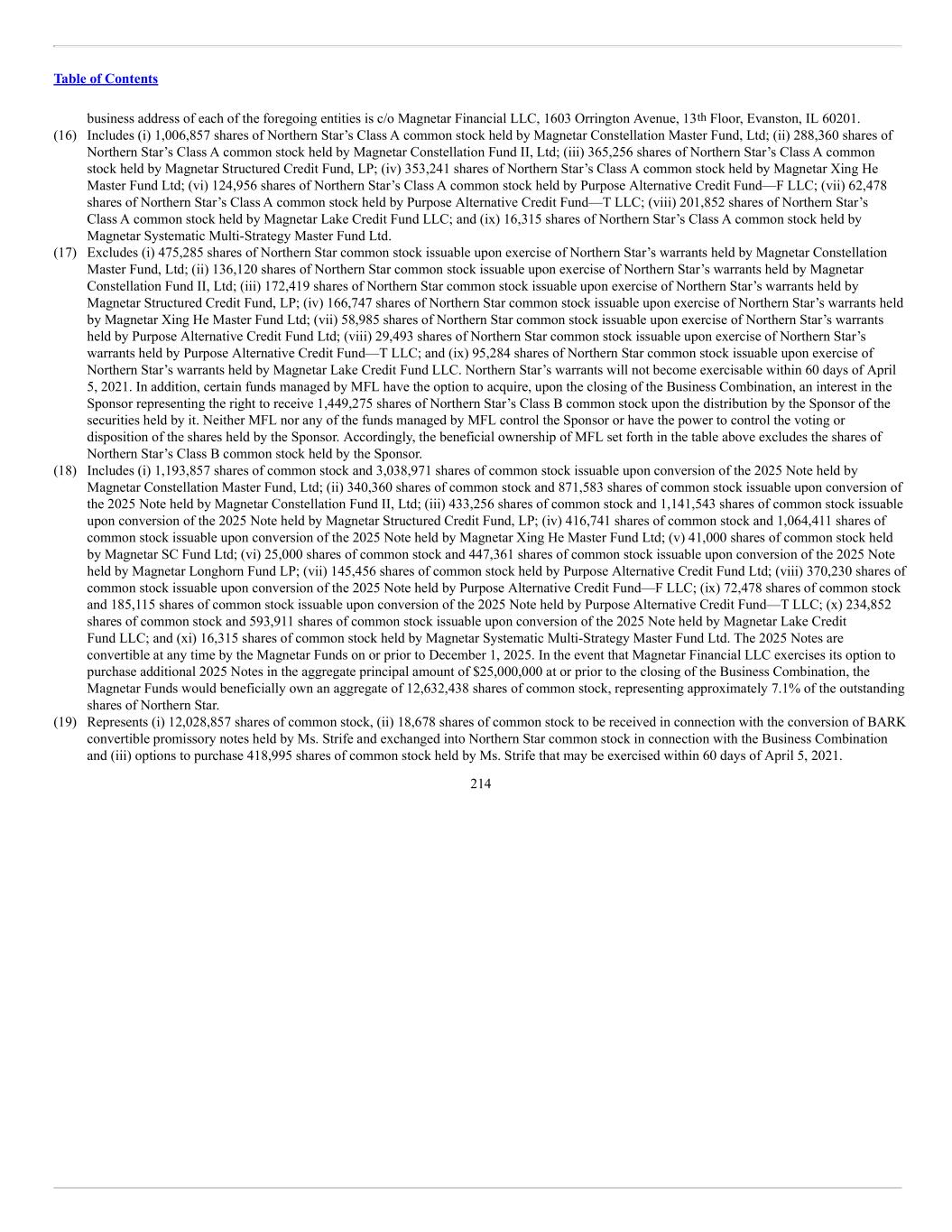 Table of Contents they might include, without limitation, arrangements to protect such investors or holders against potential loss in value of their shares, including the granting of put options and the transfer to such investors or holders of shares or warrants owned by the Northern Star initial stockholders for nominal value. Entering into any such arrangements may have a depressive effect on Northern Star common stock. For example, as a result of these arrangements, an investor or holder may have the ability to effectively purchase shares at a price lower than the then-current market price and may therefore be more likely to sell the shares he, she or it owns, either prior to or immediately after the annual meeting. If such transactions are effected, the consequence could be to cause the Business Combination to be approved in circumstances where such approval could not otherwise be obtained. Purchases of shares by the persons described above would allow them to exert more influence over the approval of the business combination proposal and the other proposals to be presented at the annual meeting and would likely increase the chances that such proposals would be approved. Moreover, any such purchases may make it more likely that the conditions to the closing of the Business Combination (such as the condition that the Northern Star common stock be listed on the NYSE) would be met. No agreements dealing with the above arrangements or purchases have been entered into as of the date of this proxy statement/prospectus. Northern Star will file a Current Report on Form 8-K to disclose any arrangements entered into or significant purchases made by any of the aforementioned persons that would affect the vote on the business combination proposal or the satisfaction of any closing conditions. Any such report will include descriptions of any arrangements entered into or significant purchases by any of the aforementioned persons. Interests of BARK Directors and Officers In considering whether to adopt the Merger Agreement and Business Combination by executing and delivering a written consent, BARK stockholders should be aware that aside from their interests as stockholders, BARK’s officers and the members of the BARK board of directors have interests in the Business Combination that are different from, or in addition to, those of other BARK stockholders generally. BARK stockholders should take these interests into account in deciding whether to approve the Business Combination. In addition to the compensation arrangements, including employment, termination of employment, and change in control arrangements and indemnification arrangements, discussed in the sections titled “Executive Compensation” and “Certain Relationships and Related Person Transactions—BARK Related Person Transactions” and the registration rights described in the section titled “The Business Combination Proposal —Related Agreements—Registration Rights Agreement,” these interests include, among other things, the fact that:     •   The following executive officers of BARK are expected to be appointed as executive officers of New BARK following the consummation of the Business Combination: Matt Meeker, Manish Joneja and John Toth;     •   The following members of the BARK board of directors are expected to be appointed as directors of New BARK following the consummation of the Business Combination: Manish Joneja, Jim McGinty, Elizabeth McLaughlin, Matt Meeker and Henrik Werdelin; and     •   The executive officers of BARK and members of the BARK board of directors are holders of, or affiliated with entities that are holders of, BARK equity interests and in such capacity will be entitled to receive the consideration payable in the Business Combination to all holders of such equity interests. Recommendation to Stockholders Northern Star’s board of directors believes that the business combination proposal and the other proposals to be presented at the annual meeting are fair to and in the best interest of Northern Star’s stockholders and   25