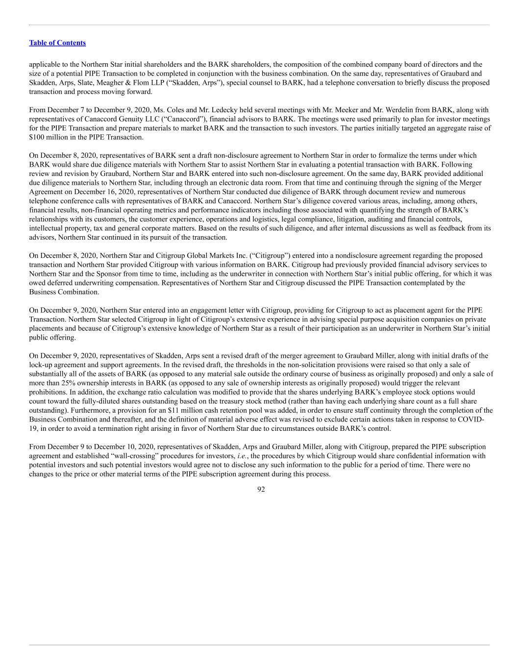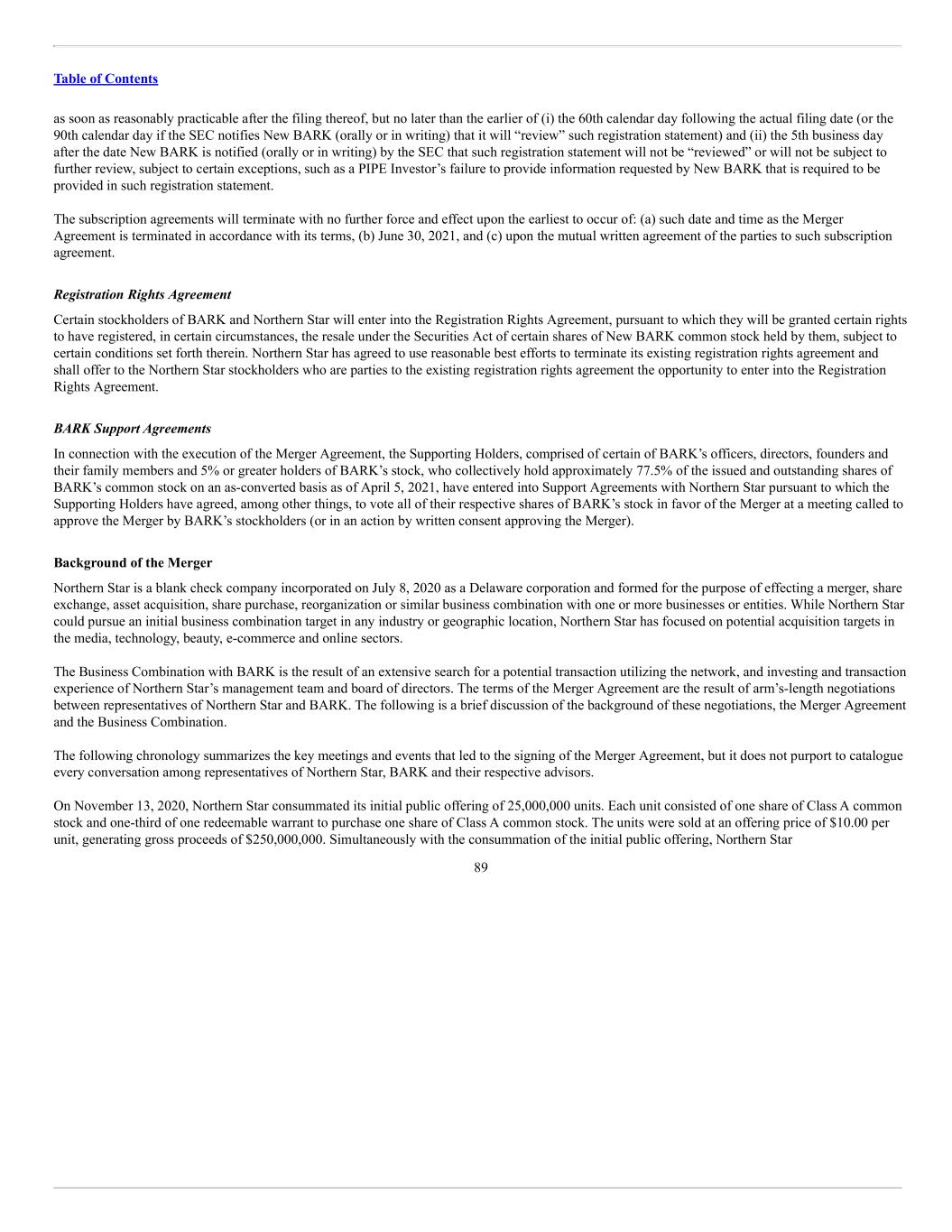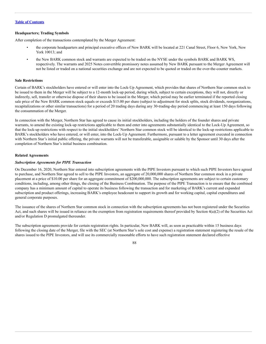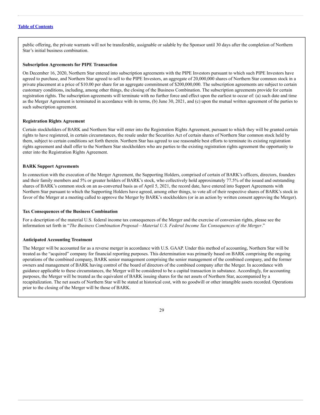 Table of Contents public offering, the private warrants will not be transferable, assignable or salable by the Sponsor until 30 days after the completion of Northern Star’s initial business combination. Subscription Agreements for PIPE Transaction On December 16, 2020, Northern Star entered into subscription agreements with the PIPE Investors pursuant to which such PIPE Investors have agreed to purchase, and Northern Star agreed to sell to the PIPE Investors, an aggregate of 20,000,000 shares of Northern Star common stock in a private placement at a price of $10.00 per share for an aggregate commitment of $200,000,000. The subscription agreements are subject to certain customary conditions, including, among other things, the closing of the Business Combination. The subscription agreements provide for certain registration rights. The subscription agreements will terminate with no further force and effect upon the earliest to occur of: (a) such date and time as the Merger Agreement is terminated in accordance with its terms, (b) June 30, 2021, and (c) upon the mutual written agreement of the parties to such subscription agreement. Registration Rights Agreement Certain stockholders of BARK and Northern Star will enter into the Registration Rights Agreement, pursuant to which they will be granted certain rights to have registered, in certain circumstances, the resale under the Securities Act of certain shares of Northern Star common stock held by them, subject to certain conditions set forth therein. Northern Star has agreed to use reasonable best efforts to terminate its existing registration rights agreement and shall offer to the Northern Star stockholders who are parties to the existing registration rights agreement the opportunity to enter into the Registration Rights Agreement. BARK Support Agreements In connection with the execution of the Merger Agreement, the Supporting Holders, comprised of certain of BARK’s officers, directors, founders and their family members and 5% or greater holders of BARK’s stock, who collectively hold approximately 77.5% of the issued and outstanding shares of BARK’s common stock on an as-converted basis as of April 5, 2021, the record date, have entered into Support Agreements with Northern Star pursuant to which the Supporting Holders have agreed, among other things, to vote all of their respective shares of BARK’s stock in favor of the Merger at a meeting called to approve the Merger by BARK’s stockholders (or in an action by written consent approving the Merger). Tax Consequences of the Business Combination For a description of the material U.S. federal income tax consequences of the Merger and the exercise of conversion rights, please see the information set forth in “The Business Combination Proposal—Material U.S. Federal Income Tax Consequences of the Merger.” Anticipated Accounting Treatment The Merger will be accounted for as a reverse merger in accordance with U.S. GAAP. Under this method of accounting, Northern Star will be treated as the “acquired” company for financial reporting purposes. This determination was primarily based on BARK comprising the ongoing operations of the combined company, BARK senior management comprising the senior management of the combined company, and the former owners and management of BARK having control of the board of directors of the combined company after the Merger. In accordance with guidance applicable to these circumstances, the Merger will be considered to be a capital transaction in substance. Accordingly, for accounting purposes, the Merger will be treated as the equivalent of BARK issuing shares for the net assets of Northern Star, accompanied by a recapitalization. The net assets of Northern Star will be stated at historical cost, with no goodwill or other intangible assets recorded. Operations prior to the closing of the Merger will be those of BARK.   29
