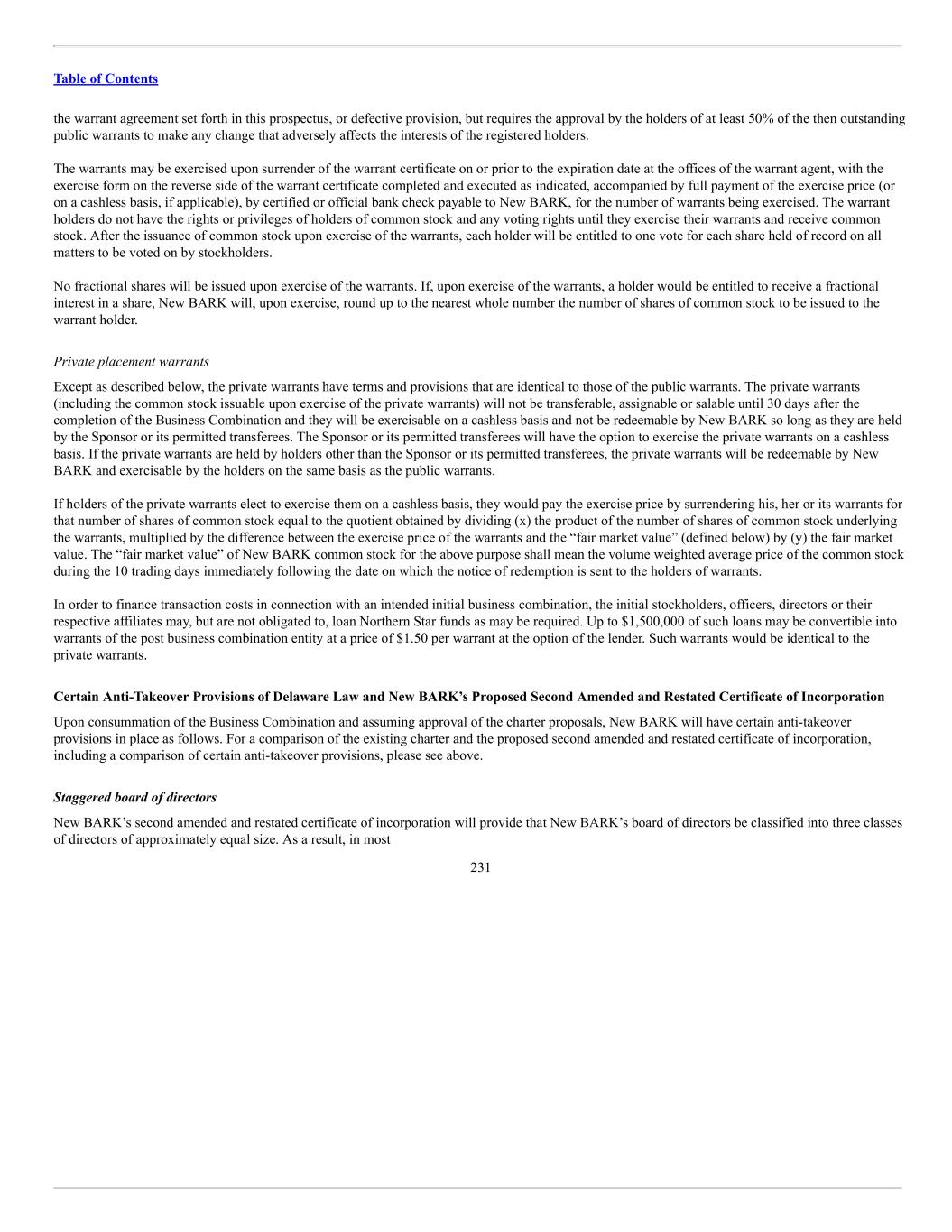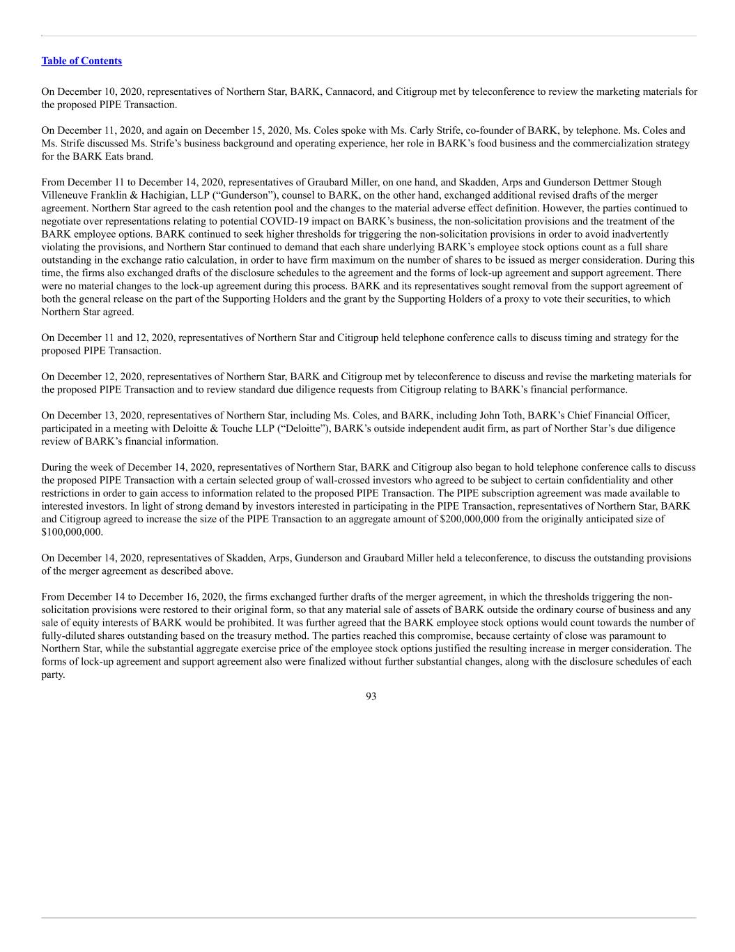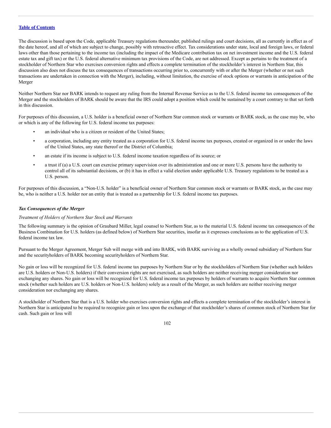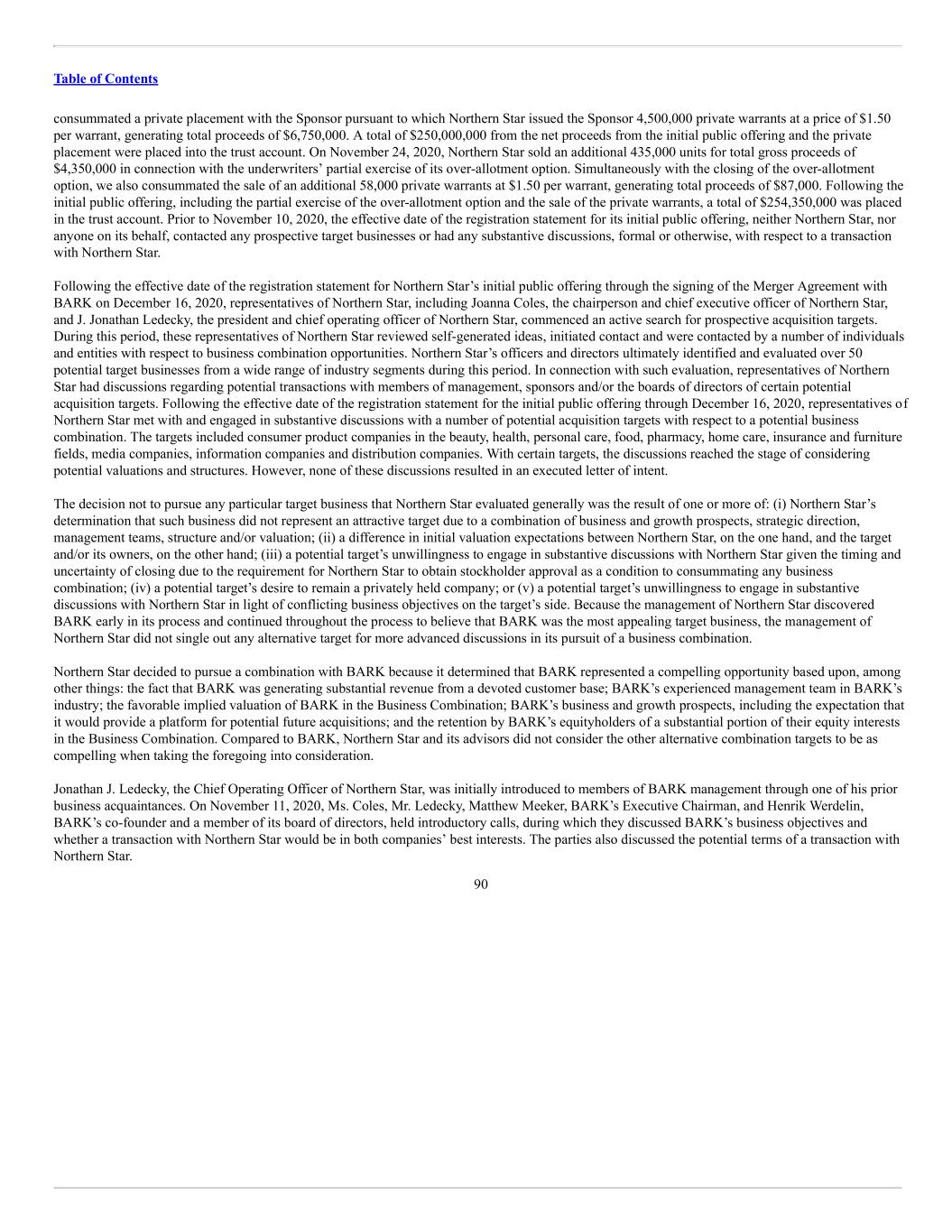 Table of Contents public offering, the private warrants will not be transferable, assignable or salable by the Sponsor until 30 days after the completion of Northern Star’s initial business combination. Subscription Agreements for PIPE Transaction On December 16, 2020, Northern Star entered into subscription agreements with the PIPE Investors pursuant to which such PIPE Investors have agreed to purchase, and Northern Star agreed to sell to the PIPE Investors, an aggregate of 20,000,000 shares of Northern Star common stock in a private placement at a price of $10.00 per share for an aggregate commitment of $200,000,000. The subscription agreements are subject to certain customary conditions, including, among other things, the closing of the Business Combination. The subscription agreements provide for certain registration rights. The subscription agreements will terminate with no further force and effect upon the earliest to occur of: (a) such date and time as the Merger Agreement is terminated in accordance with its terms, (b) June 30, 2021, and (c) upon the mutual written agreement of the parties to such subscription agreement. Registration Rights Agreement Certain stockholders of BARK and Northern Star will enter into the Registration Rights Agreement, pursuant to which they will be granted certain rights to have registered, in certain circumstances, the resale under the Securities Act of certain shares of Northern Star common stock held by them, subject to certain conditions set forth therein. Northern Star has agreed to use reasonable best efforts to terminate its existing registration rights agreement and shall offer to the Northern Star stockholders who are parties to the existing registration rights agreement the opportunity to enter into the Registration Rights Agreement. BARK Support Agreements In connection with the execution of the Merger Agreement, the Supporting Holders, comprised of certain of BARK’s officers, directors, founders and their family members and 5% or greater holders of BARK’s stock, who collectively hold approximately 77.5% of the issued and outstanding shares of BARK’s common stock on an as-converted basis as of April 5, 2021, the record date, have entered into Support Agreements with Northern Star pursuant to which the Supporting Holders have agreed, among other things, to vote all of their respective shares of BARK’s stock in favor of the Merger at a meeting called to approve the Merger by BARK’s stockholders (or in an action by written consent approving the Merger). Tax Consequences of the Business Combination For a description of the material U.S. federal income tax consequences of the Merger and the exercise of conversion rights, please see the information set forth in “The Business Combination Proposal—Material U.S. Federal Income Tax Consequences of the Merger.” Anticipated Accounting Treatment The Merger will be accounted for as a reverse merger in accordance with U.S. GAAP. Under this method of accounting, Northern Star will be treated as the “acquired” company for financial reporting purposes. This determination was primarily based on BARK comprising the ongoing operations of the combined company, BARK senior management comprising the senior management of the combined company, and the former owners and management of BARK having control of the board of directors of the combined company after the Merger. In accordance with guidance applicable to these circumstances, the Merger will be considered to be a capital transaction in substance. Accordingly, for accounting purposes, the Merger will be treated as the equivalent of BARK issuing shares for the net assets of Northern Star, accompanied by a recapitalization. The net assets of Northern Star will be stated at historical cost, with no goodwill or other intangible assets recorded. Operations prior to the closing of the Merger will be those of BARK.   29