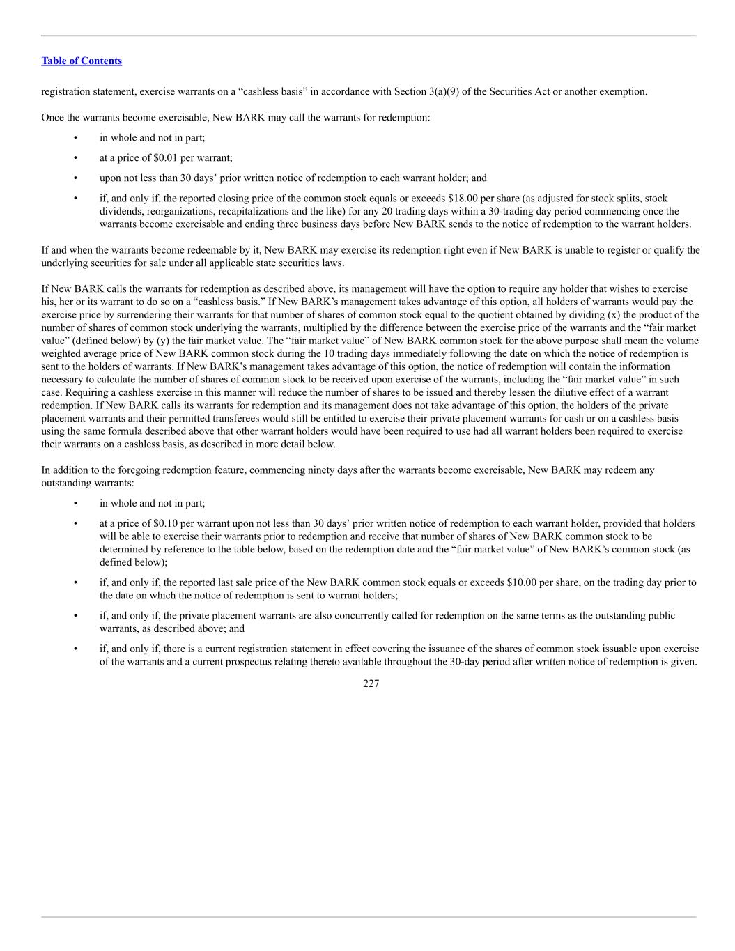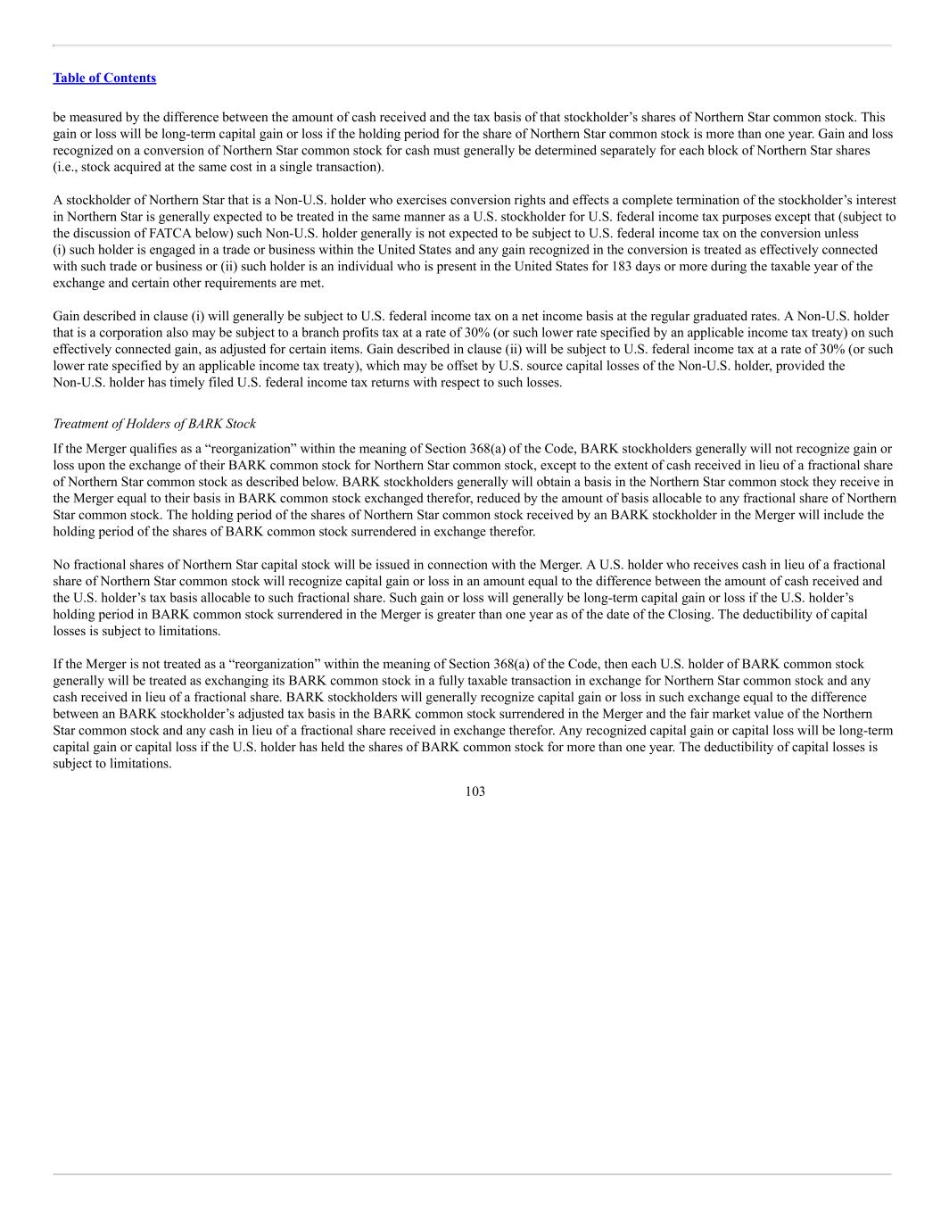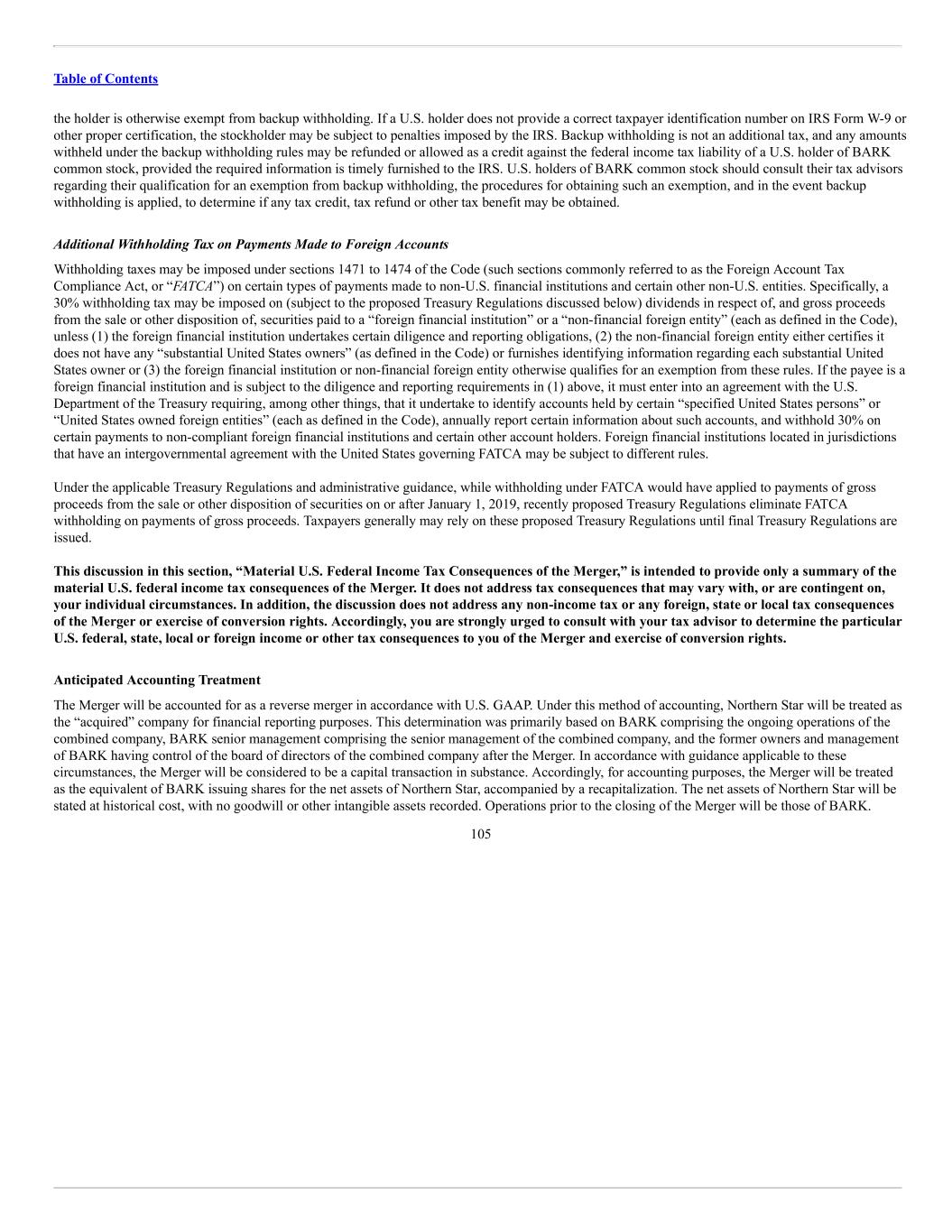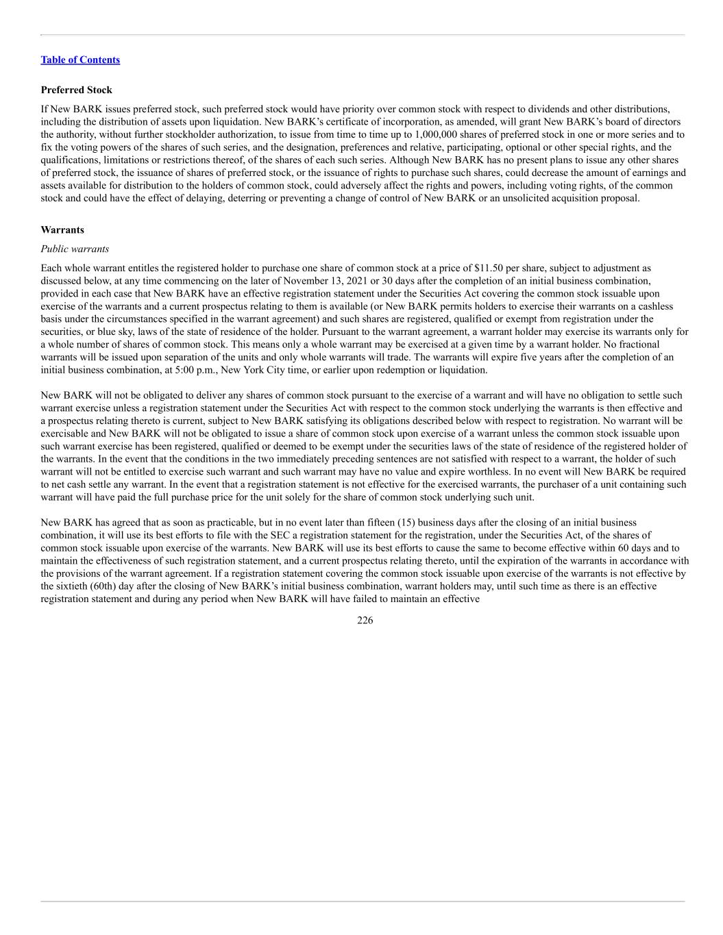 Table of Contents public offering, the private warrants will not be transferable, assignable or salable by the Sponsor until 30 days after the completion of Northern Star’s initial business combination. Subscription Agreements for PIPE Transaction On December 16, 2020, Northern Star entered into subscription agreements with the PIPE Investors pursuant to which such PIPE Investors have agreed to purchase, and Northern Star agreed to sell to the PIPE Investors, an aggregate of 20,000,000 shares of Northern Star common stock in a private placement at a price of $10.00 per share for an aggregate commitment of $200,000,000. The subscription agreements are subject to certain customary conditions, including, among other things, the closing of the Business Combination. The subscription agreements provide for certain registration rights. The subscription agreements will terminate with no further force and effect upon the earliest to occur of: (a) such date and time as the Merger Agreement is terminated in accordance with its terms, (b) June 30, 2021, and (c) upon the mutual written agreement of the parties to such subscription agreement. Registration Rights Agreement Certain stockholders of BARK and Northern Star will enter into the Registration Rights Agreement, pursuant to which they will be granted certain rights to have registered, in certain circumstances, the resale under the Securities Act of certain shares of Northern Star common stock held by them, subject to certain conditions set forth therein. Northern Star has agreed to use reasonable best efforts to terminate its existing registration rights agreement and shall offer to the Northern Star stockholders who are parties to the existing registration rights agreement the opportunity to enter into the Registration Rights Agreement. BARK Support Agreements In connection with the execution of the Merger Agreement, the Supporting Holders, comprised of certain of BARK’s officers, directors, founders and their family members and 5% or greater holders of BARK’s stock, who collectively hold approximately 77.5% of the issued and outstanding shares of BARK’s common stock on an as-converted basis as of April 5, 2021, the record date, have entered into Support Agreements with Northern Star pursuant to which the Supporting Holders have agreed, among other things, to vote all of their respective shares of BARK’s stock in favor of the Merger at a meeting called to approve the Merger by BARK’s stockholders (or in an action by written consent approving the Merger). Tax Consequences of the Business Combination For a description of the material U.S. federal income tax consequences of the Merger and the exercise of conversion rights, please see the information set forth in “The Business Combination Proposal—Material U.S. Federal Income Tax Consequences of the Merger.” Anticipated Accounting Treatment The Merger will be accounted for as a reverse merger in accordance with U.S. GAAP. Under this method of accounting, Northern Star will be treated as the “acquired” company for financial reporting purposes. This determination was primarily based on BARK comprising the ongoing operations of the combined company, BARK senior management comprising the senior management of the combined company, and the former owners and management of BARK having control of the board of directors of the combined company after the Merger. In accordance with guidance applicable to these circumstances, the Merger will be considered to be a capital transaction in substance. Accordingly, for accounting purposes, the Merger will be treated as the equivalent of BARK issuing shares for the net assets of Northern Star, accompanied by a recapitalization. The net assets of Northern Star will be stated at historical cost, with no goodwill or other intangible assets recorded. Operations prior to the closing of the Merger will be those of BARK.   29
