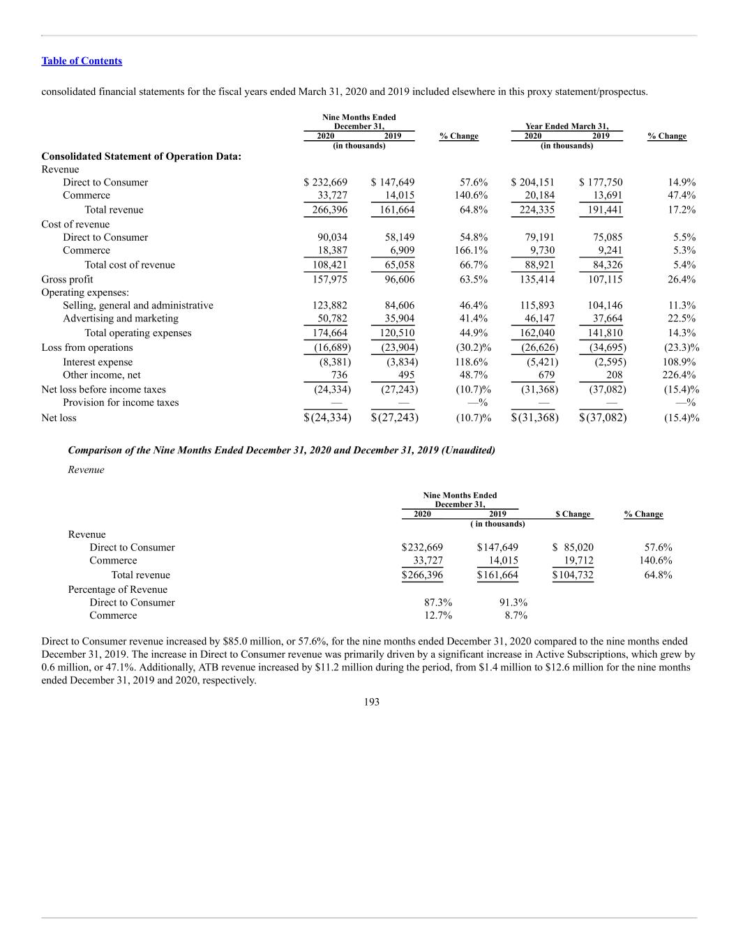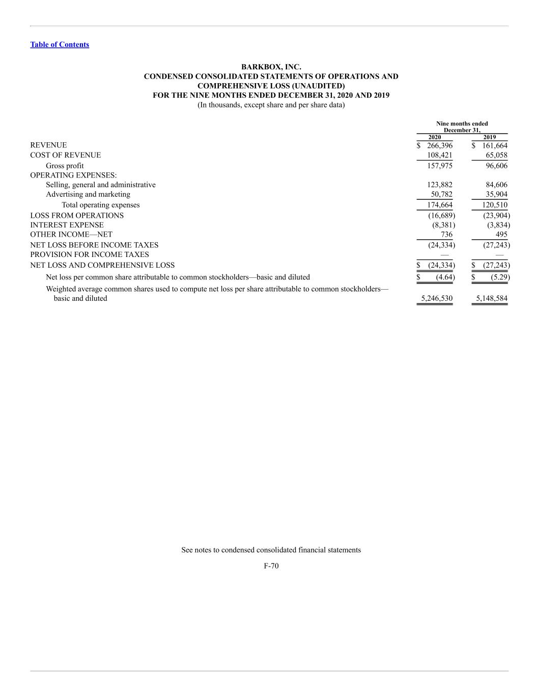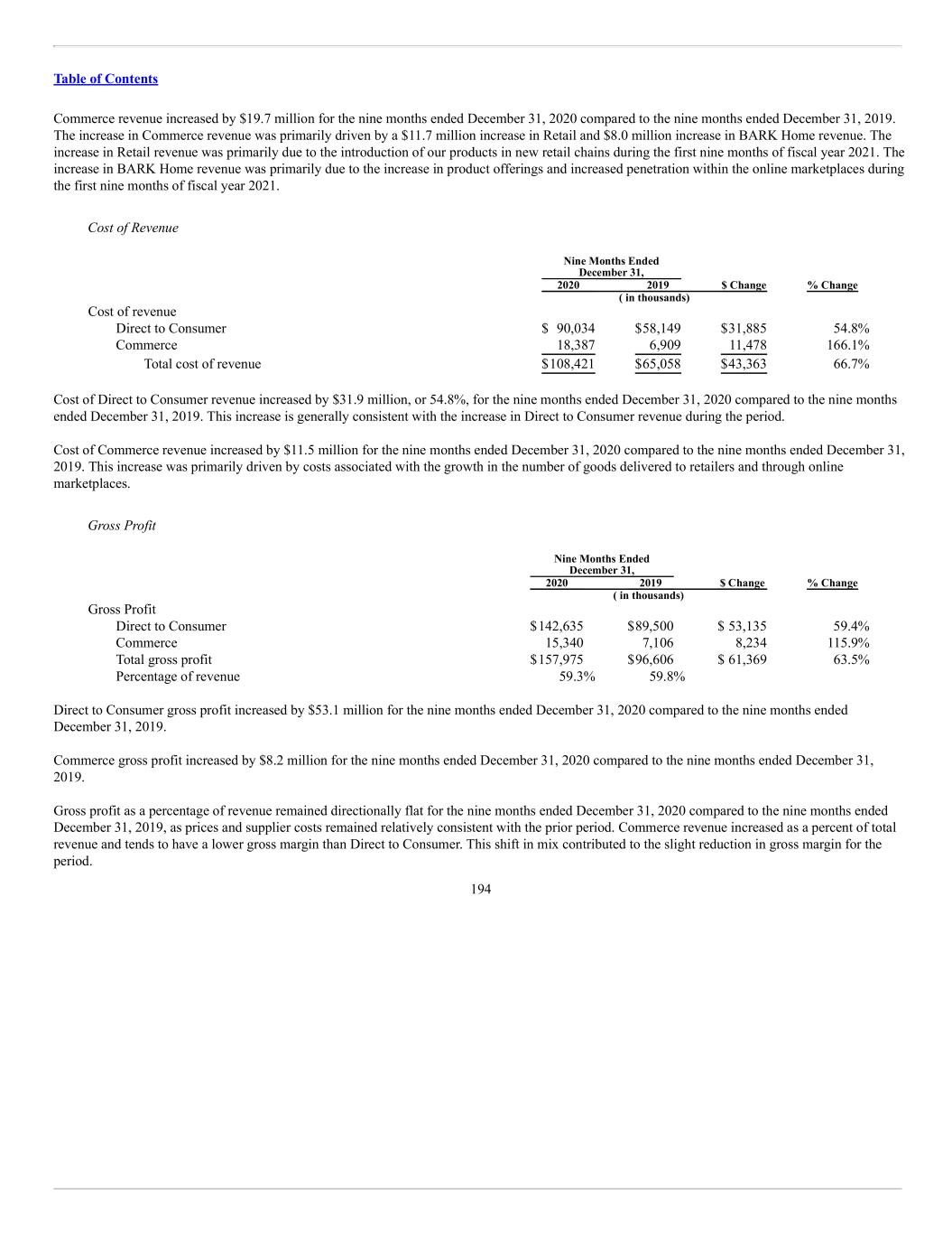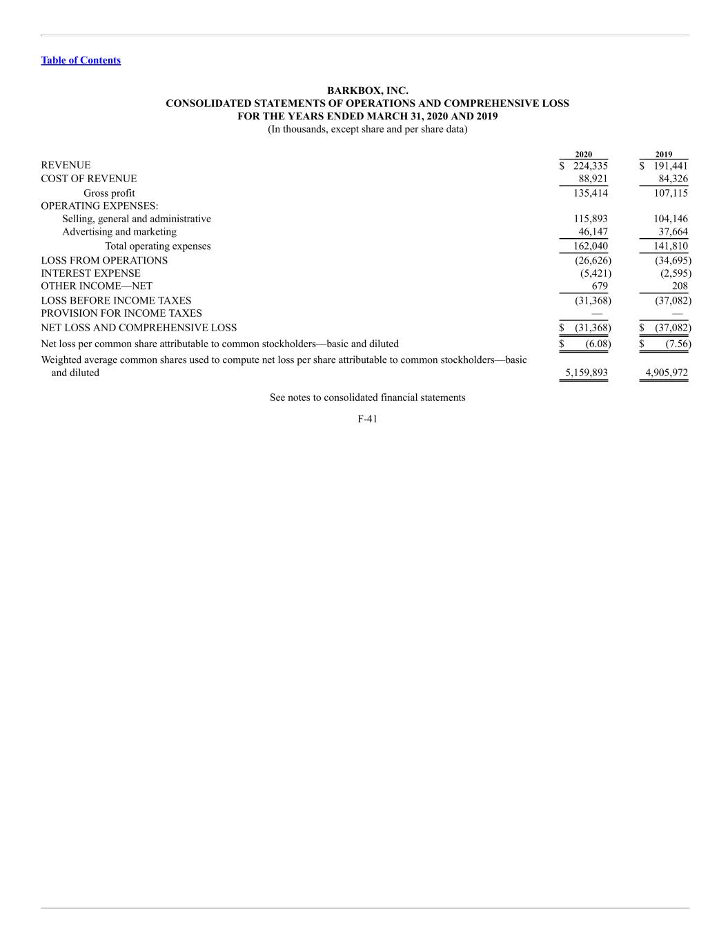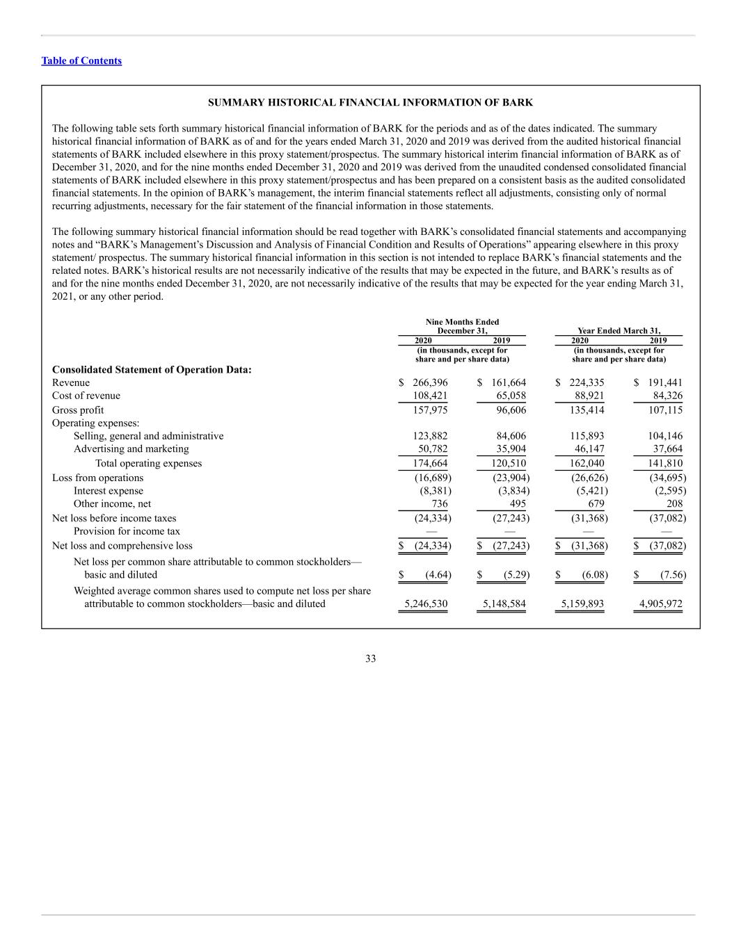 Table of Contents SUMMARY HISTORICAL FINANCIAL INFORMATION OF BARK The following table sets forth summary historical financial information of BARK for the periods and as of the dates indicated. The summary historical financial information of BARK as of and for the years ended March 31, 2020 and 2019 was derived from the audited historical financial statements of BARK included elsewhere in this proxy statement/prospectus. The summary historical interim financial information of BARK as of December 31, 2020, and for the nine months ended December 31, 2020 and 2019 was derived from the unaudited condensed consolidated financial statements of BARK included elsewhere in this proxy statement/prospectus and has been prepared on a consistent basis as the audited consolidated financial statements. In the opinion of BARK’s management, the interim financial statements reflect all adjustments, consisting only of normal recurring adjustments, necessary for the fair statement of the financial information in those statements. The following summary historical financial information should be read together with BARK’s consolidated financial statements and accompanying notes and “BARK’s Management’s Discussion and Analysis of Financial Condition and Results of Operations” appearing elsewhere in this proxy statement/ prospectus. The summary historical financial information in this section is not intended to replace BARK’s financial statements and the related notes. BARK’s historical results are not necessarily indicative of the results that may be expected in the future, and BARK’s results as of and for the nine months ended December 31, 2020, are not necessarily indicative of the results that may be expected for the year ending March 31, 2021, or any other period.        Nine Months Ended  December 31,     Year Ended March 31,        2020     2019     2020     2019        (in thousands, except for  share and per share data)     (in thousands, except for  share and per share data)   Consolidated Statement of Operation Data:          Revenue    $ 266,396    $ 161,664    $ 224,335    $ 191,441  Cost of revenue      108,421      65,058      88,921      84,326                                    Gross profit      157,975      96,606      135,414      107,115  Operating expenses:          Selling, general and administrative      123,882      84,606      115,893      104,146  Advertising and marketing      50,782      35,904      46,147      37,664                                    Total operating expenses      174,664      120,510      162,040      141,810                                    Loss from operations      (16,689)     (23,904)     (26,626)     (34,695)  Interest expense      (8,381)     (3,834)     (5,421)     (2,595)  Other income, net      736      495      679      208                                    Net loss before income taxes      (24,334)     (27,243)     (31,368)     (37,082)  Provision for income tax      —          —          —          —                                        Net loss and comprehensive loss    $ (24,334)   $ (27,243)   $ (31,368)   $ (37,082)                                    Net loss per common share attributable to common stockholders— basic and diluted    $ (4.64)   $ (5.29)   $ (6.08)   $ (7.56)                                    Weighted average common shares used to compute net loss per share attributable to common stockholders—basic and diluted      5,246,530      5,148,584      5,159,893      4,905,972                                      33