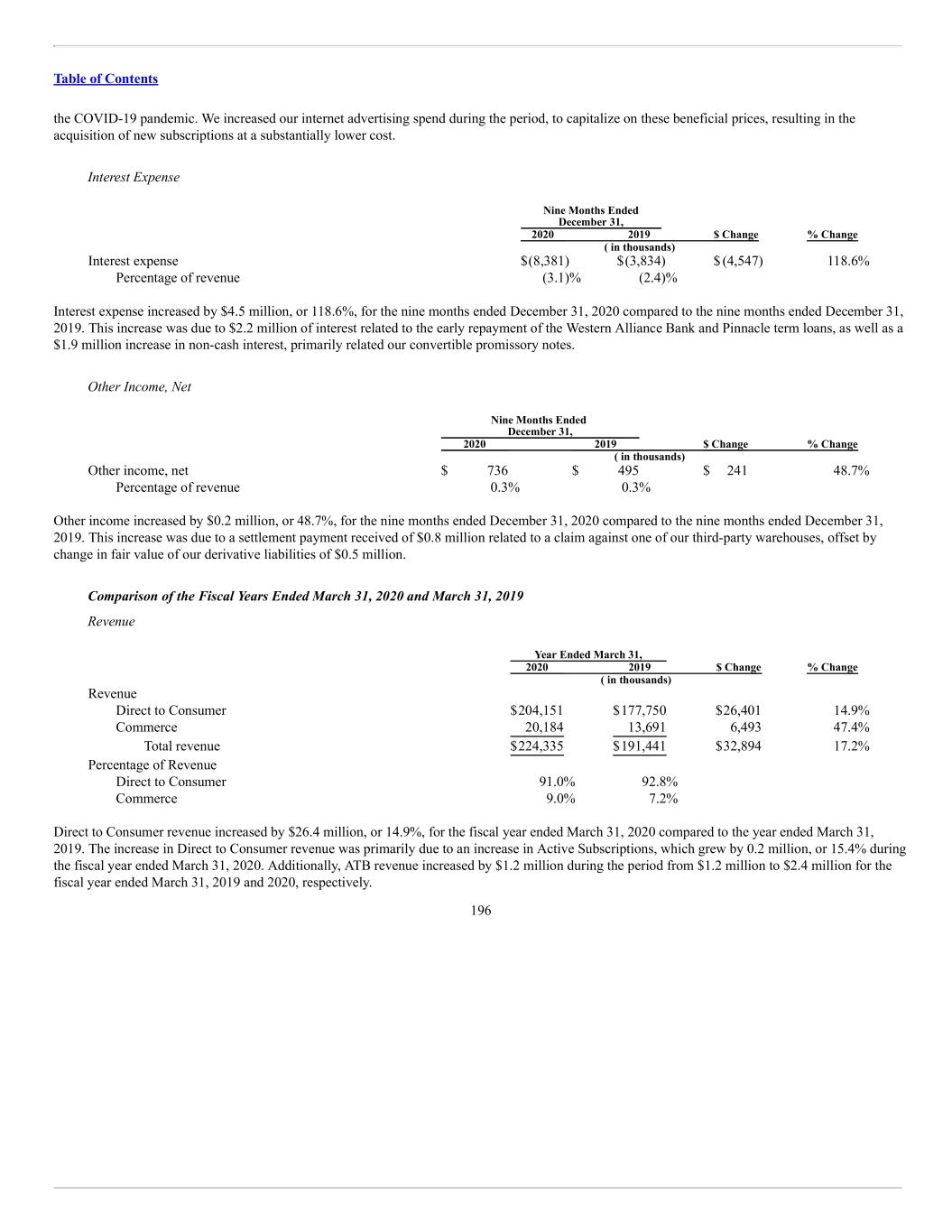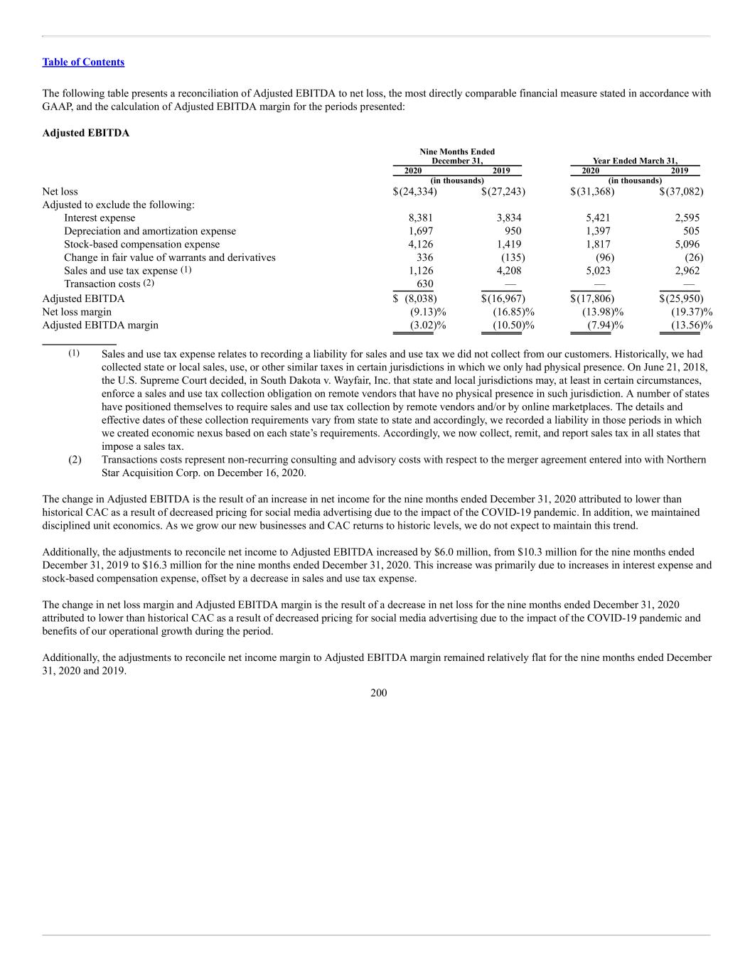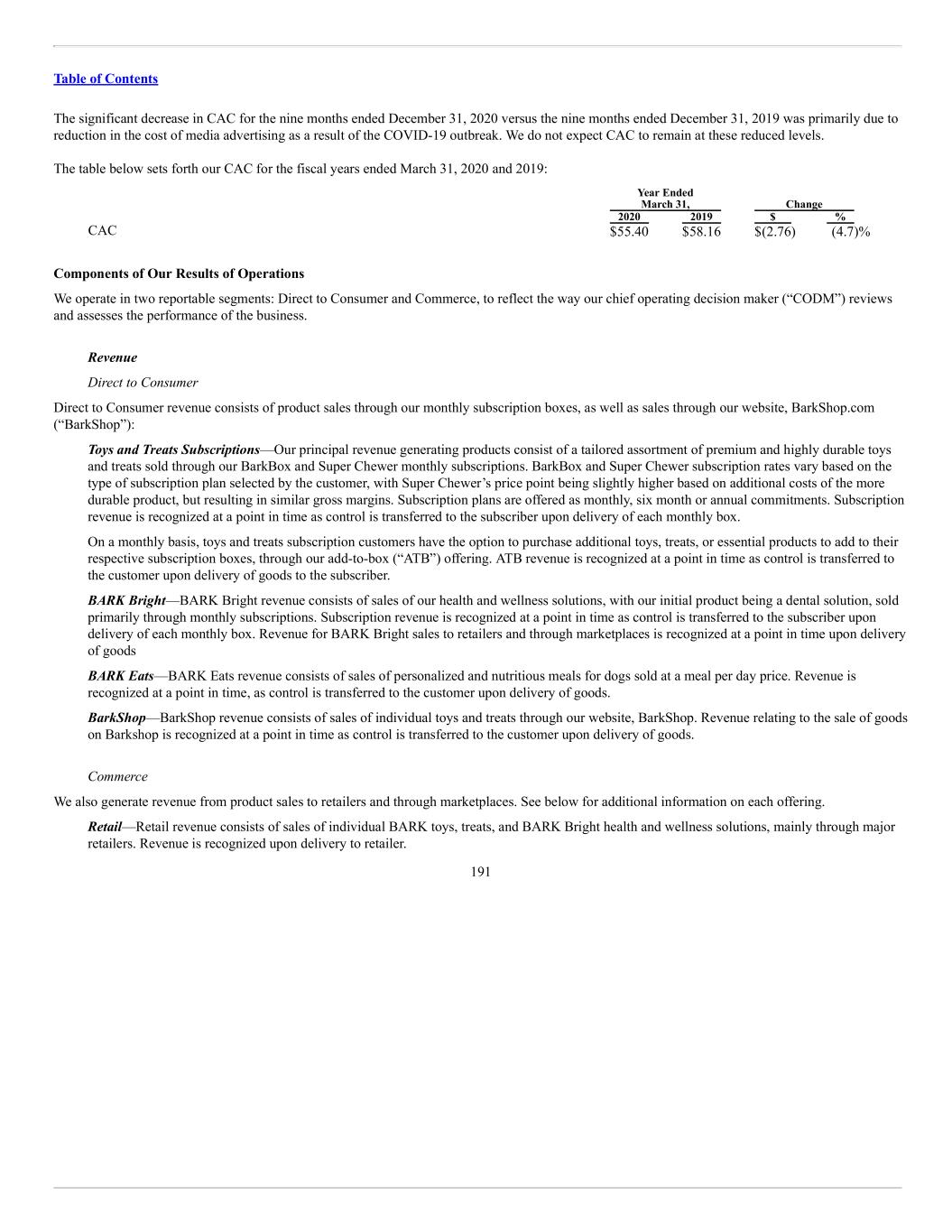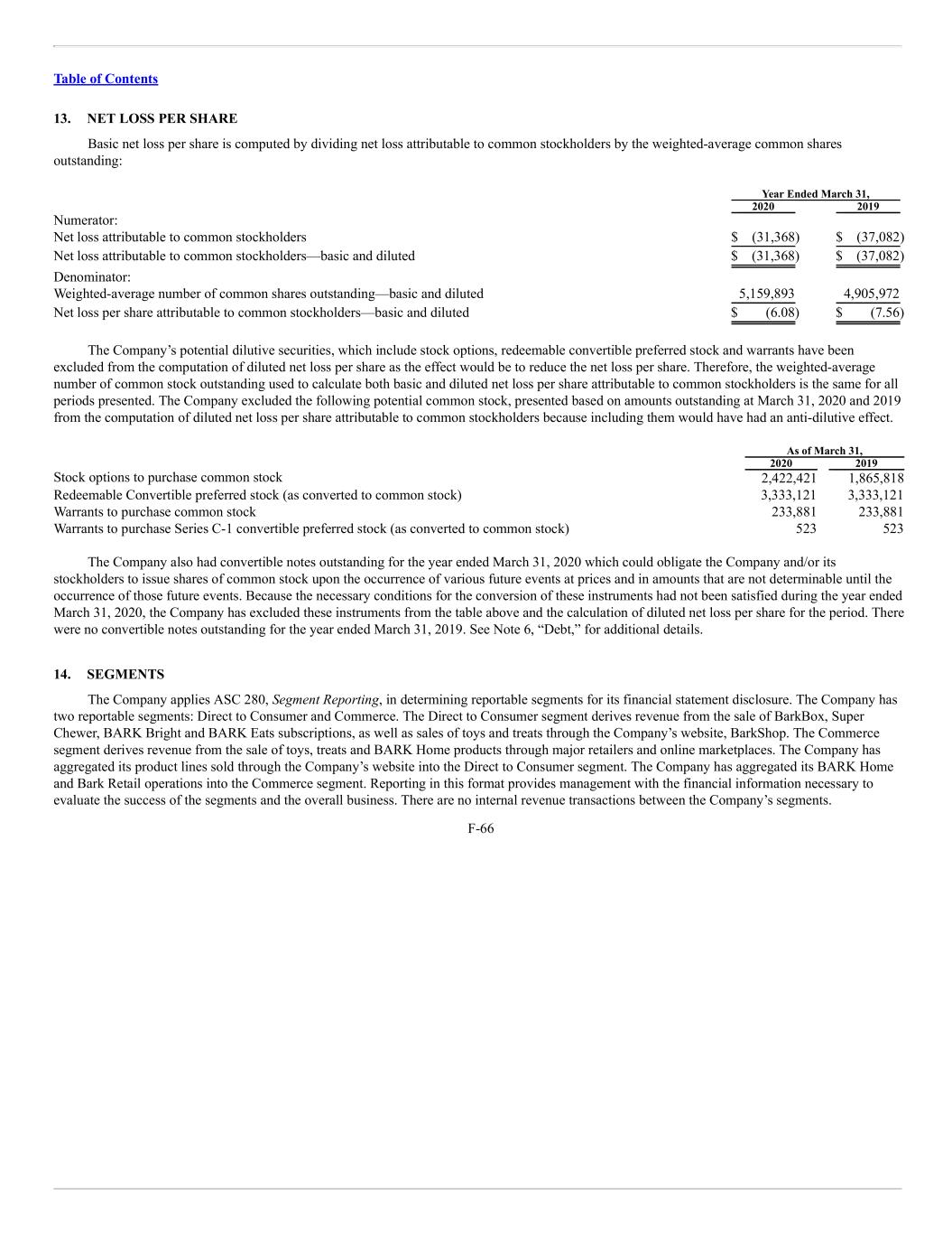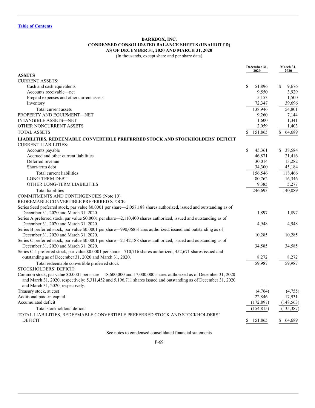 Table of Contents SUMMARY HISTORICAL FINANCIAL INFORMATION OF BARK The following table sets forth summary historical financial information of BARK for the periods and as of the dates indicated. The summary historical financial information of BARK as of and for the years ended March 31, 2020 and 2019 was derived from the audited historical financial statements of BARK included elsewhere in this proxy statement/prospectus. The summary historical interim financial information of BARK as of December 31, 2020, and for the nine months ended December 31, 2020 and 2019 was derived from the unaudited condensed consolidated financial statements of BARK included elsewhere in this proxy statement/prospectus and has been prepared on a consistent basis as the audited consolidated financial statements. In the opinion of BARK’s management, the interim financial statements reflect all adjustments, consisting only of normal recurring adjustments, necessary for the fair statement of the financial information in those statements. The following summary historical financial information should be read together with BARK’s consolidated financial statements and accompanying notes and “BARK’s Management’s Discussion and Analysis of Financial Condition and Results of Operations” appearing elsewhere in this proxy statement/ prospectus. The summary historical financial information in this section is not intended to replace BARK’s financial statements and the related notes. BARK’s historical results are not necessarily indicative of the results that may be expected in the future, and BARK’s results as of and for the nine months ended December 31, 2020, are not necessarily indicative of the results that may be expected for the year ending March 31, 2021, or any other period.        Nine Months Ended  December 31,     Year Ended March 31,        2020     2019     2020     2019        (in thousands, except for  share and per share data)     (in thousands, except for  share and per share data)   Consolidated Statement of Operation Data:          Revenue    $ 266,396    $ 161,664    $ 224,335    $ 191,441  Cost of revenue      108,421      65,058      88,921      84,326                                    Gross profit      157,975      96,606      135,414      107,115  Operating expenses:          Selling, general and administrative      123,882      84,606      115,893      104,146  Advertising and marketing      50,782      35,904      46,147      37,664                                    Total operating expenses      174,664      120,510      162,040      141,810                                    Loss from operations      (16,689)     (23,904)     (26,626)     (34,695)  Interest expense      (8,381)     (3,834)     (5,421)     (2,595)  Other income, net      736      495      679      208                                    Net loss before income taxes      (24,334)     (27,243)     (31,368)     (37,082)  Provision for income tax      —          —          —          —                                        Net loss and comprehensive loss    $ (24,334)   $ (27,243)   $ (31,368)   $ (37,082)                                    Net loss per common share attributable to common stockholders— basic and diluted    $ (4.64)   $ (5.29)   $ (6.08)   $ (7.56)                                    Weighted average common shares used to compute net loss per share attributable to common stockholders—basic and diluted      5,246,530      5,148,584      5,159,893      4,905,972                                      33